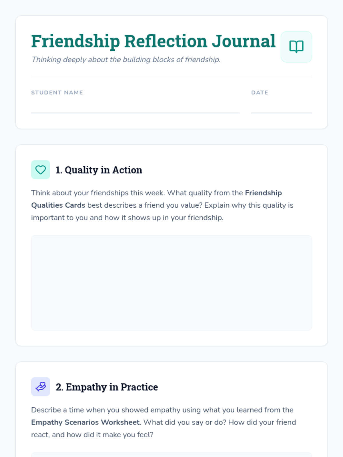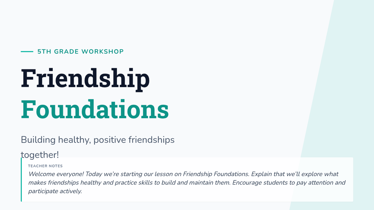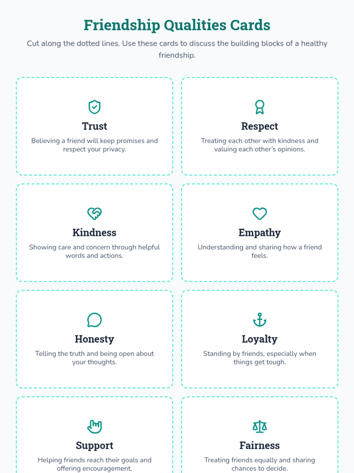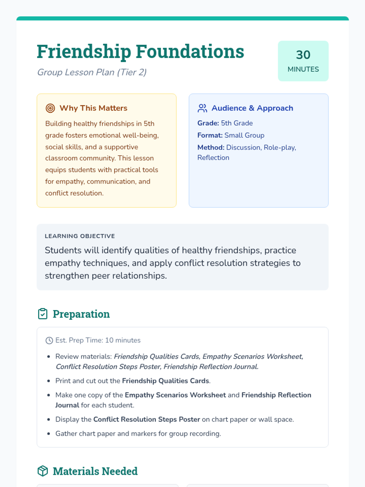 A 30-minute small-group lesson for 5th graders to explore healthy friendship qualities, practice empathy, and learn conflict resolution strategies.