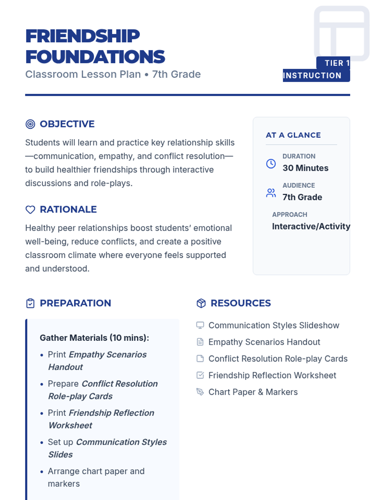 A 30-minute Tier 1 classroom lesson for 7th graders focused on communication, empathy, and conflict resolution to build stronger, healthier friendships.