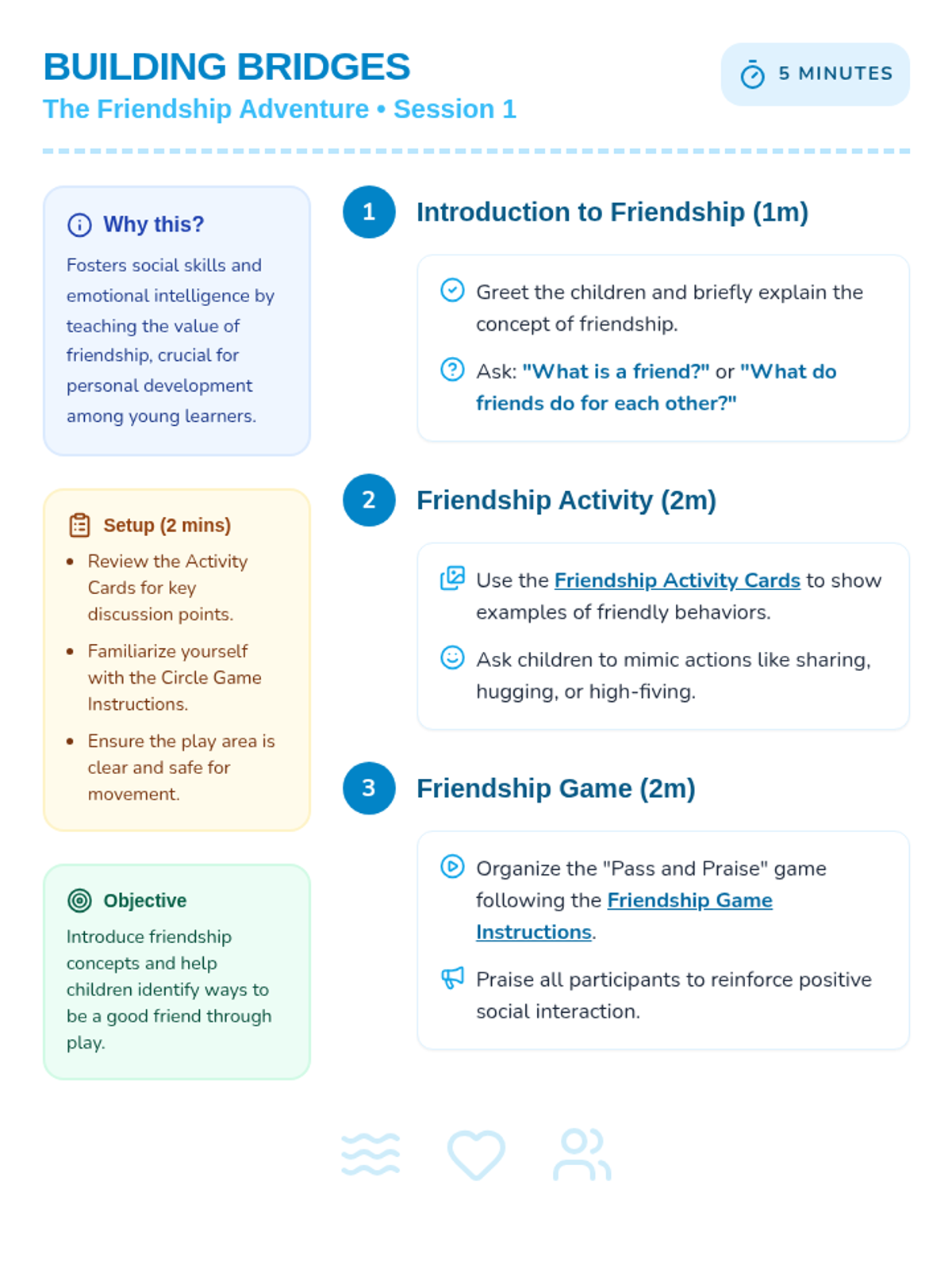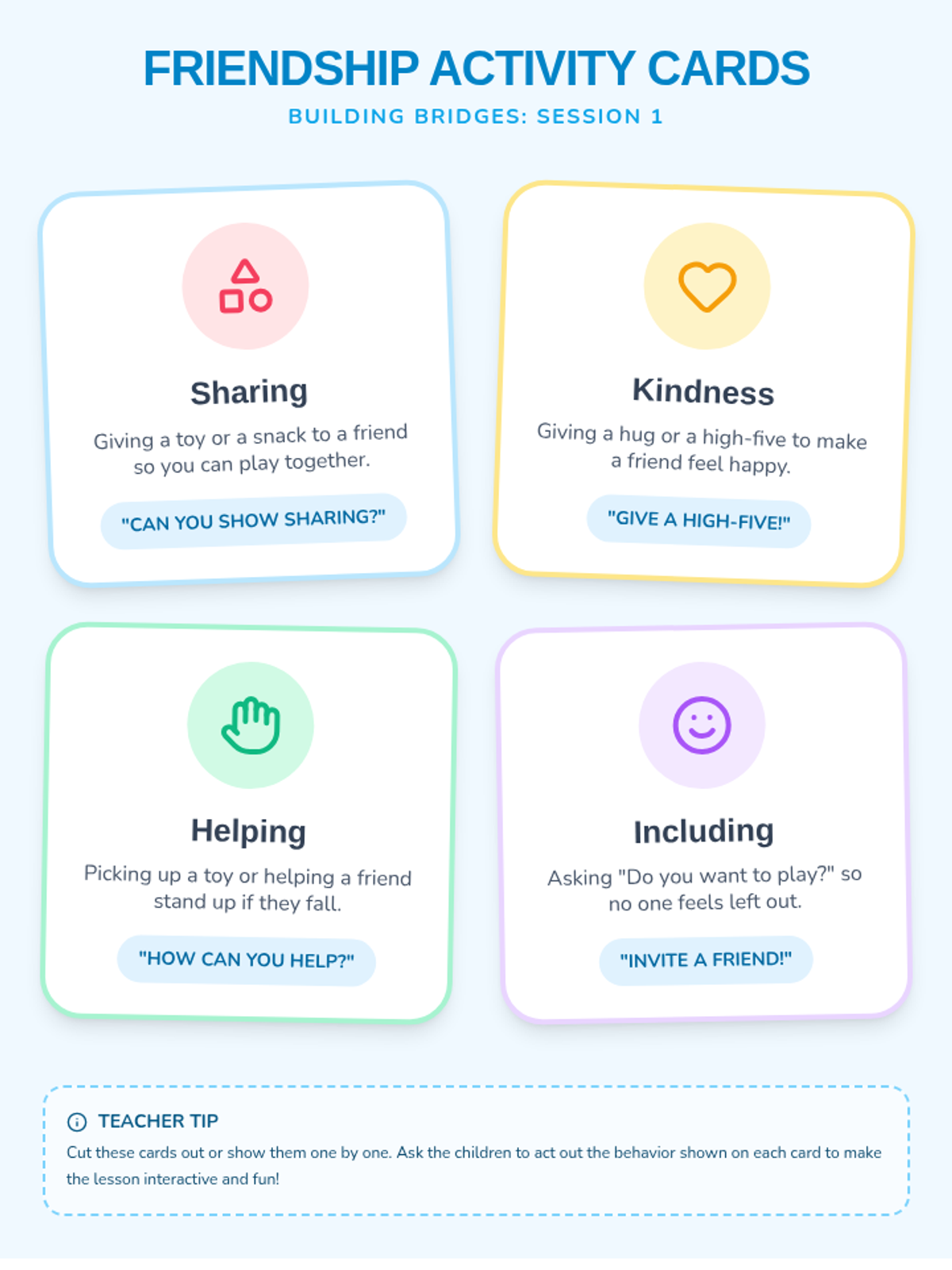 Introduces basic friendship concepts using visual activity cards and a group ball-passing game.