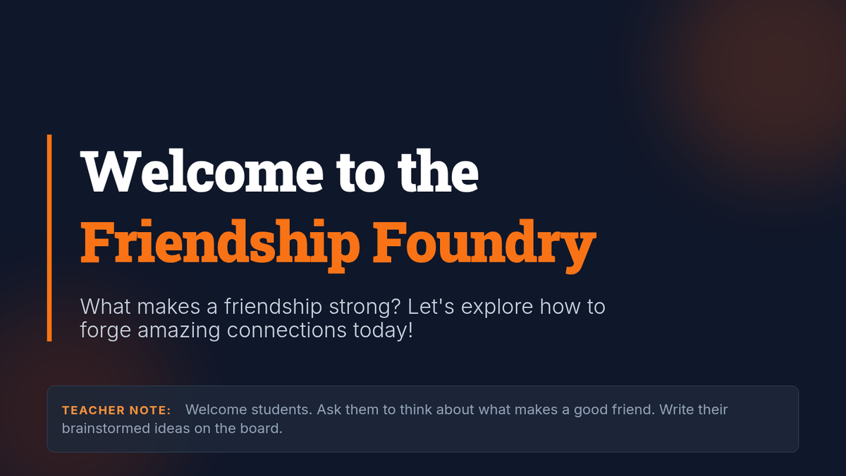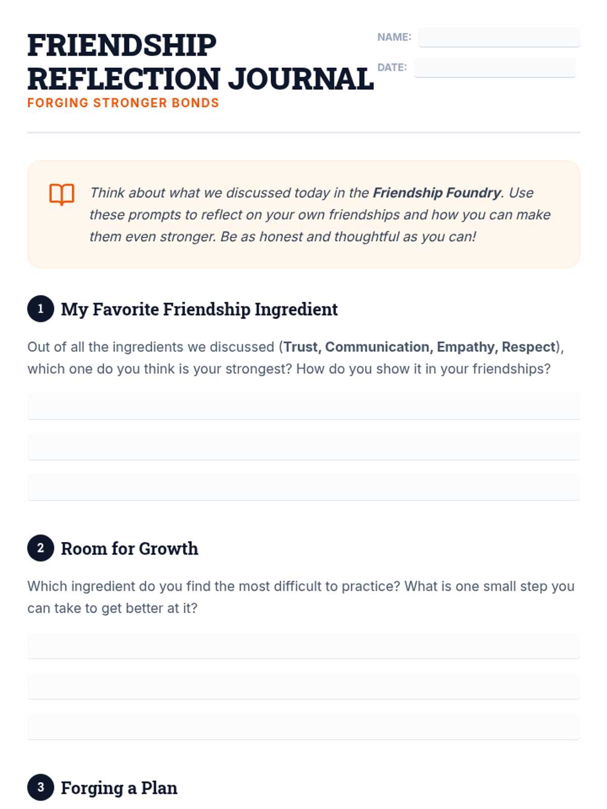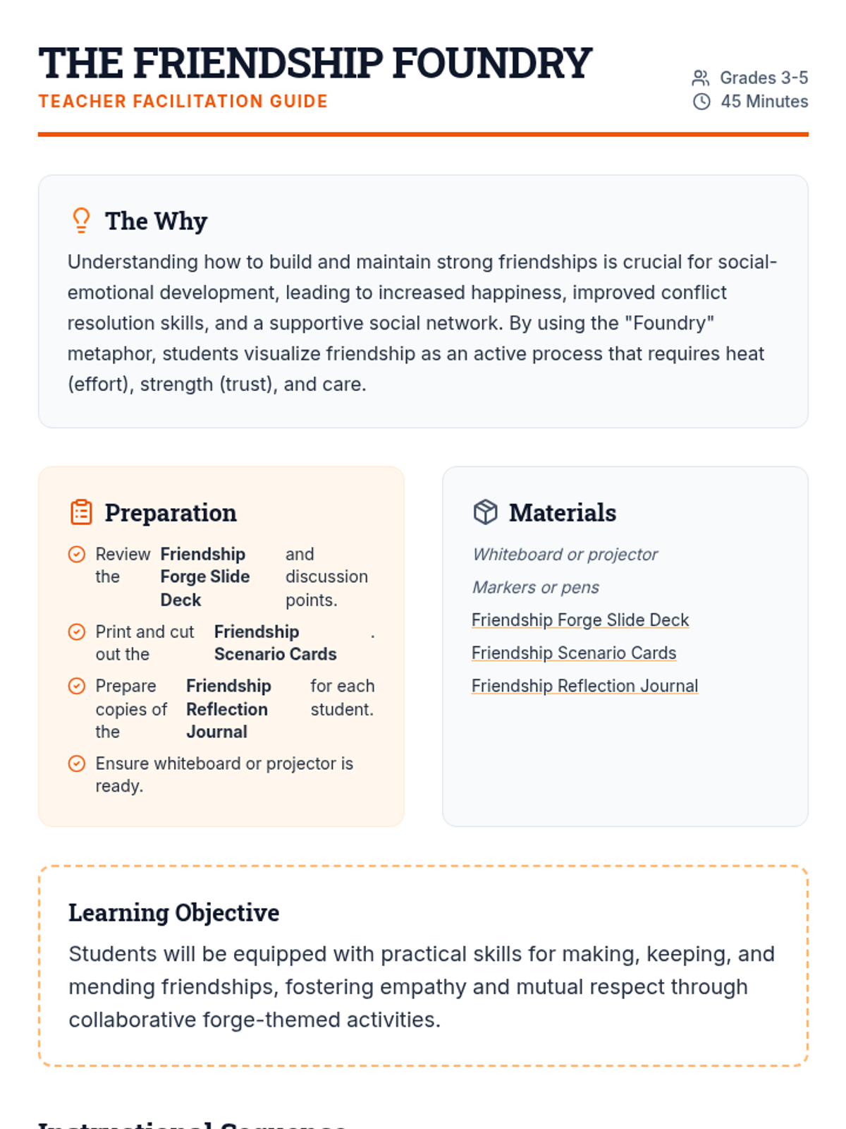 A social-emotional learning lesson for 3rd-5th graders focused on building, maintaining, and mending friendships using the metaphor of a foundry. Students will explore key ingredients like trust, communication, empathy, and respect.