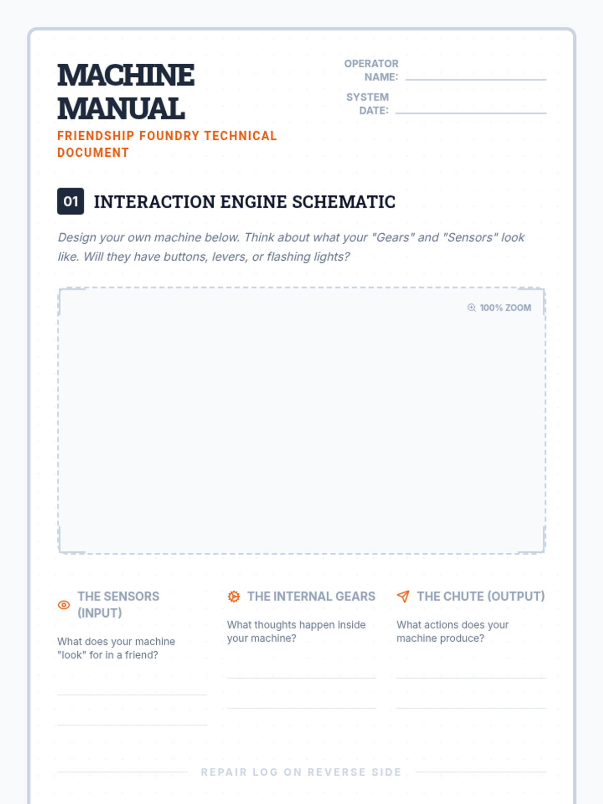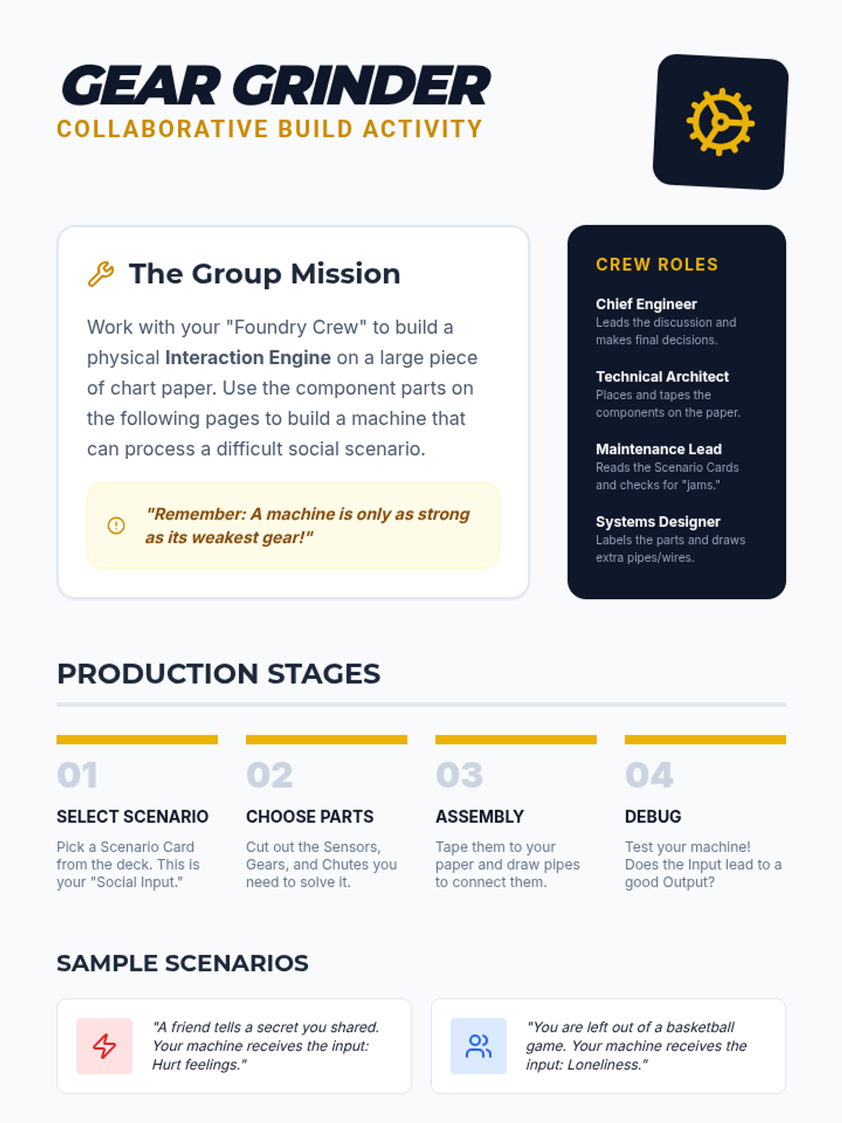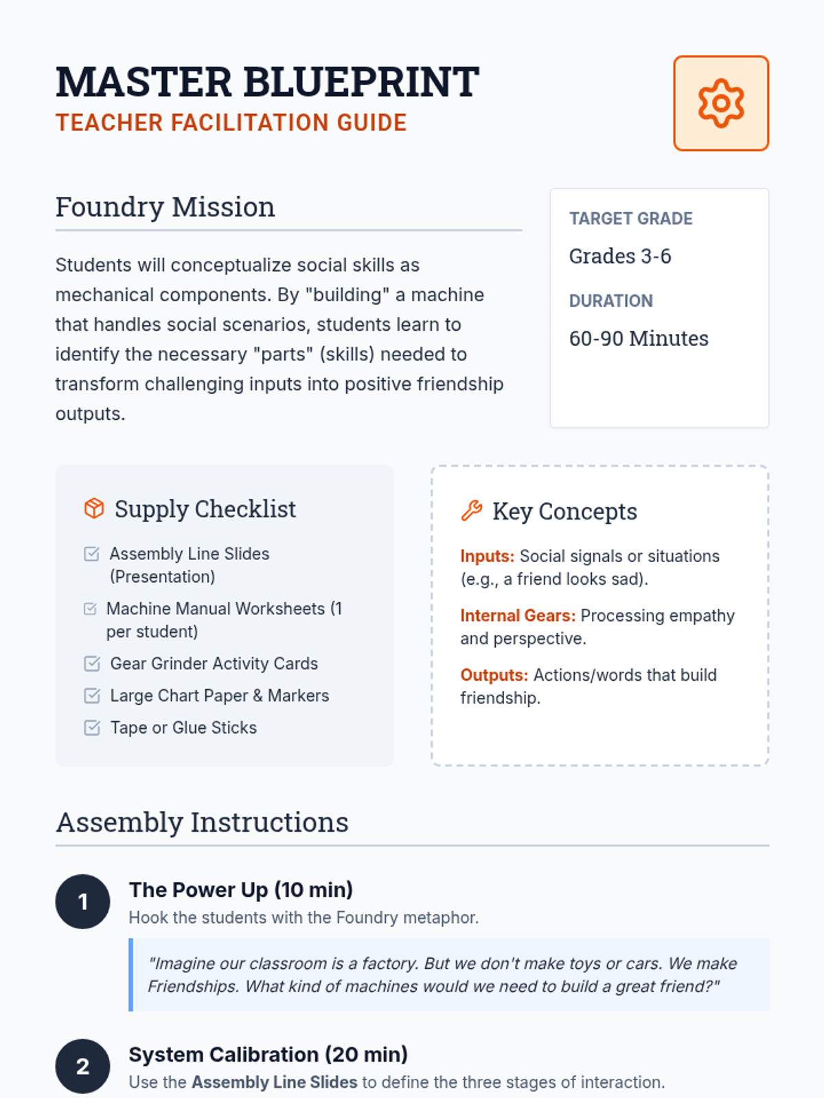 A social skills lesson for grades 3-6 that uses industrial metaphors to help students visualize and build positive peer interactions. Students design 'friendship machines' to understand how social inputs like empathy and listening lead to positive outcomes.
