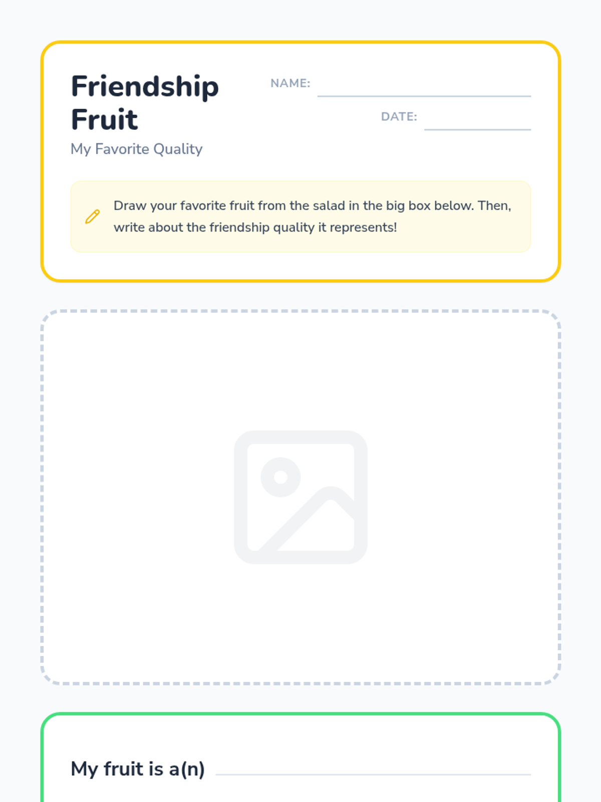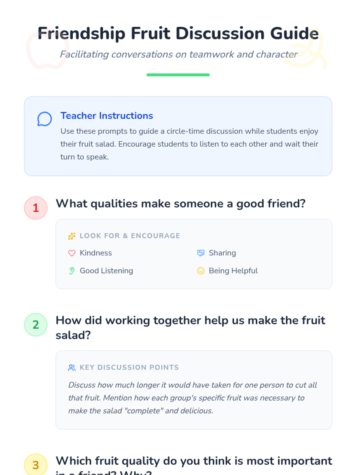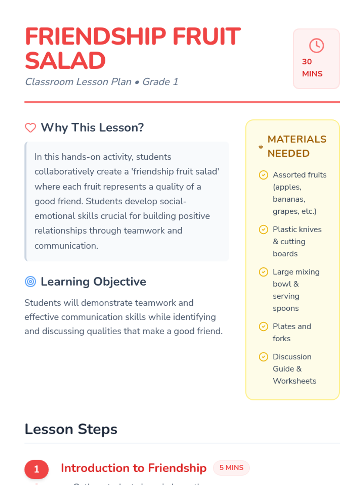 A social-emotional learning lesson for 1st graders where students collaboratively create a fruit salad. Each fruit represents a different friendship quality, emphasizing teamwork and the appreciation of diverse traits in others.