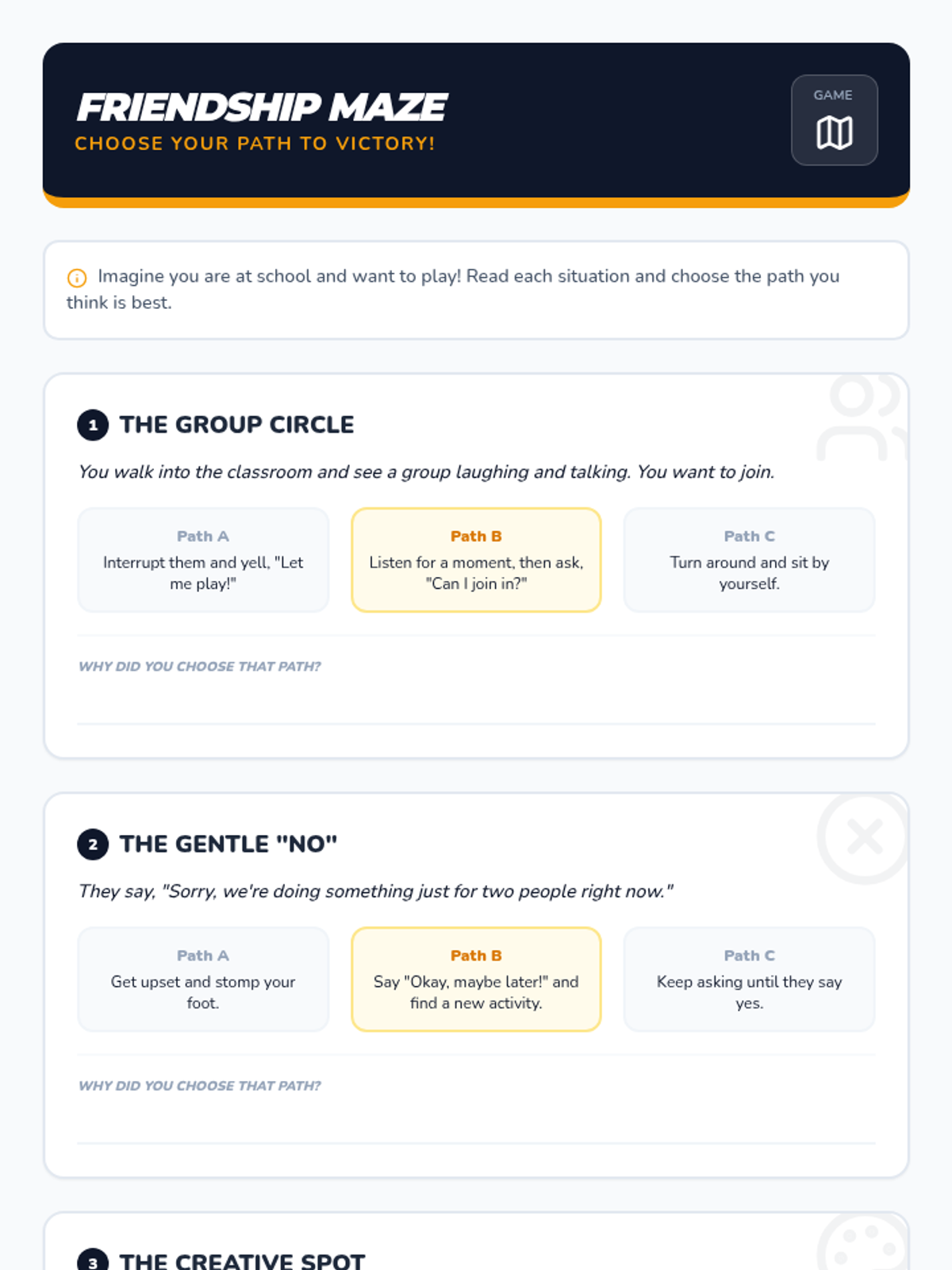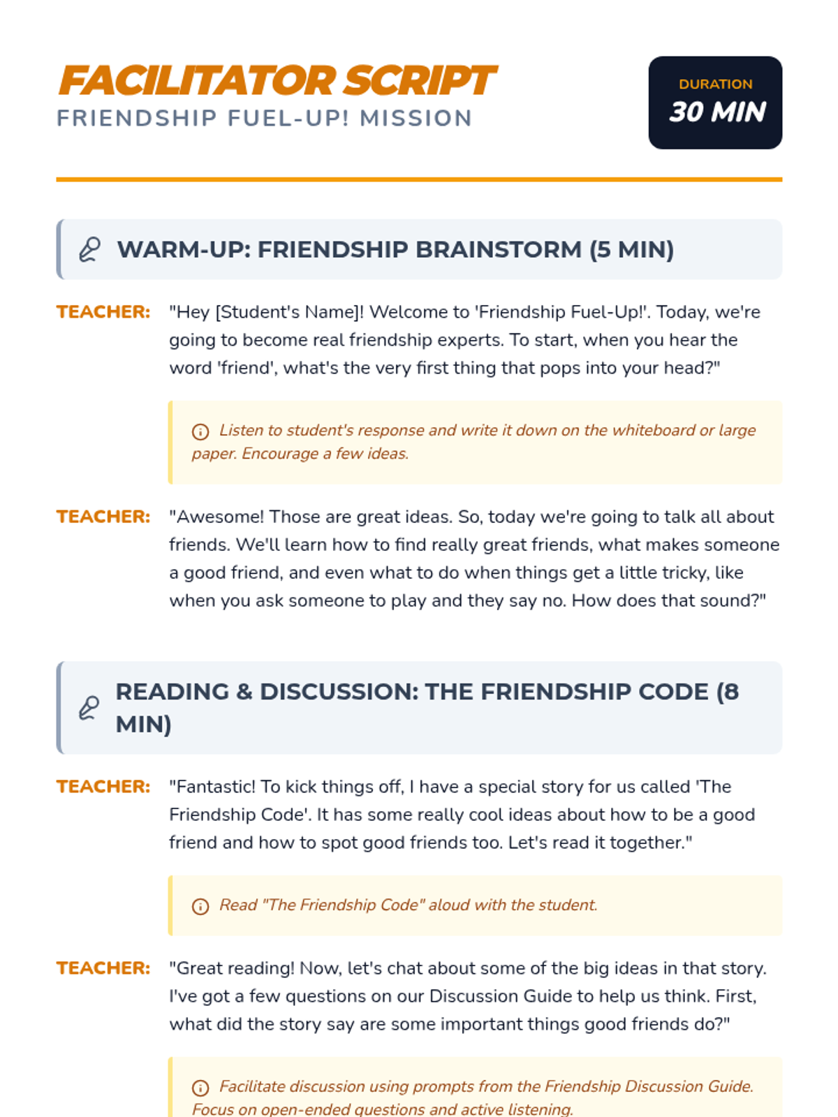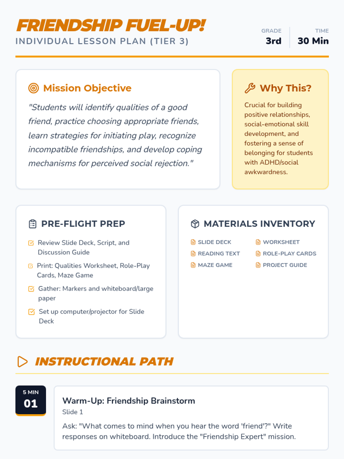 A 30-minute Tier 3 individual lesson for 3rd graders focusing on social skills, identifying good friendship qualities, and navigating social challenges through a fun 'pit stop' theme.