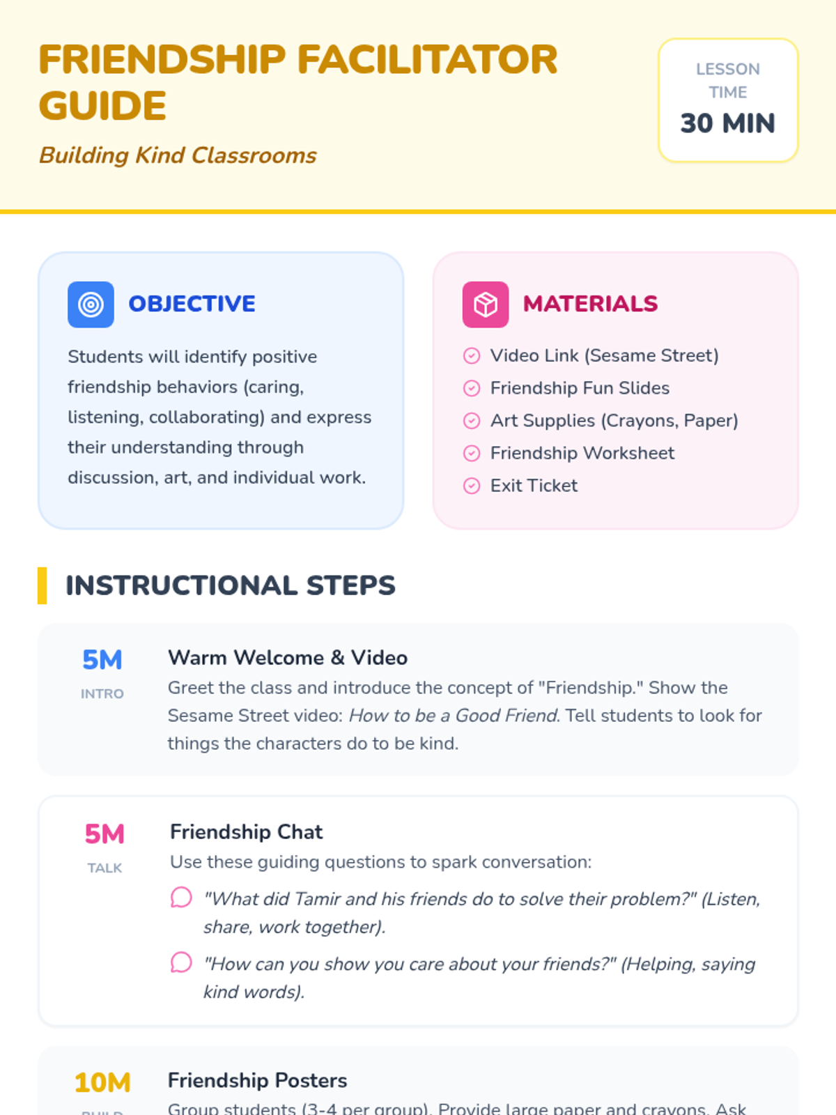 This lesson introduces kindergarten students to the concept of being a good friend through engaging activities and discussions. Students learn about caring, listening, and collaboration using a Sesame Street video and creative group work.