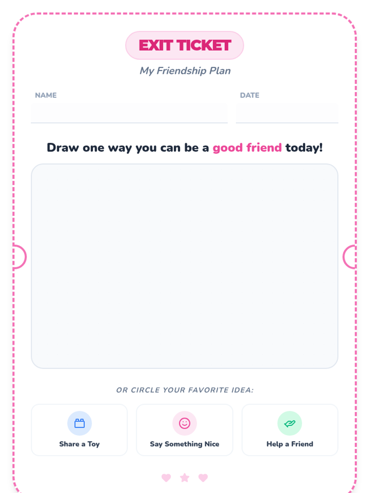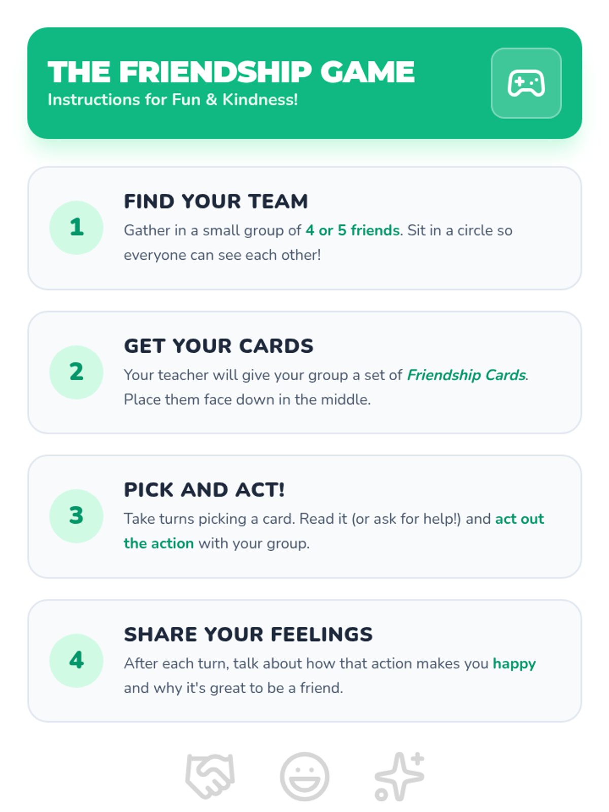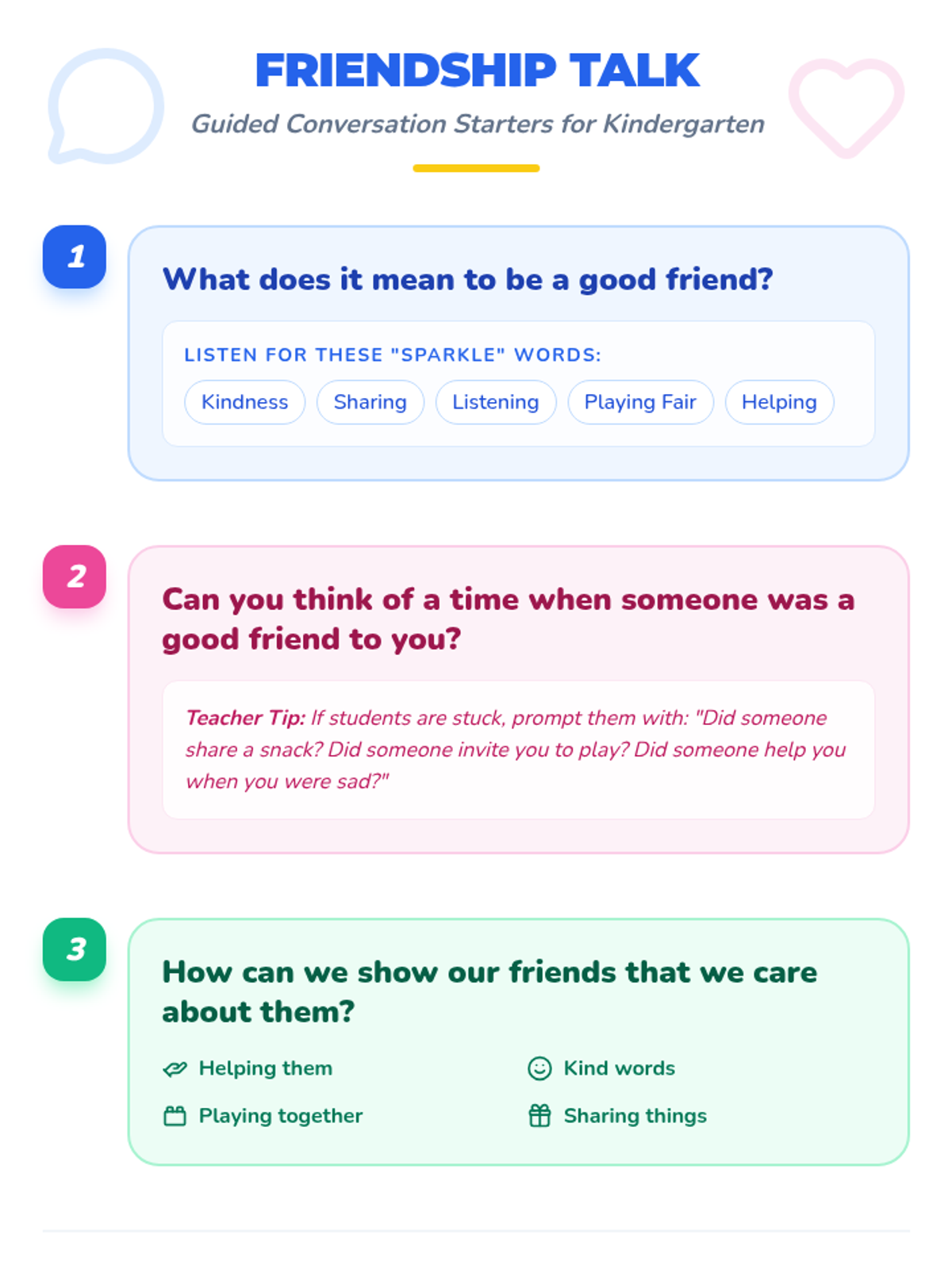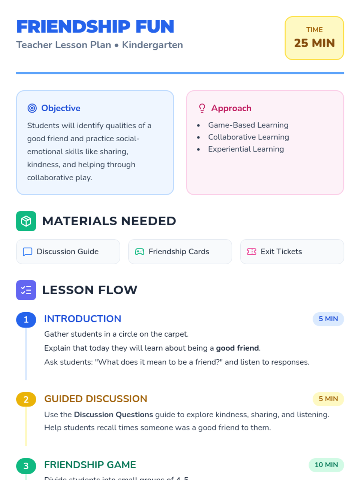 A 25-minute lesson for kindergarten students exploring the qualities of a good friend through discussion, a collaborative game, and creative reflection.
