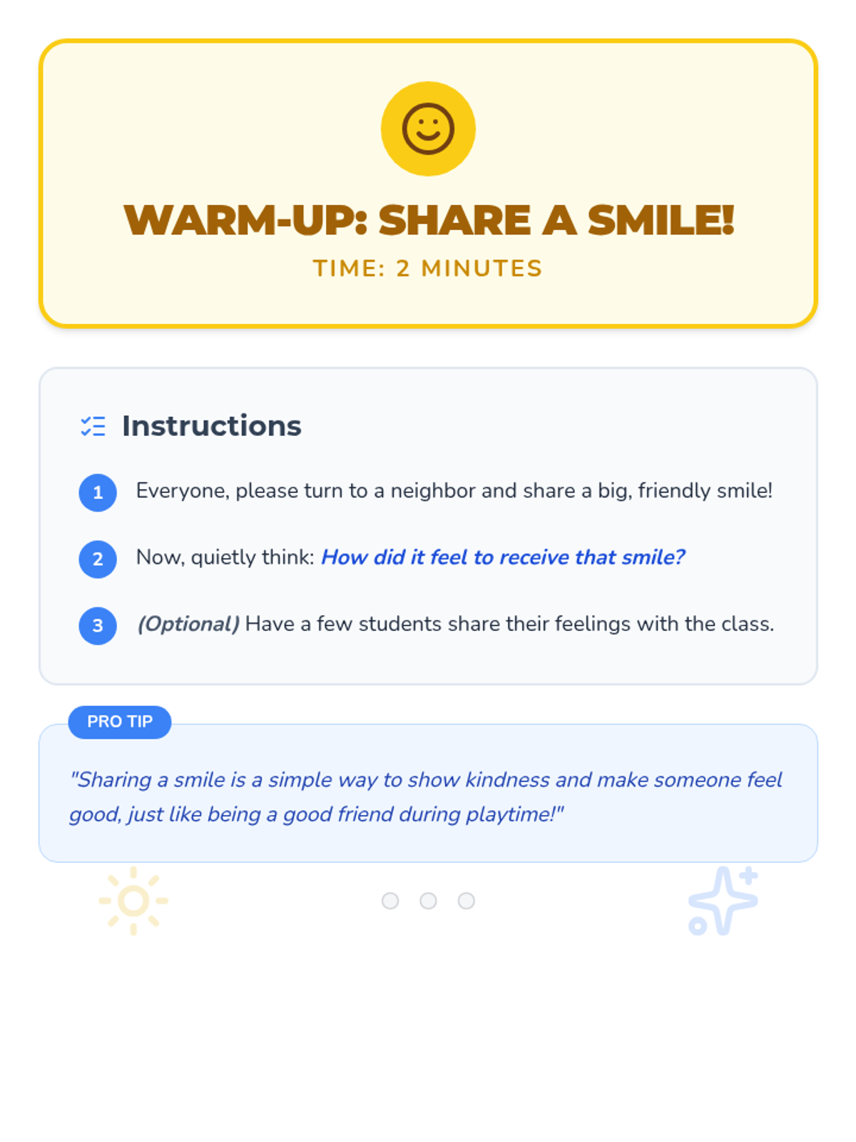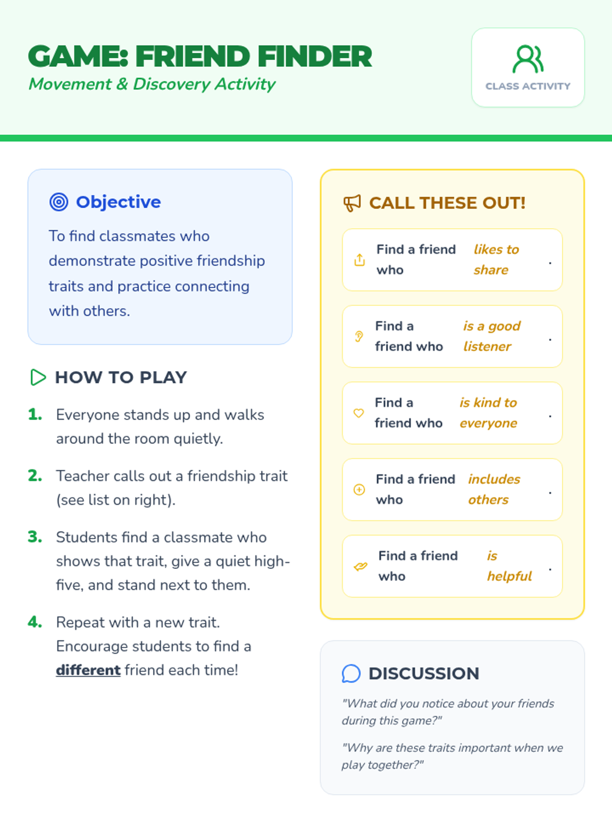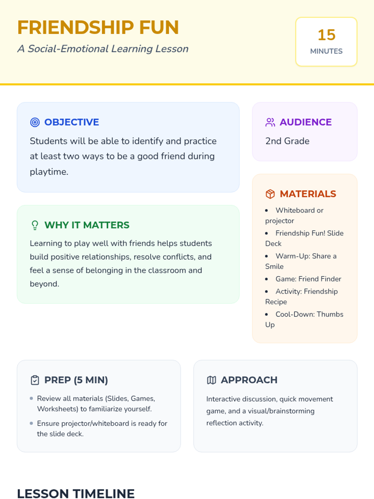 This 15-minute lesson for 2nd graders focuses on the importance of playing well with friends and understanding different ways to be a good friend. It helps students develop essential social skills for positive interactions.