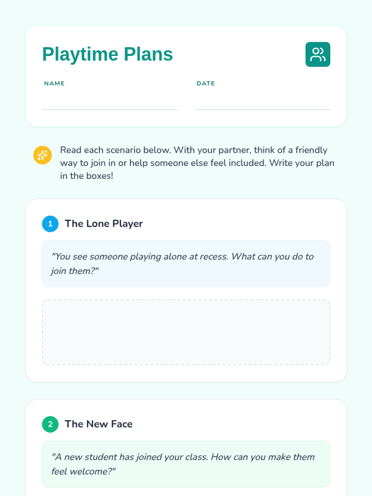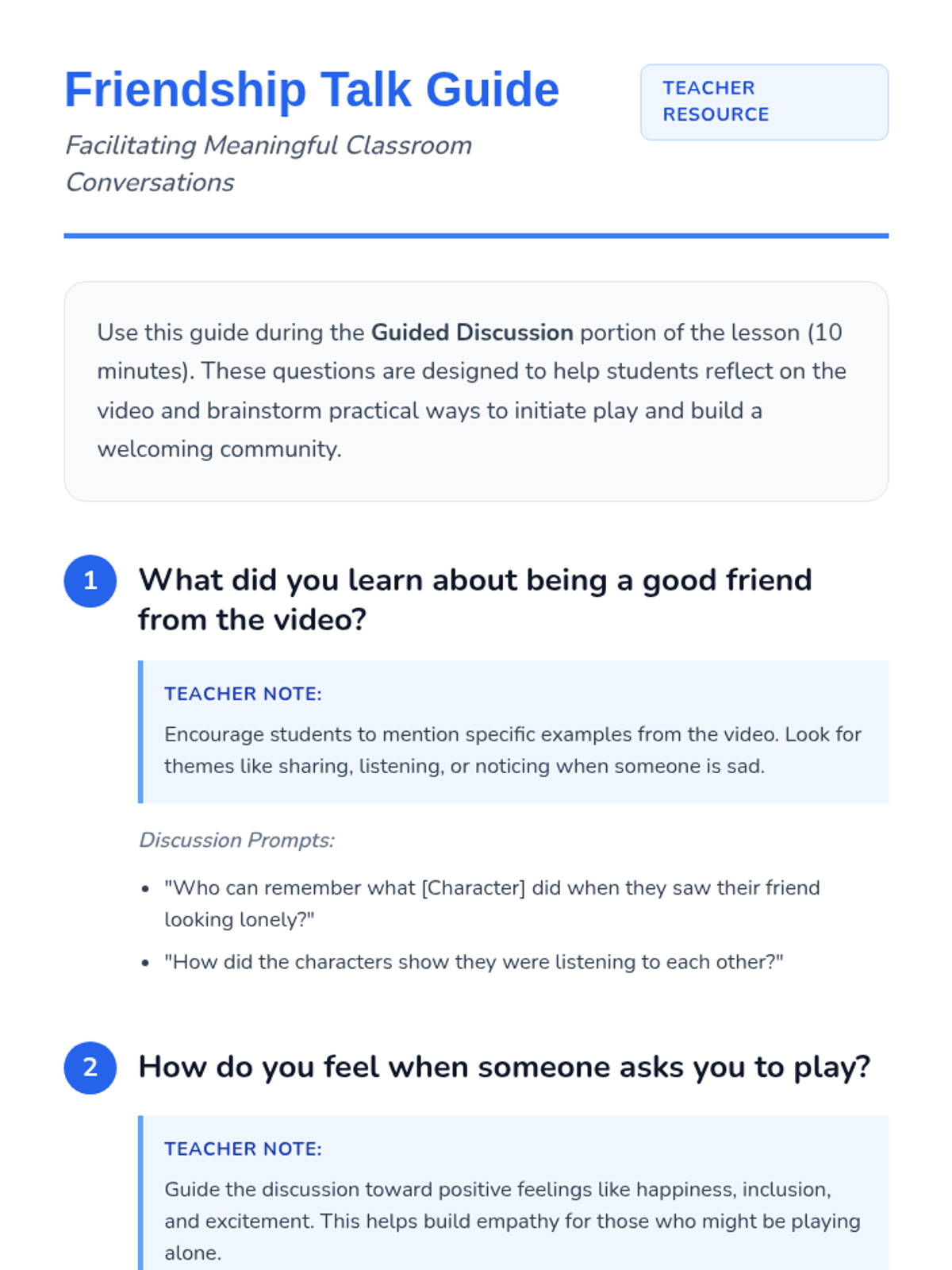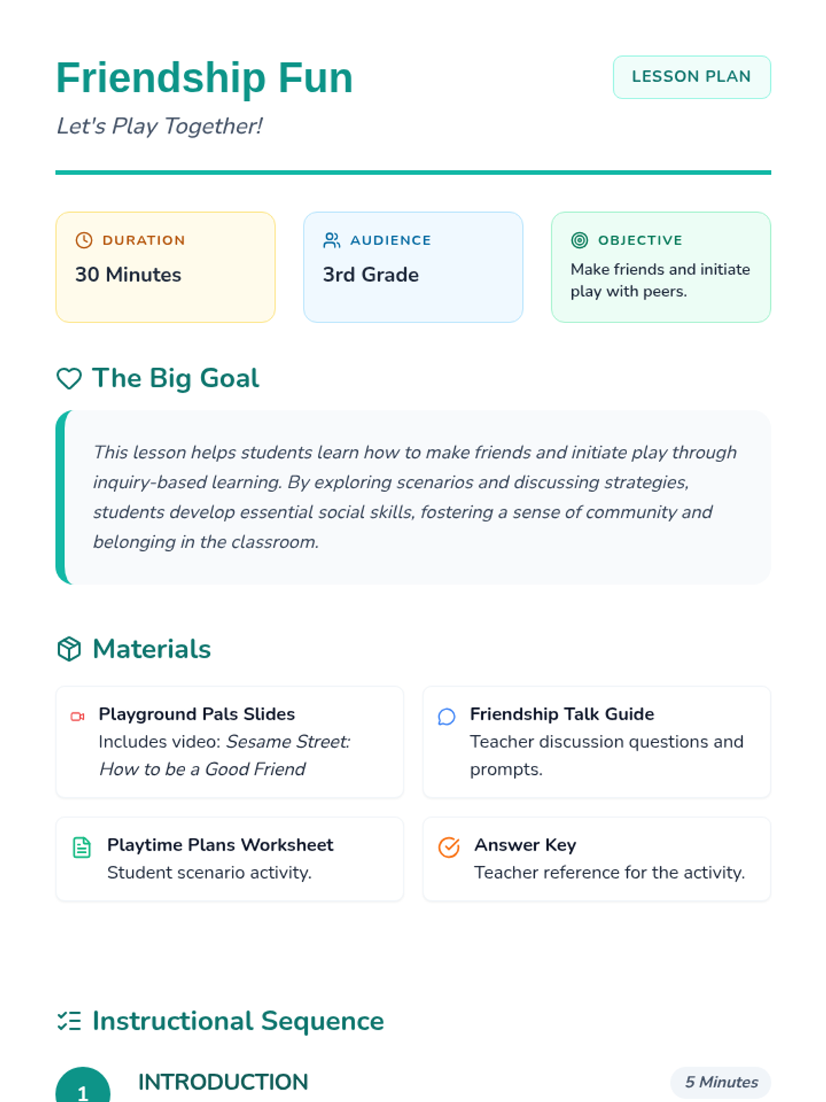 This lesson helps 3rd-grade students develop social skills for making friends and initiating play through inquiry-based scenarios and discussion. Students explore what it means to be a good friend and practice strategies for inclusive play.
