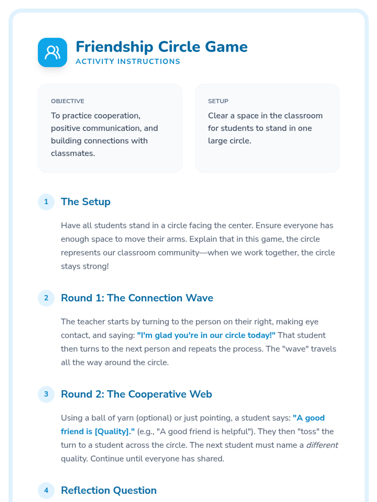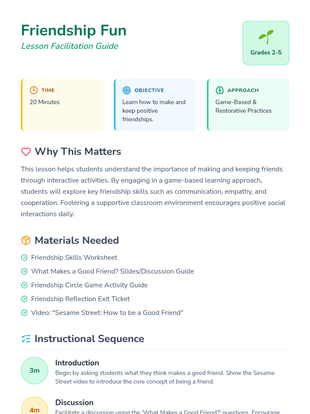 A game-based lesson for Grades 2-5 focused on the essential skills of making and keeping friends through communication, empathy, and cooperation.