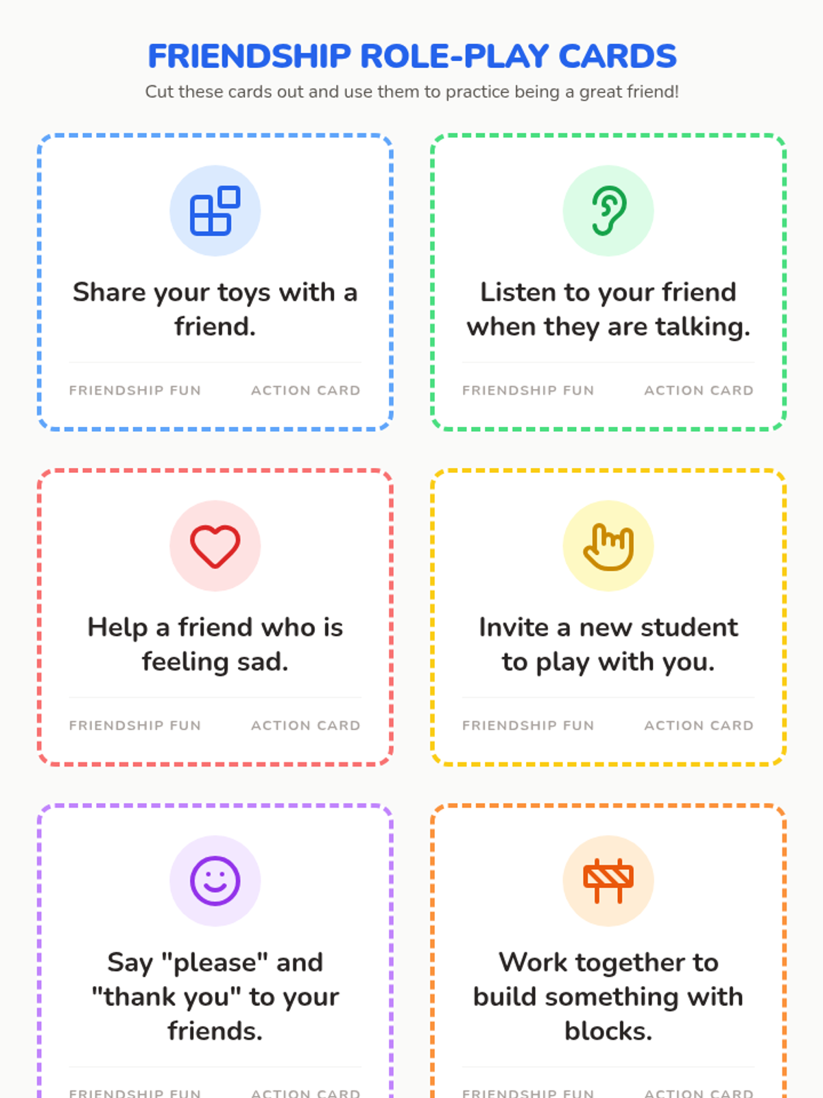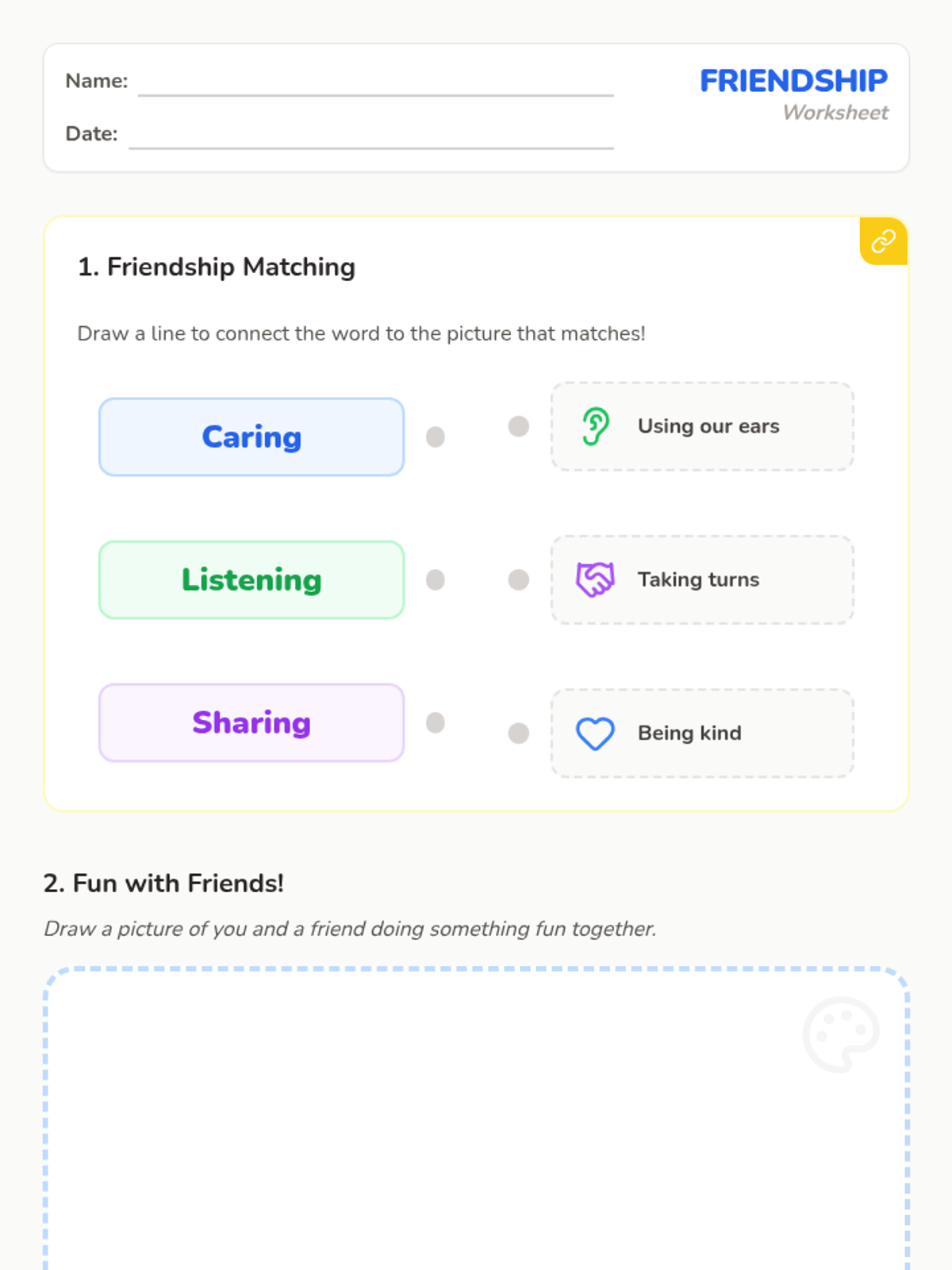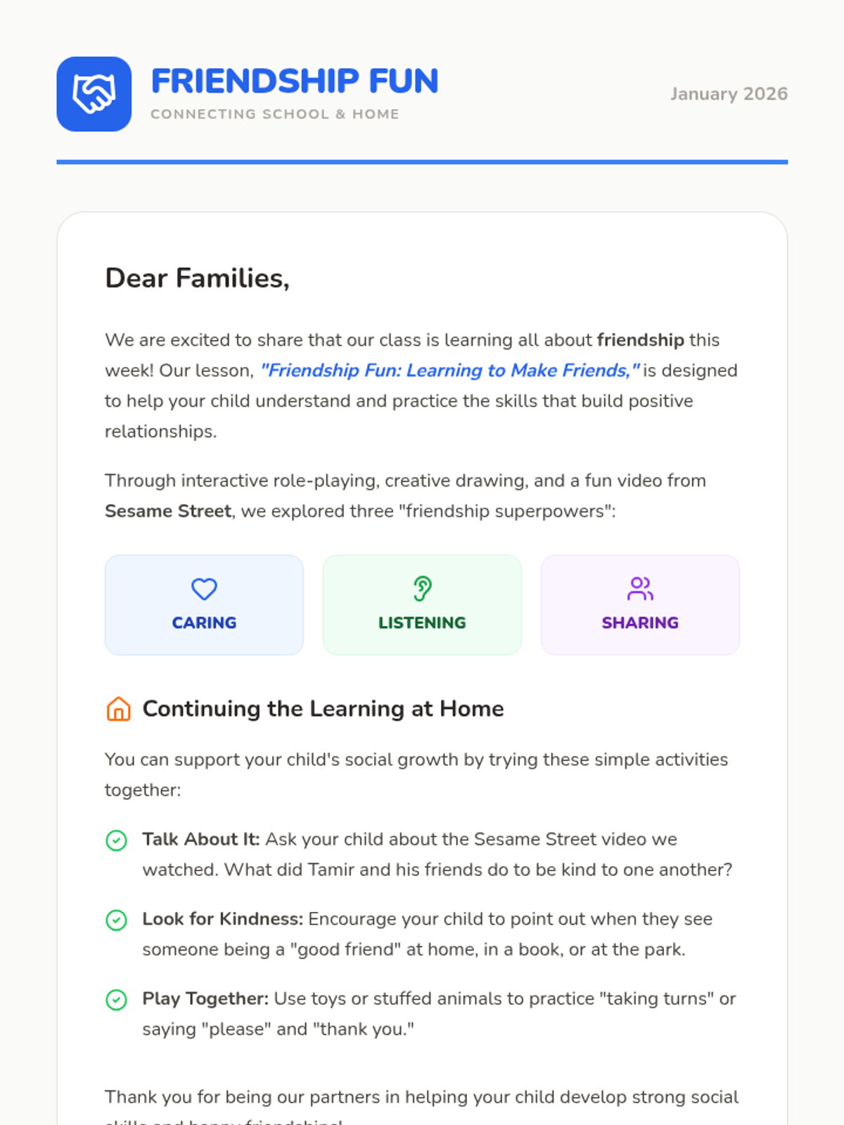 This interactive lesson helps 5-year-olds understand and practice friendship skills like caring, listening, and sharing through a Sesame Street video, role-play, and creative reflection.