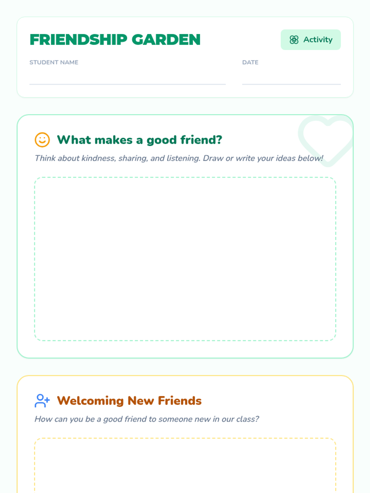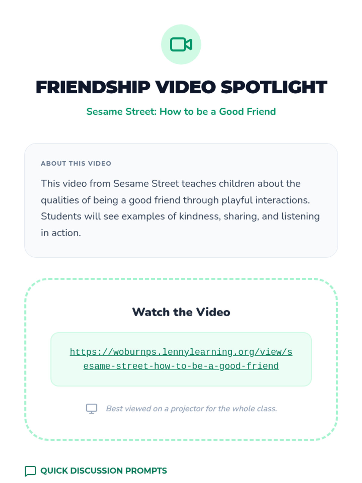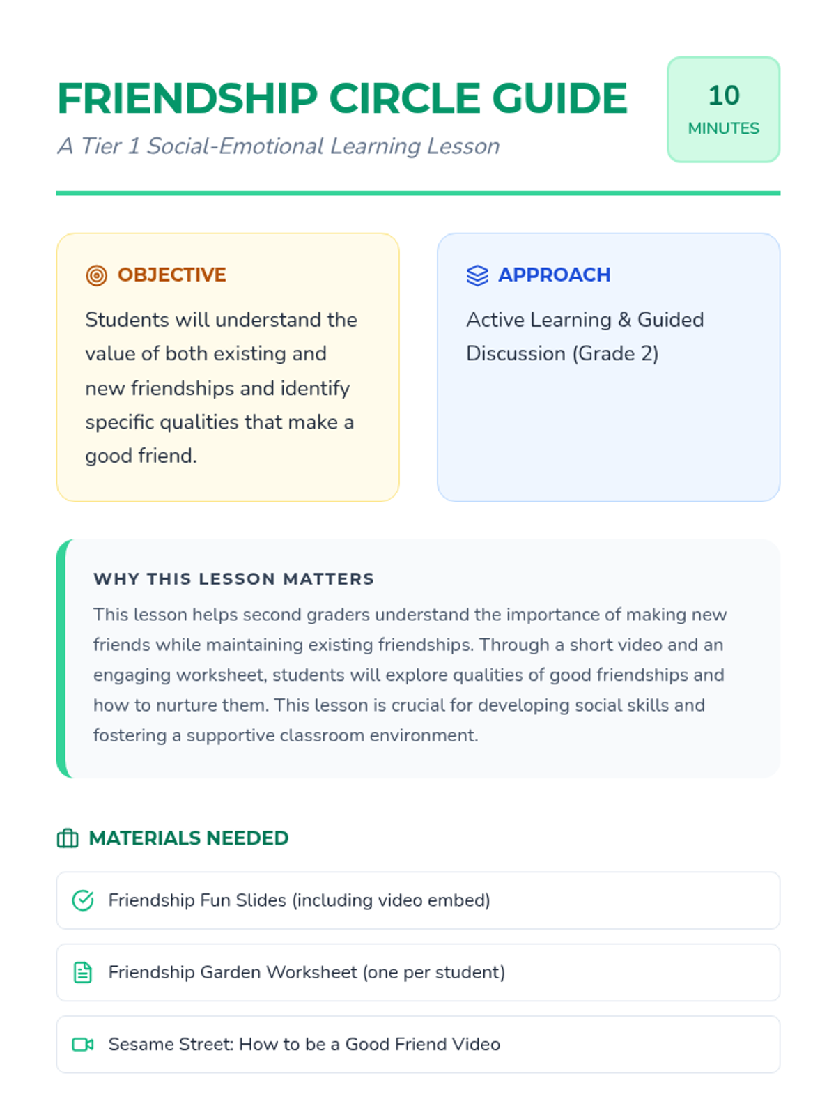 A 10-minute lesson for second graders exploring how to nurture old friendships and build new ones through discussion, video, and creative reflection.