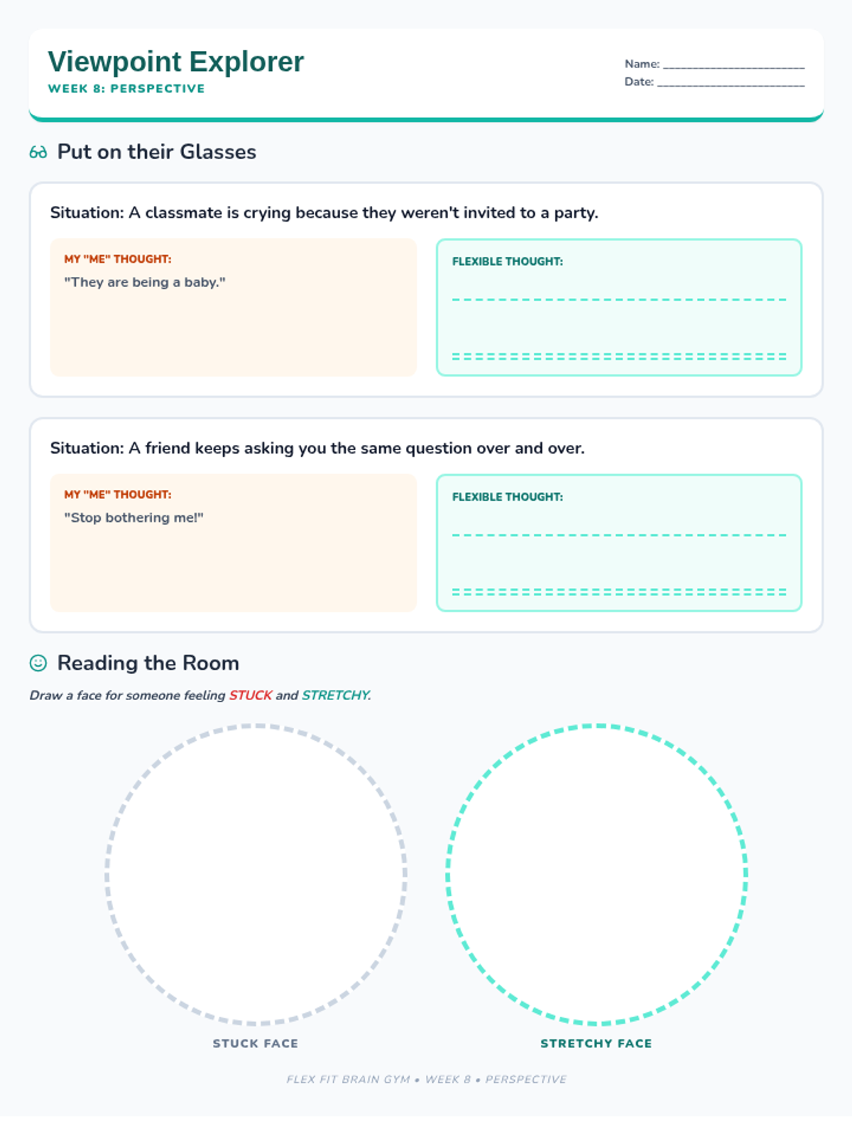 Focuses on perspective-taking as a form of flexibility—seeing a situation through someone else's 'glasses'.