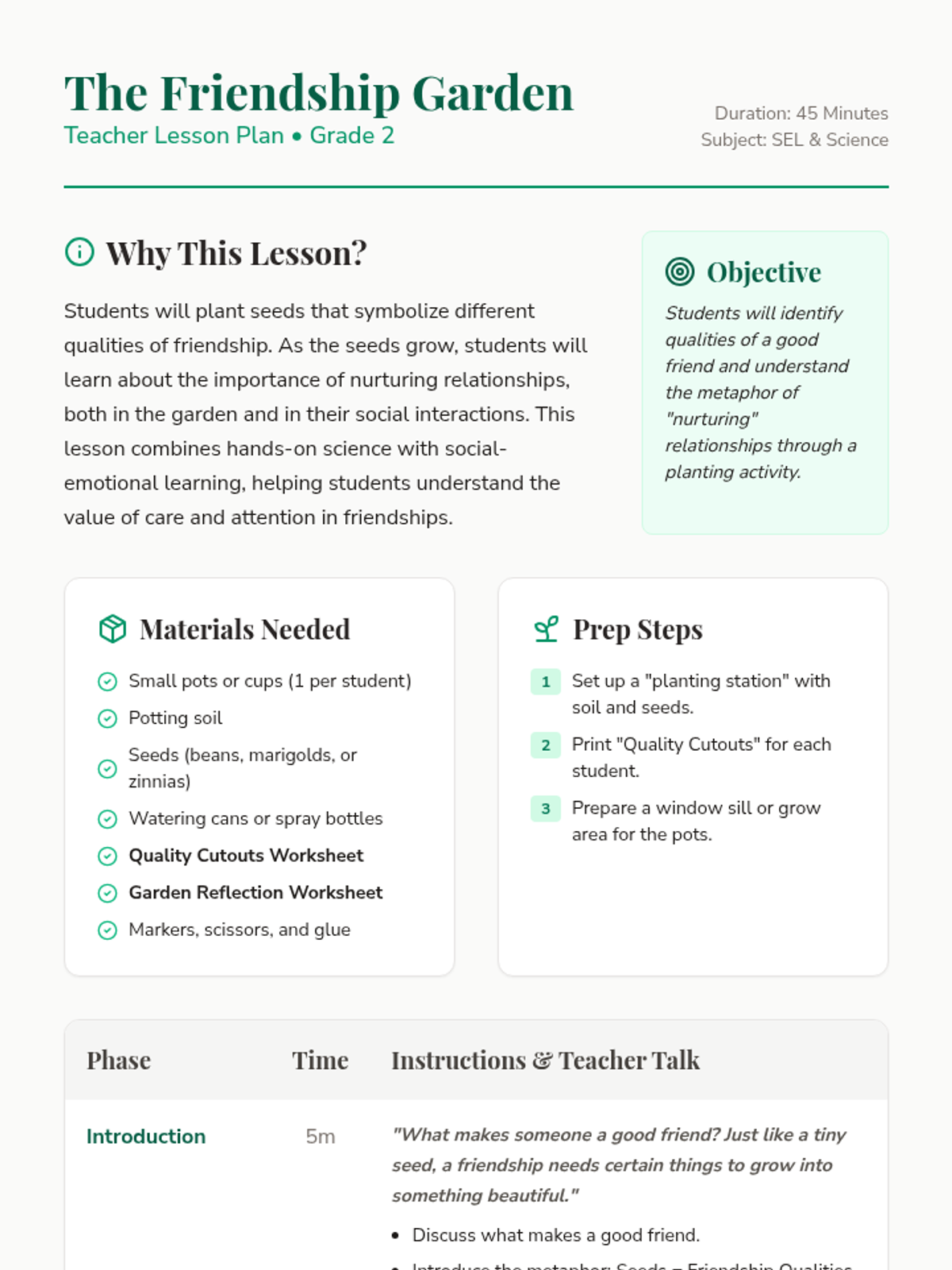 A lesson combining hands-on gardening with social-emotional learning, where 2nd-grade students plant seeds to symbolize friendship qualities and learn how to nurture relationships.