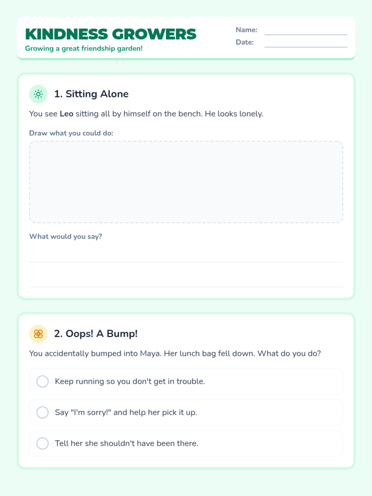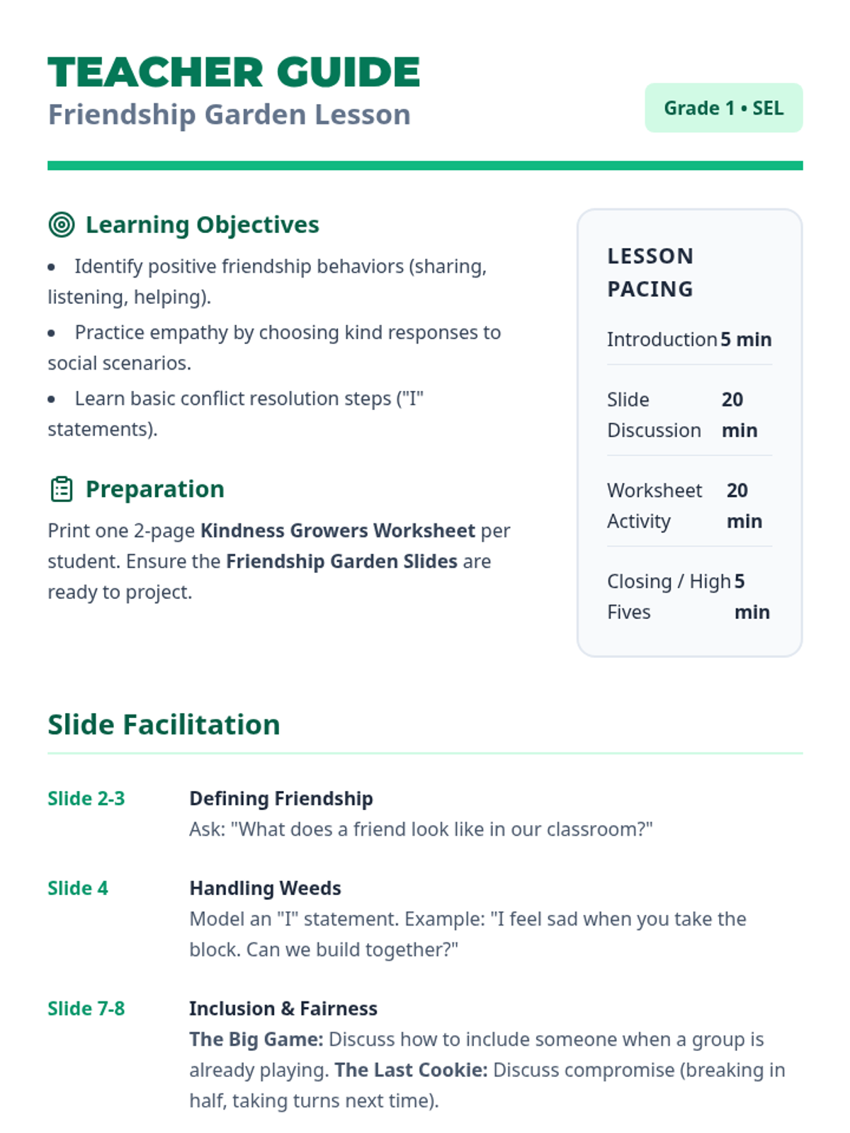 A social-emotional learning lesson for 1st graders focused on building positive friendships, practicing kindness, and navigating common social scenarios using a "Friendship Garden" metaphor.