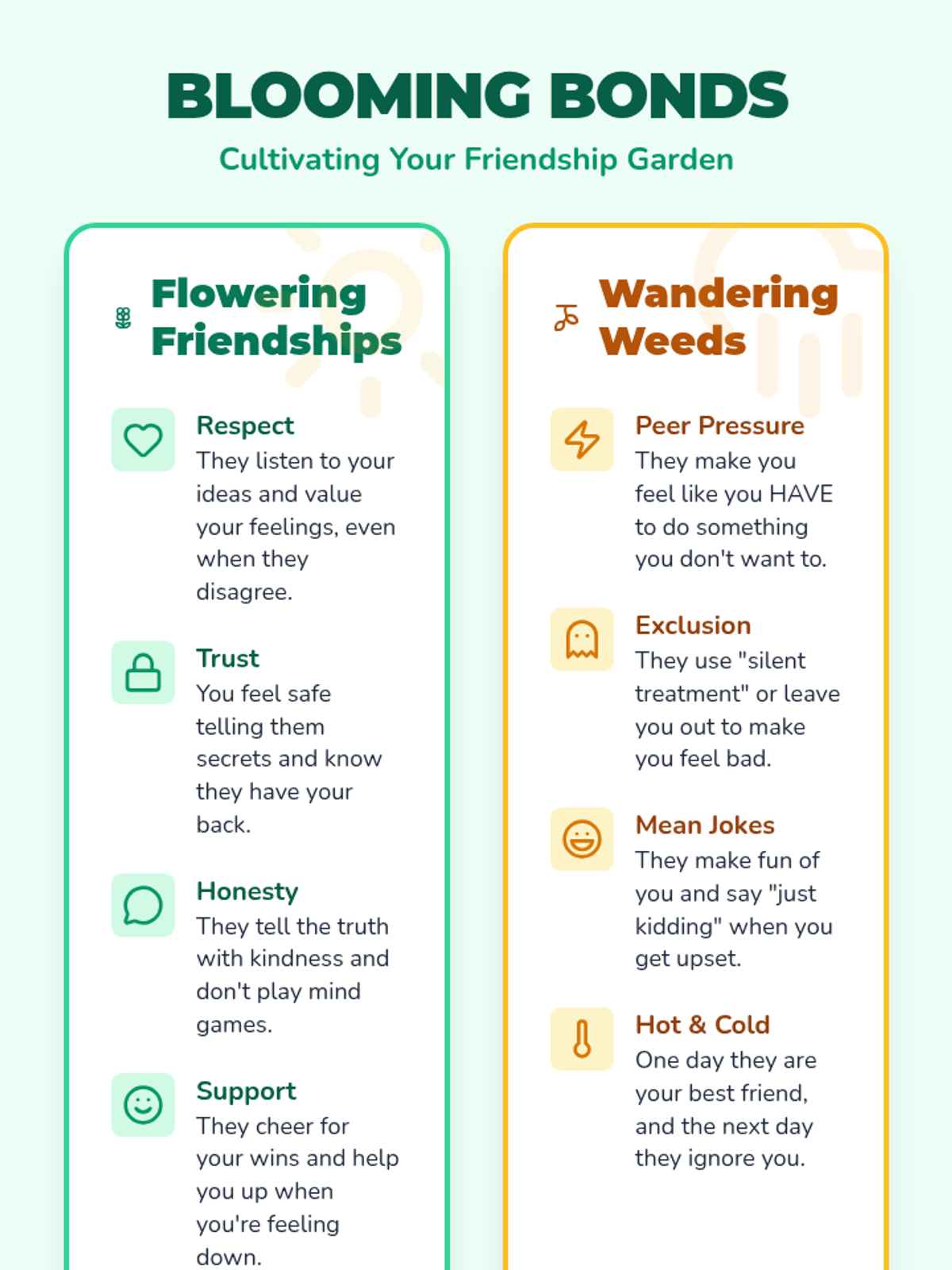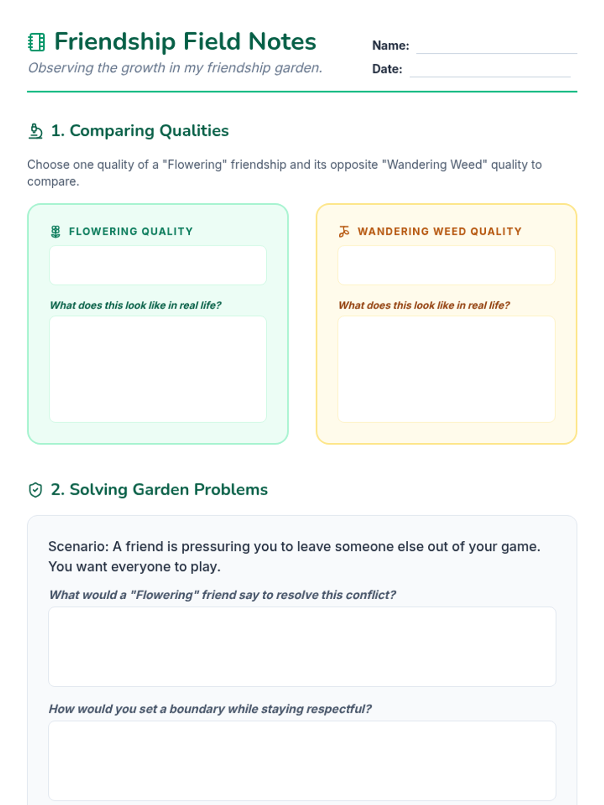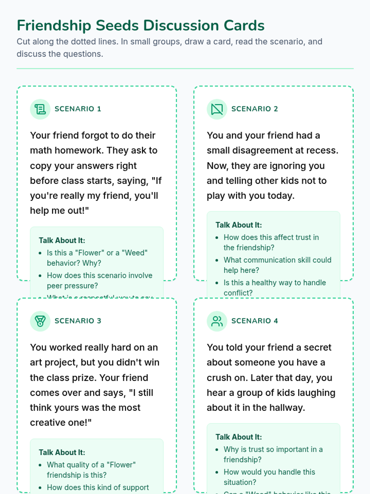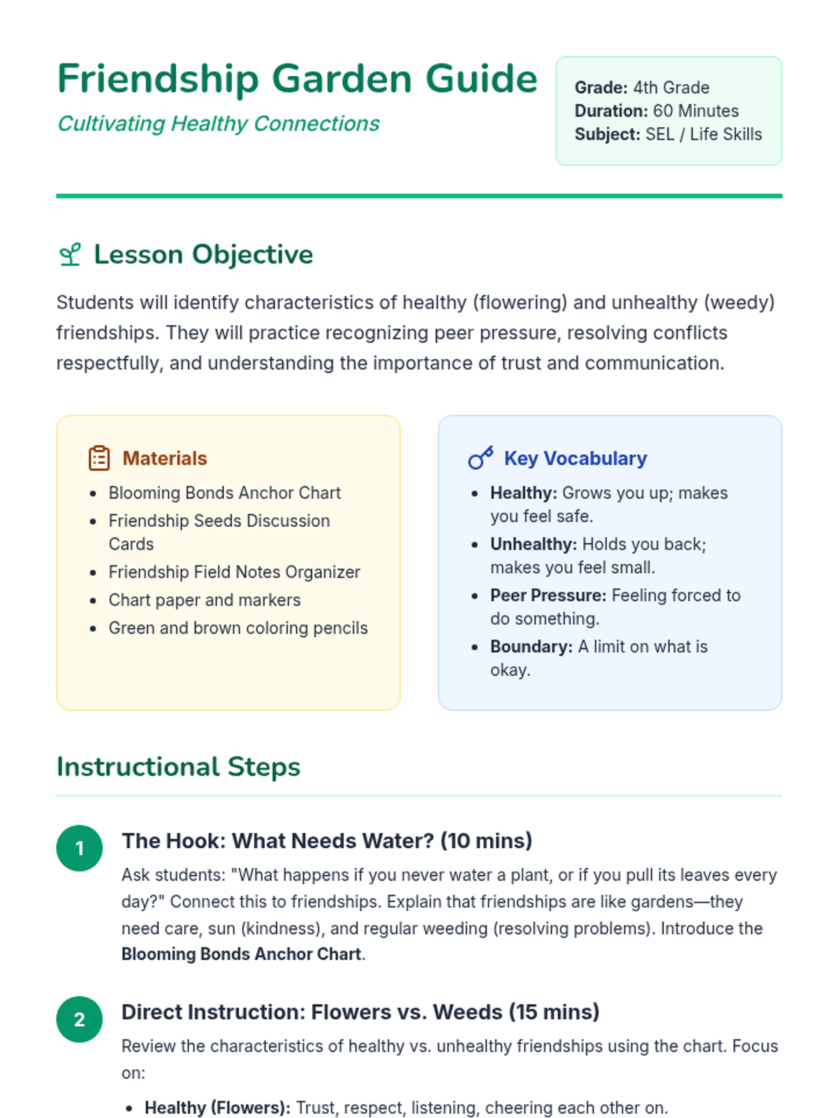 A comprehensive 4th-grade lesson titled 'Friendship Garden' that teaches students to distinguish between healthy and unhealthy friendships through visual aids, group discussions, and reflective writing. The lesson focuses on trust, respect, conflict resolution, and resisting peer pressure.
