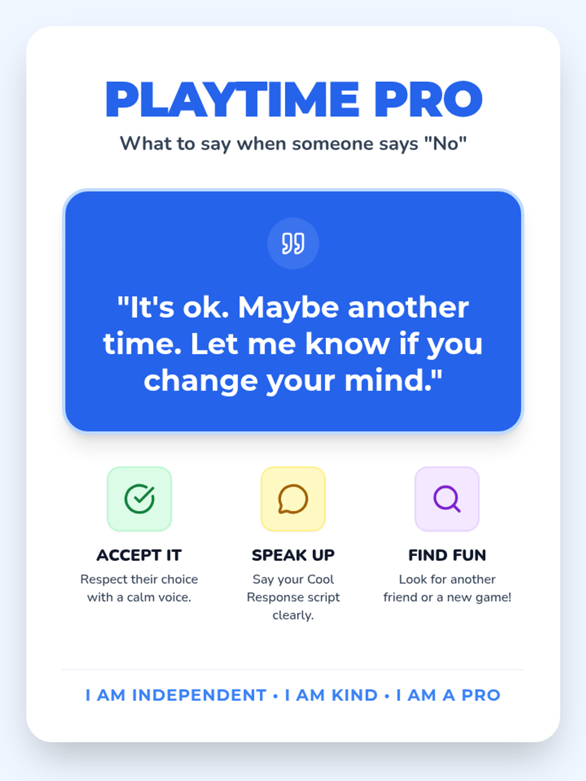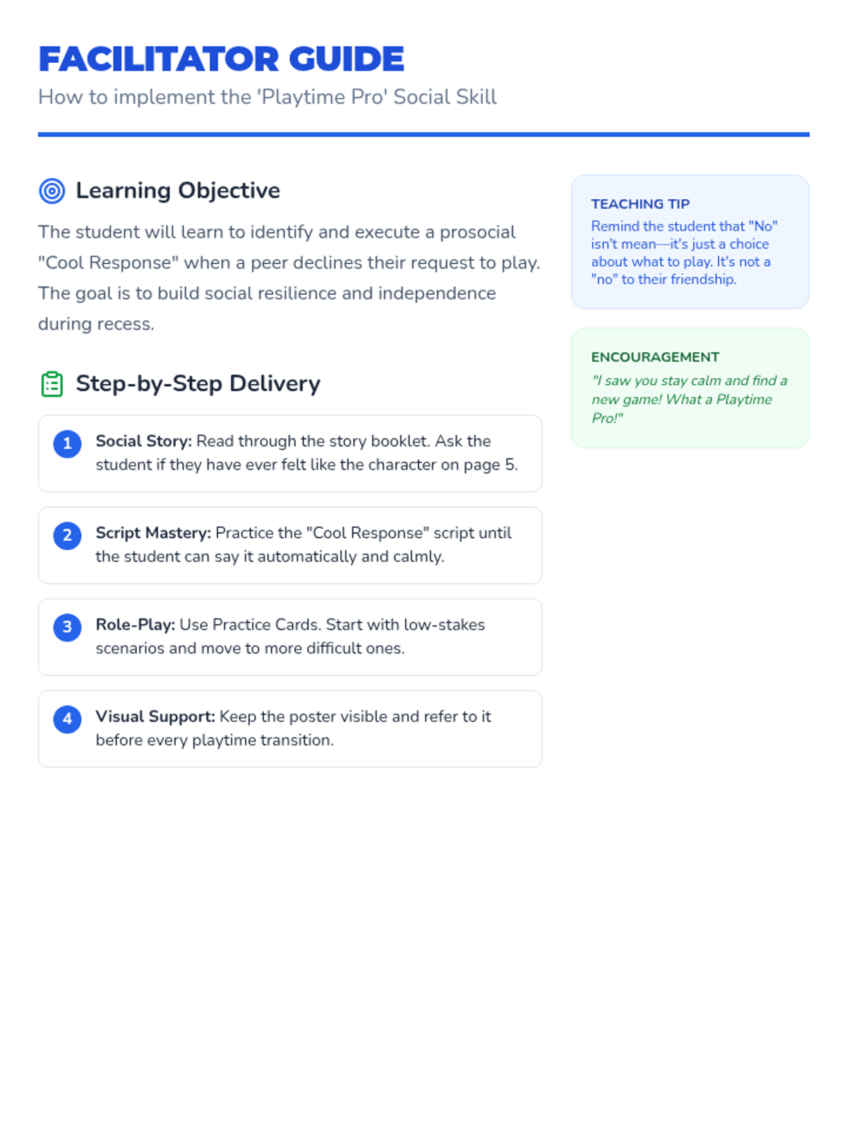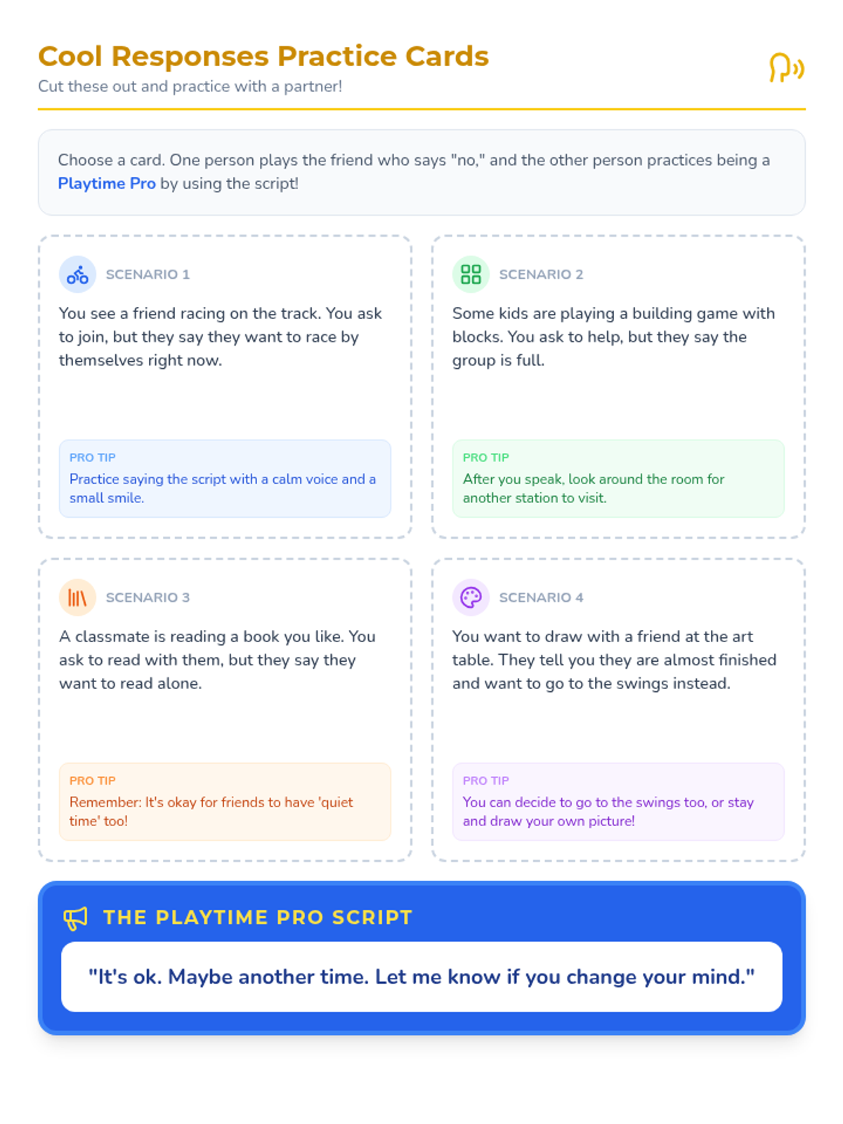 A social skills lesson designed to help students handle peer rejection gracefully during playtime by using 'Cool Responses' and finding alternative activities.