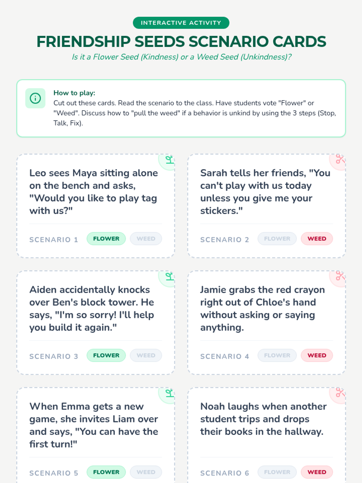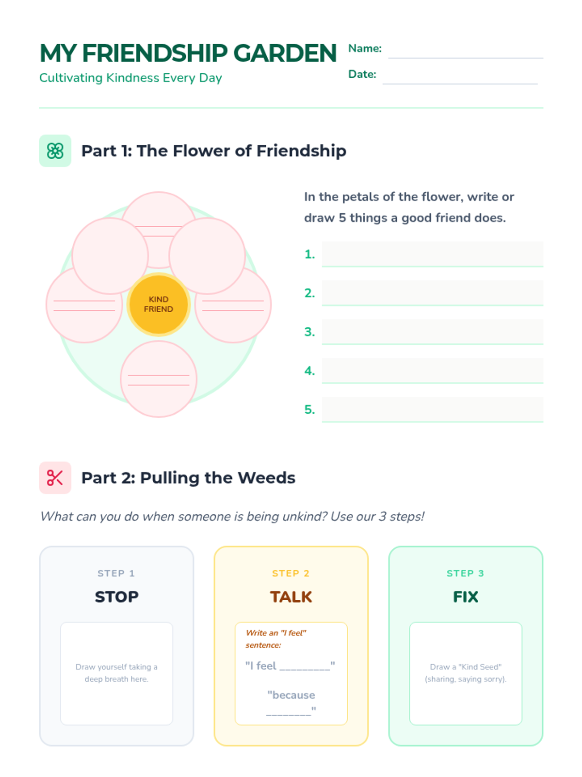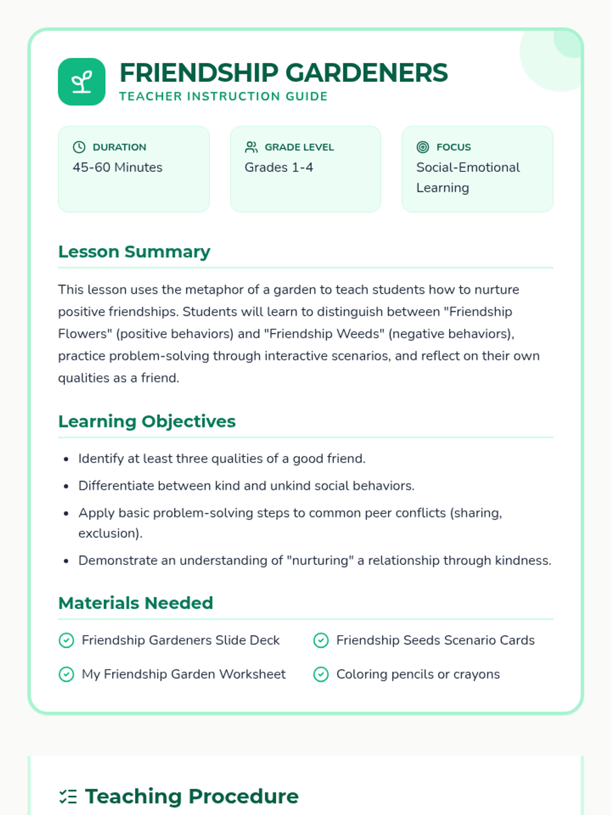 A gentle lesson for grades 1-4 focusing on kindness, sharing, and problem-solving through a botanical metaphor of cultivating a 'friendship garden.' Students identify positive friend traits and practice social skills.