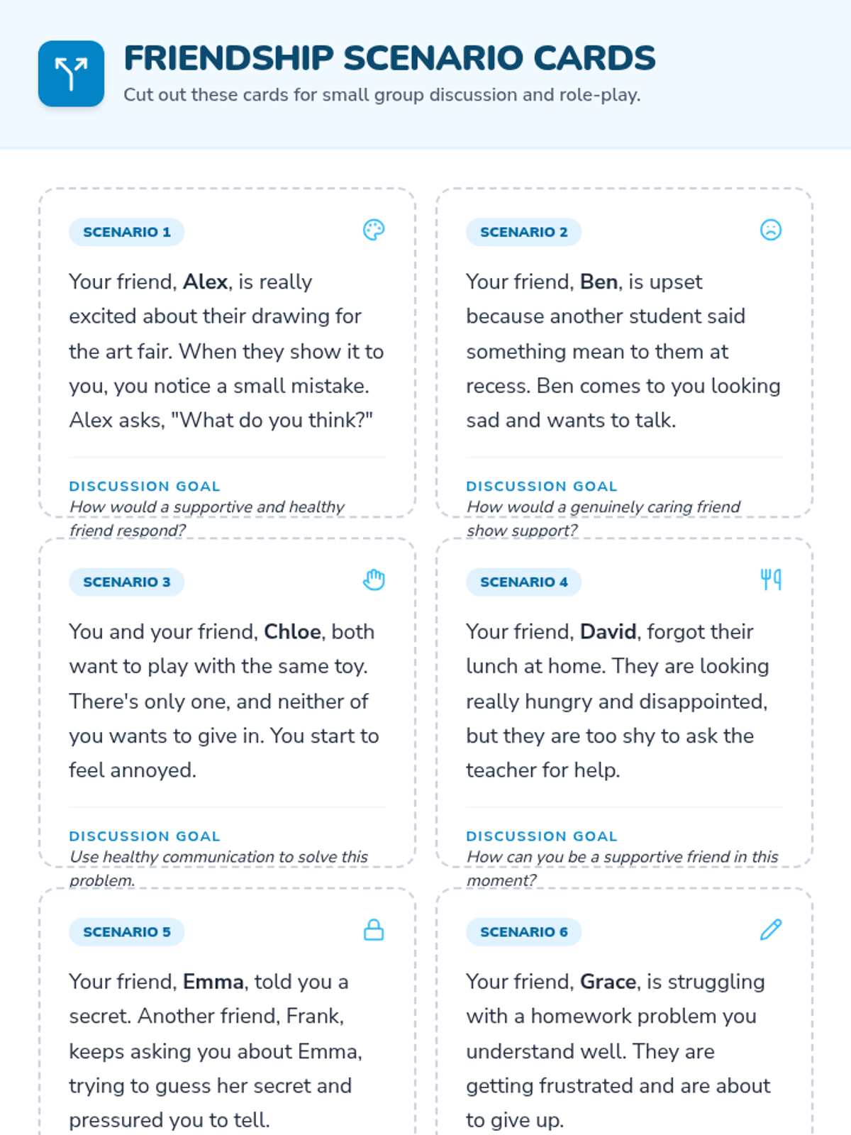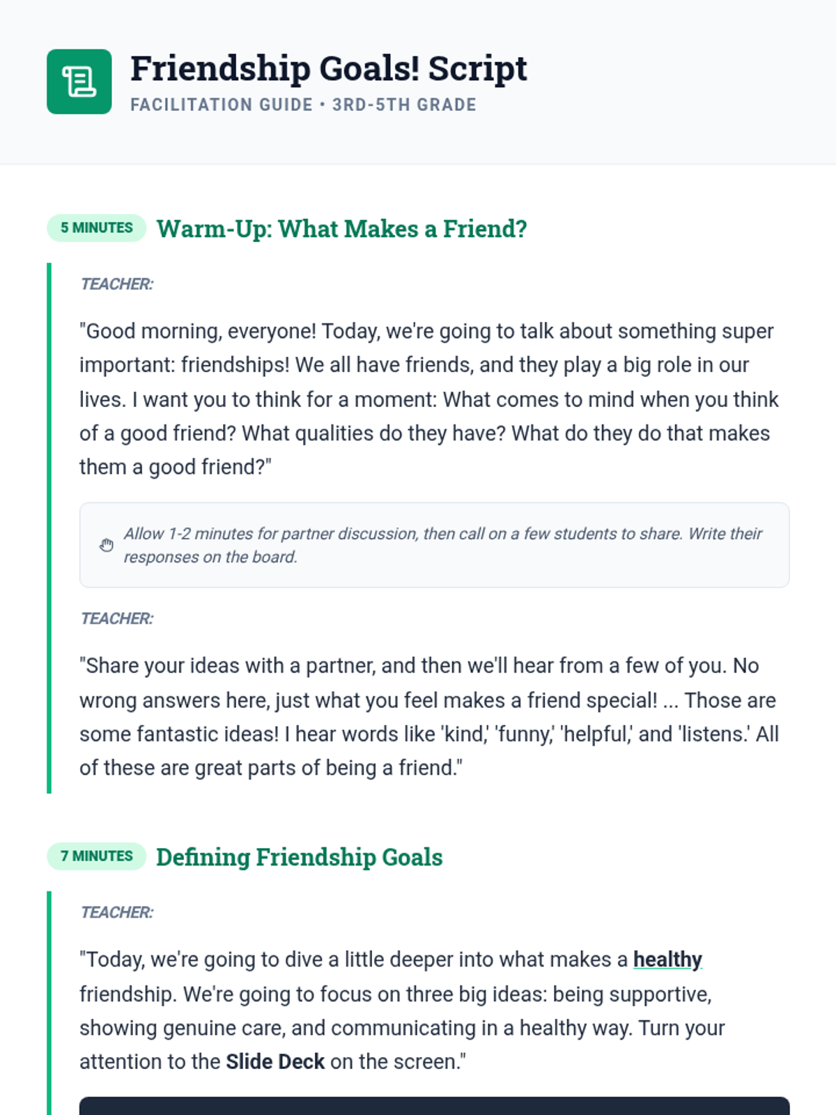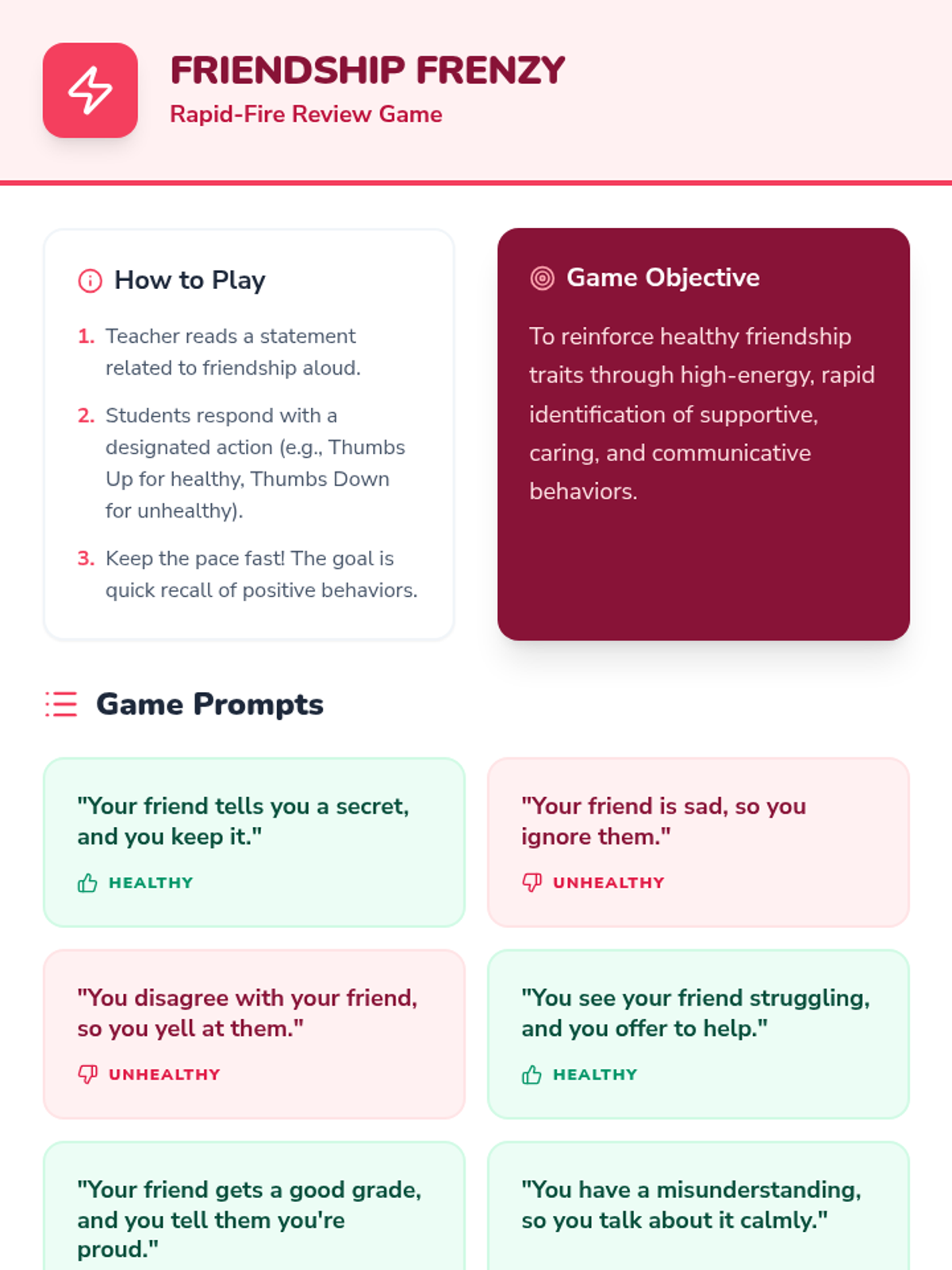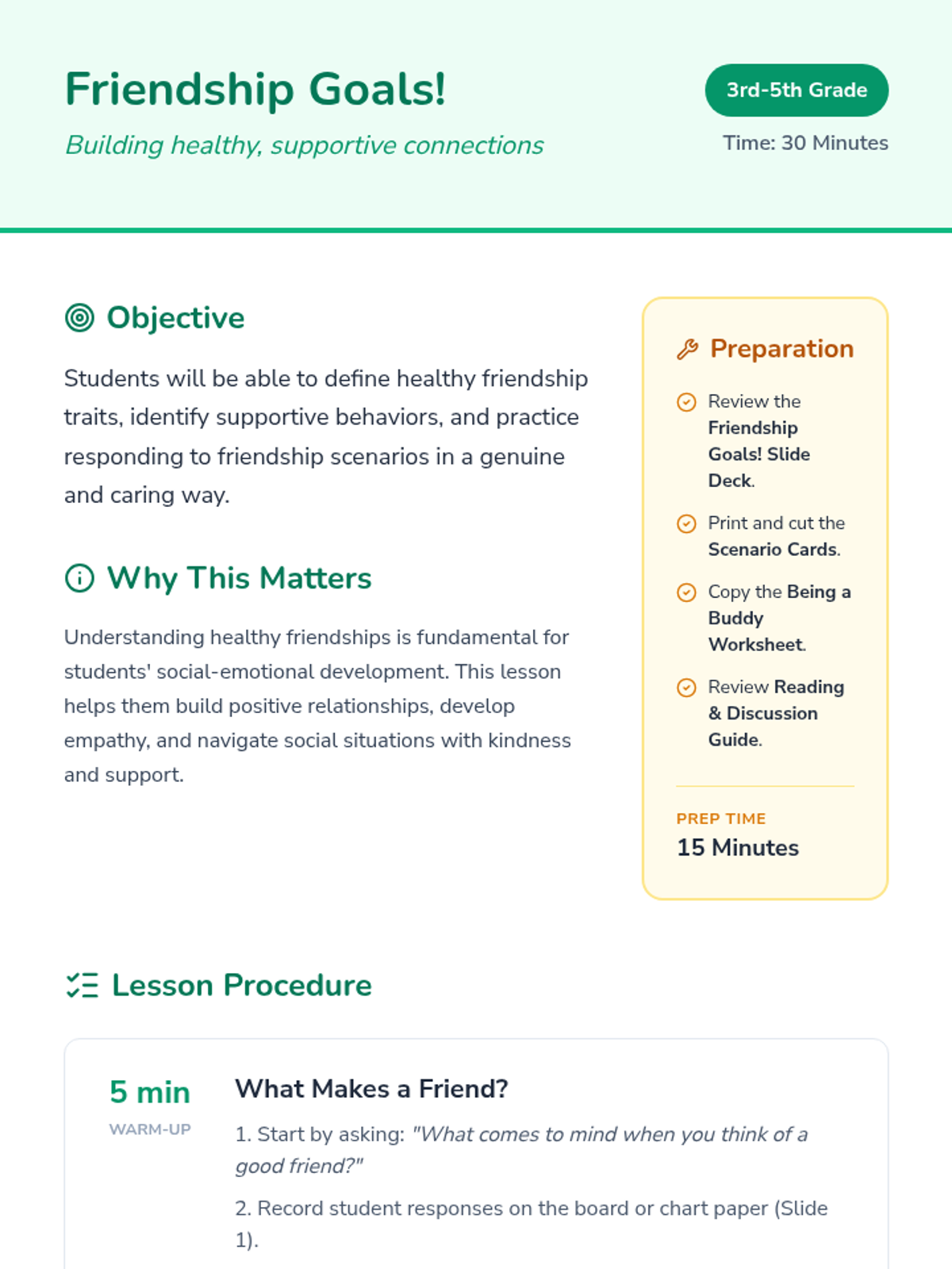 A social-emotional learning lesson for 3rd-5th graders focusing on the core traits of healthy friendships: support, genuine care, and healthy communication. Students engage through interactive discussion, a reading passage, and scenario-based role-play.