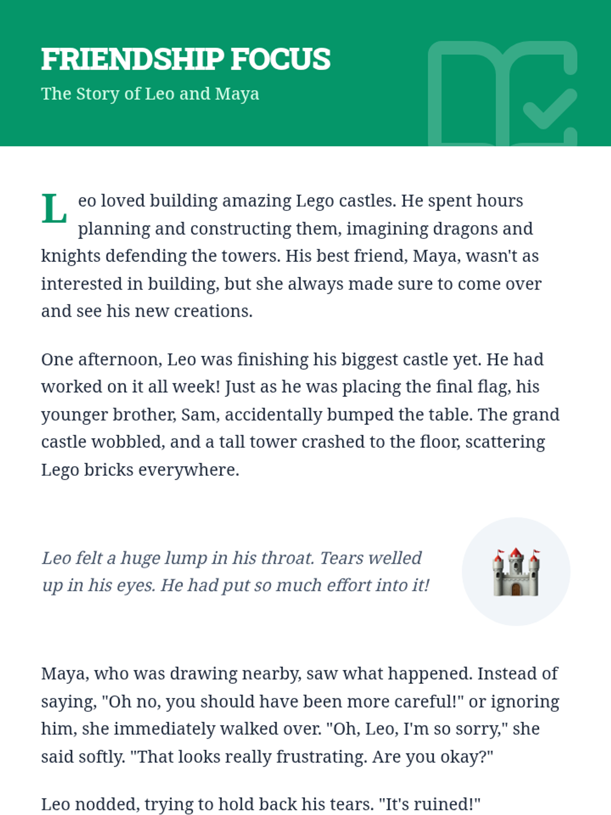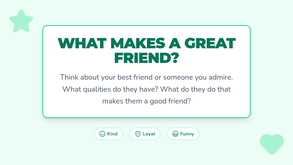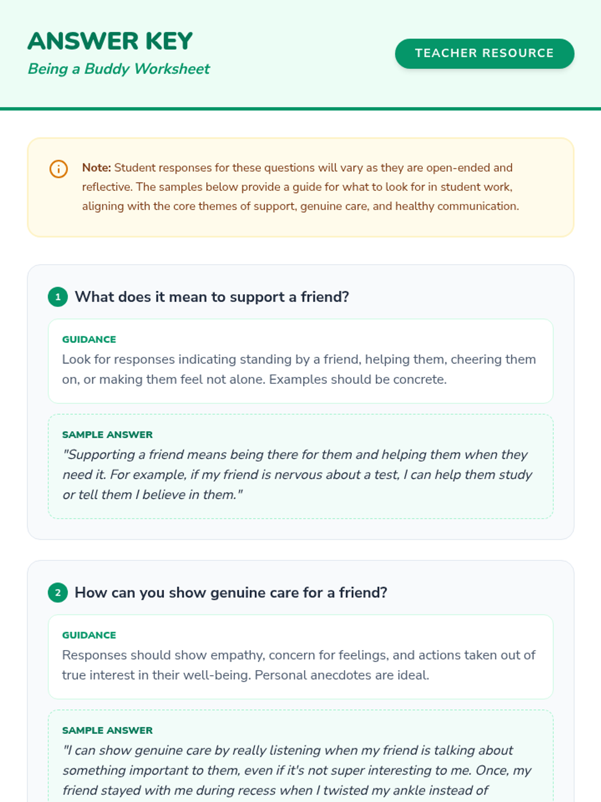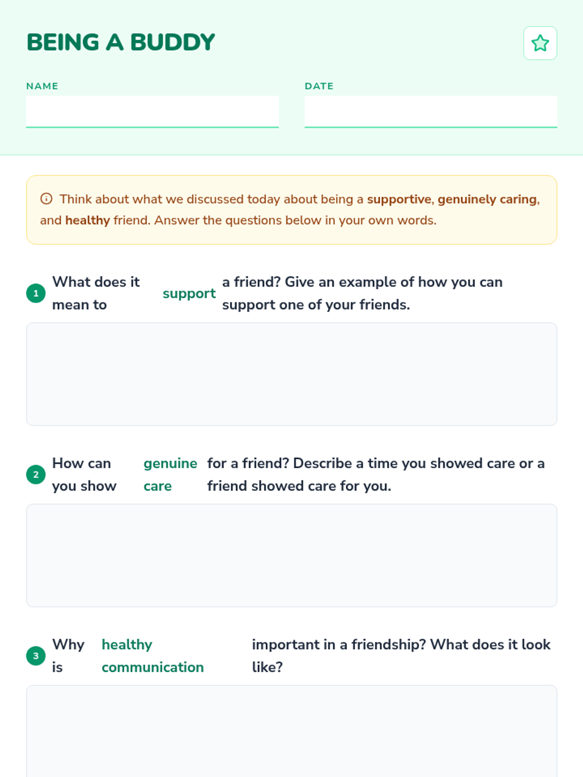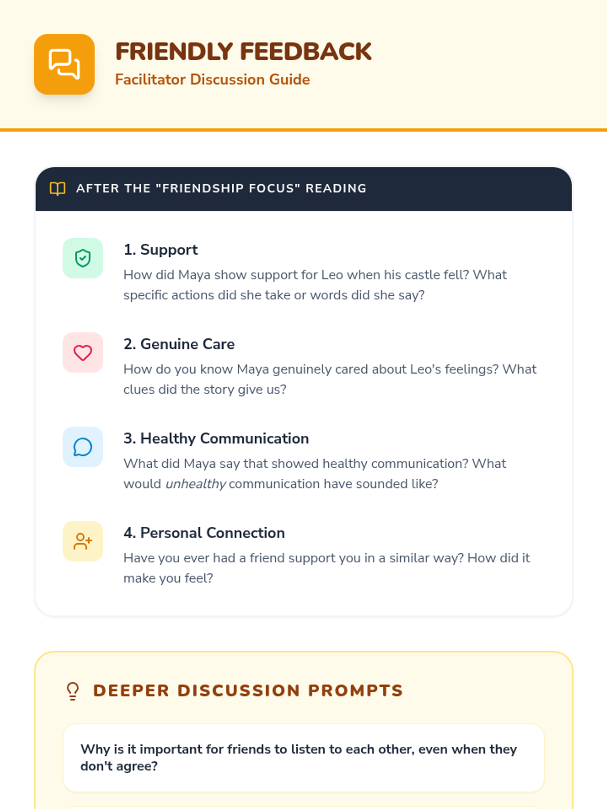 A social-emotional learning lesson for 3rd-5th graders focusing on the core traits of healthy friendships: support, genuine care, and healthy communication. Students engage through interactive discussion, a reading passage, and scenario-based role-play.