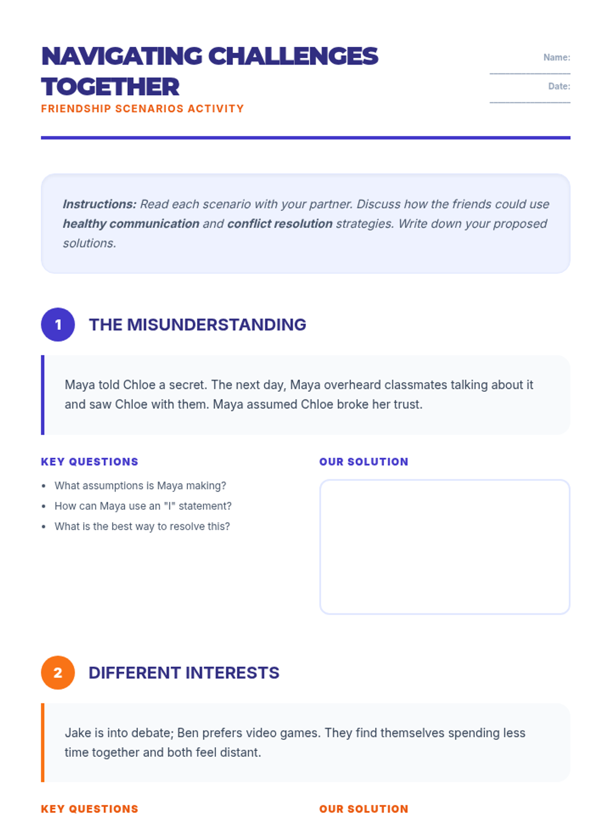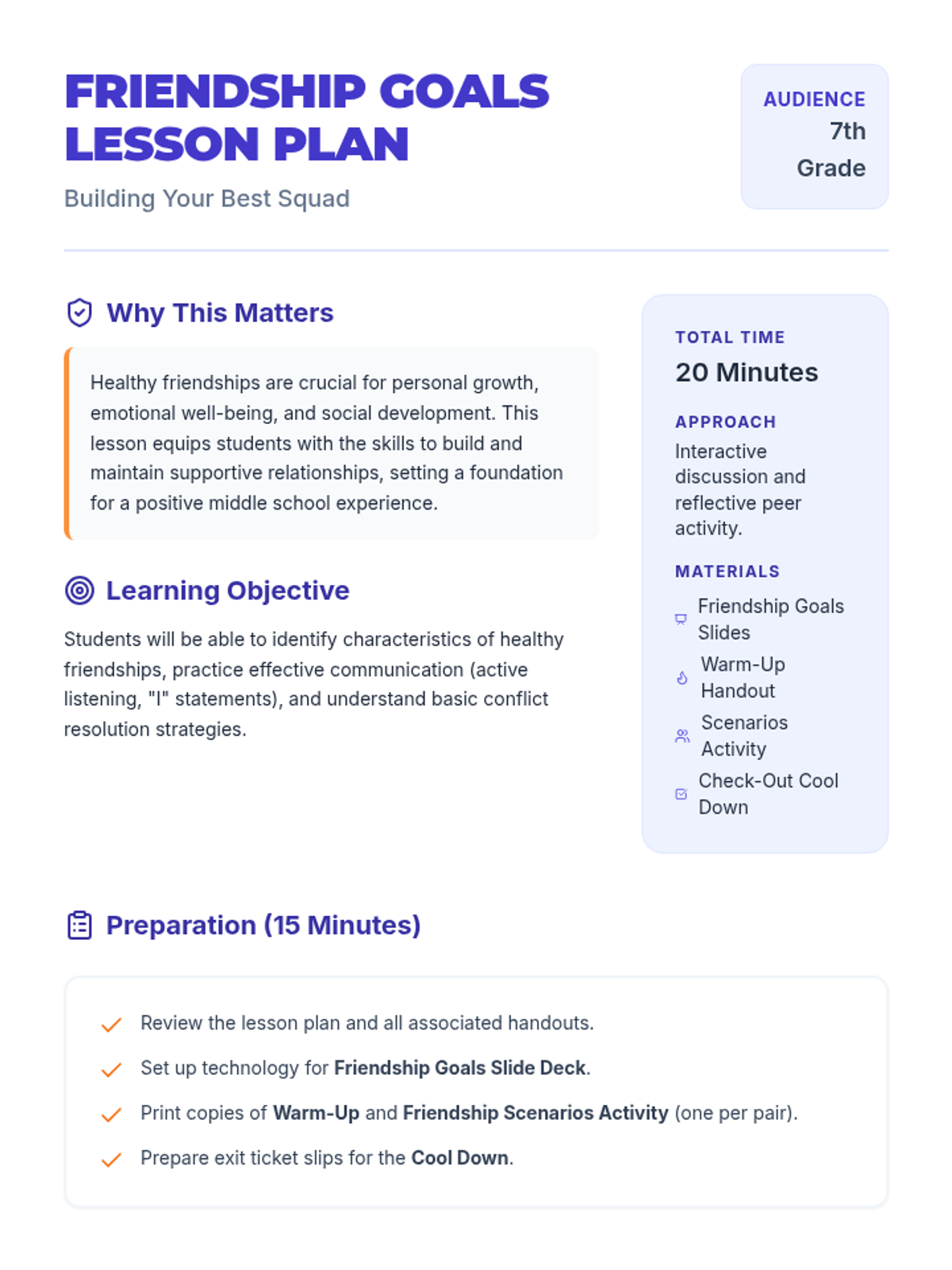 A foundational session for 7th grade students focusing on identifying healthy friendship traits, effective communication through 'I' statements, and collaborative conflict resolution.