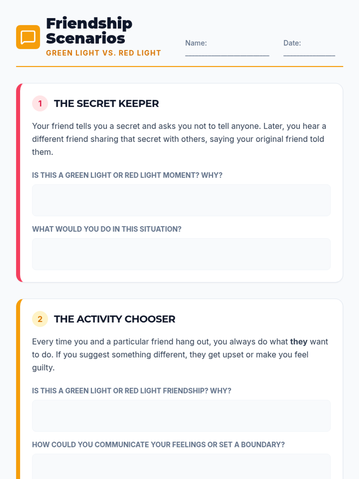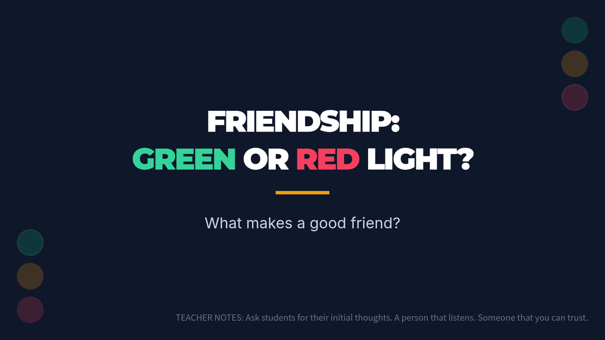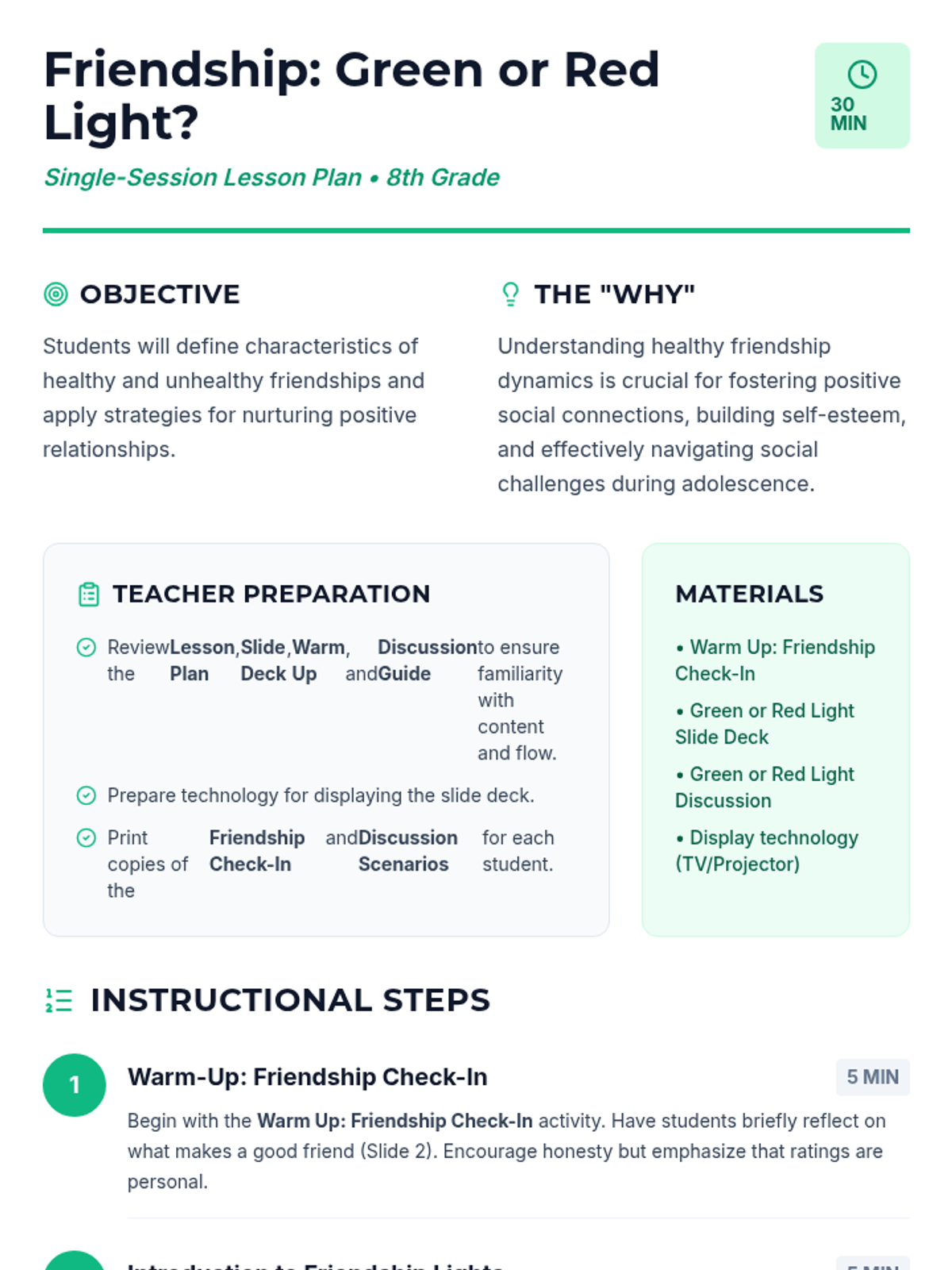 This lesson helps 8th-grade students distinguish between healthy and unhealthy friendships using a 'traffic light' metaphor to navigate social dynamics.