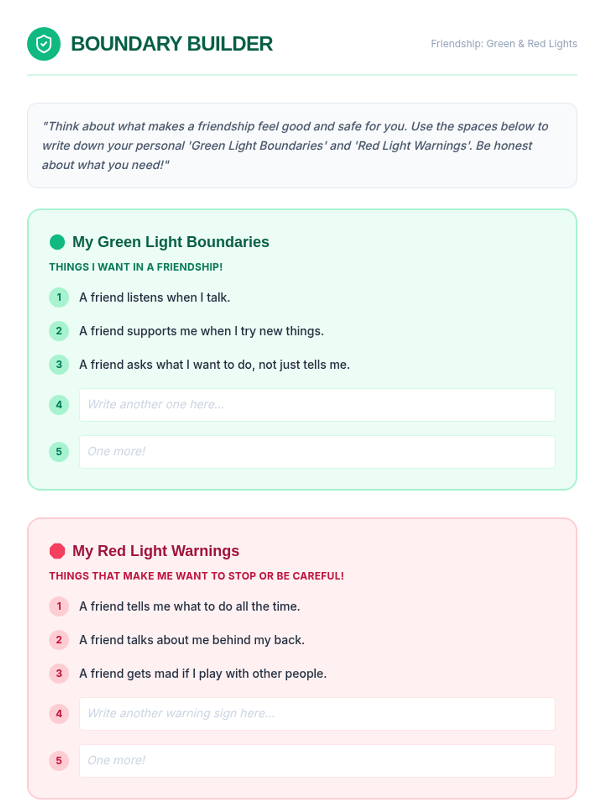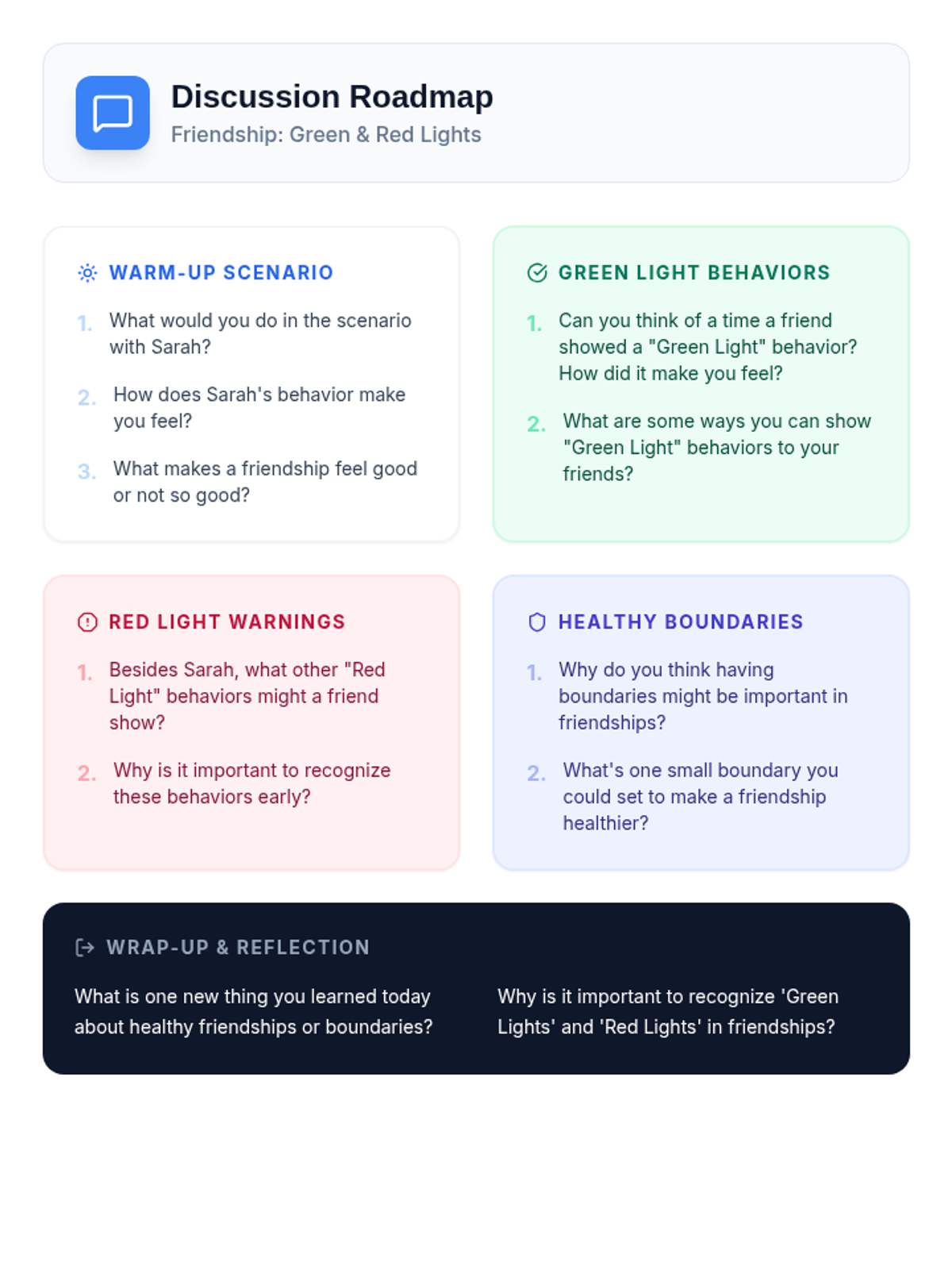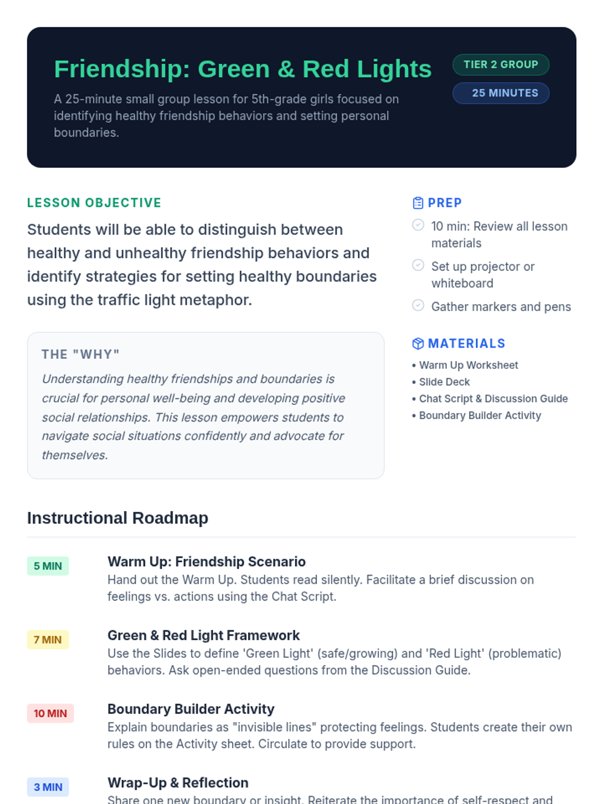 A 25-minute group lesson for 5th-grade girls to identify healthy and unhealthy friendship behaviors and practice setting personal boundaries using a traffic light metaphor.