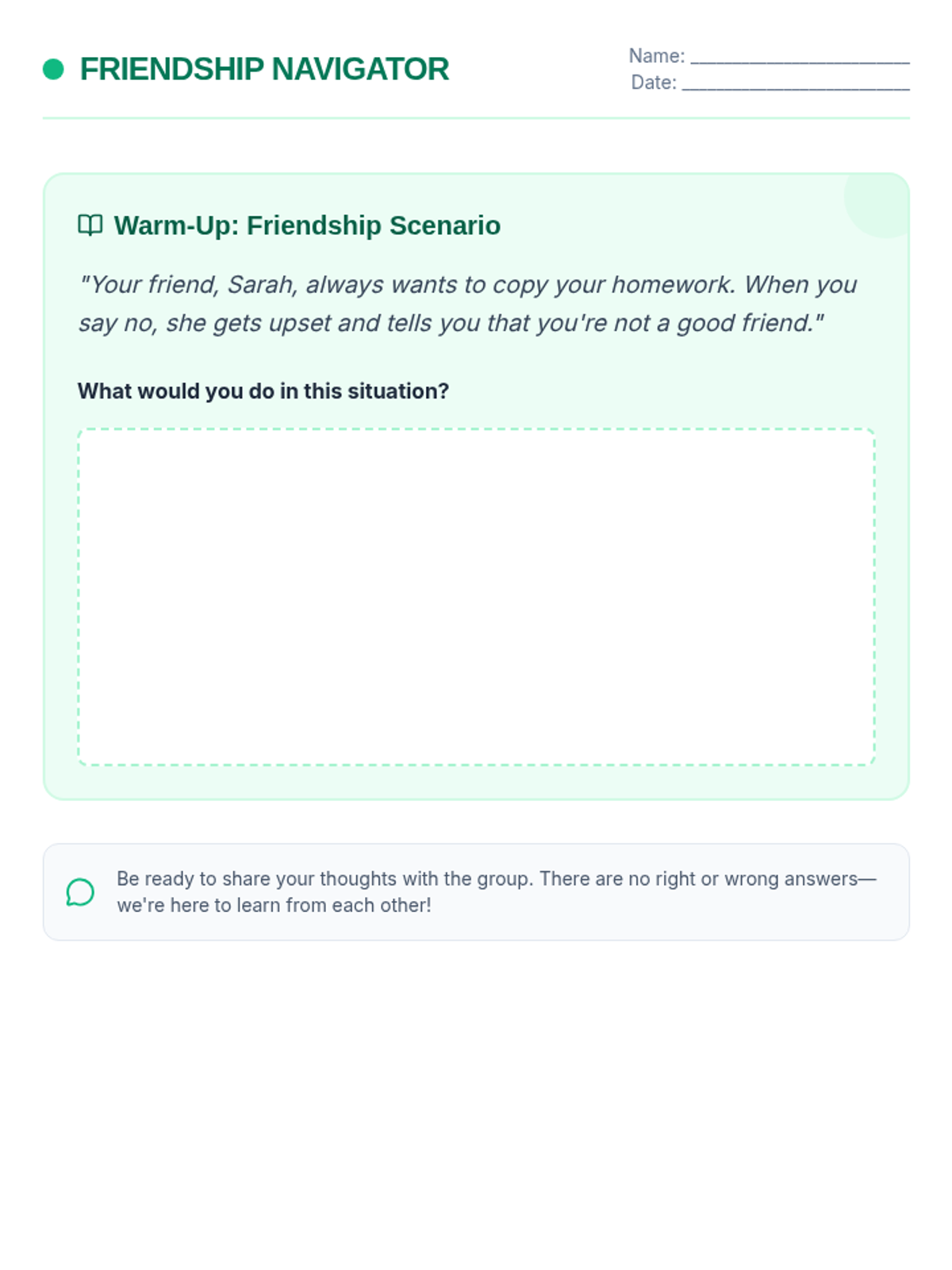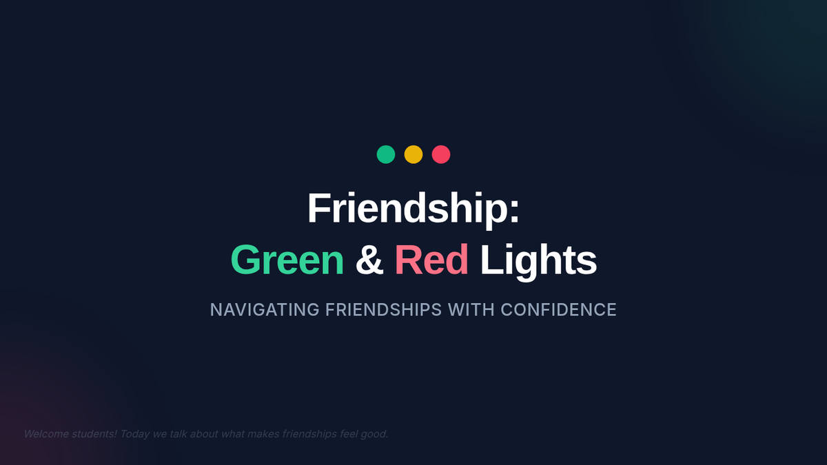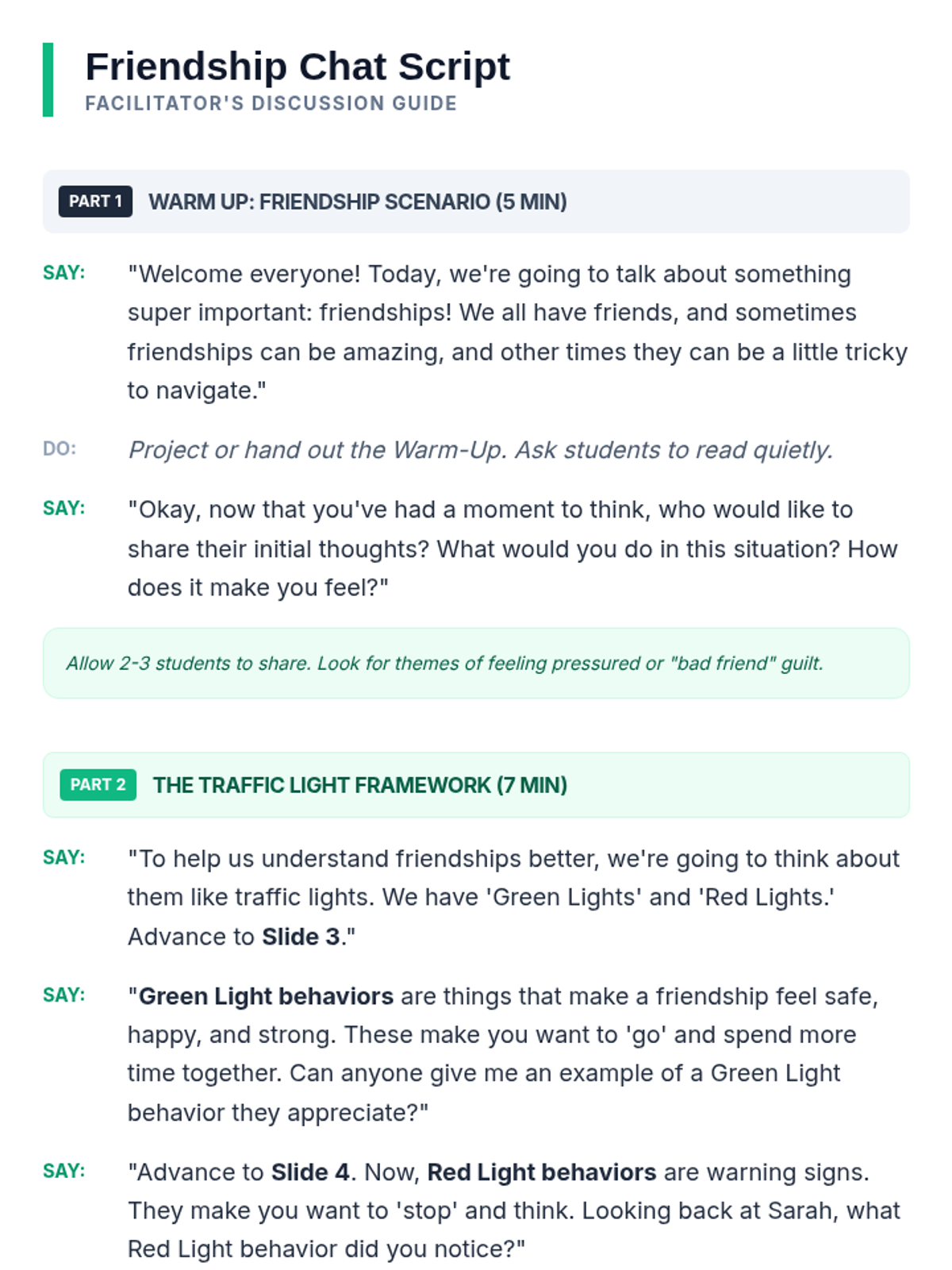 A 25-minute group lesson for 5th-grade girls to identify healthy and unhealthy friendship behaviors and practice setting personal boundaries using a traffic light metaphor.
