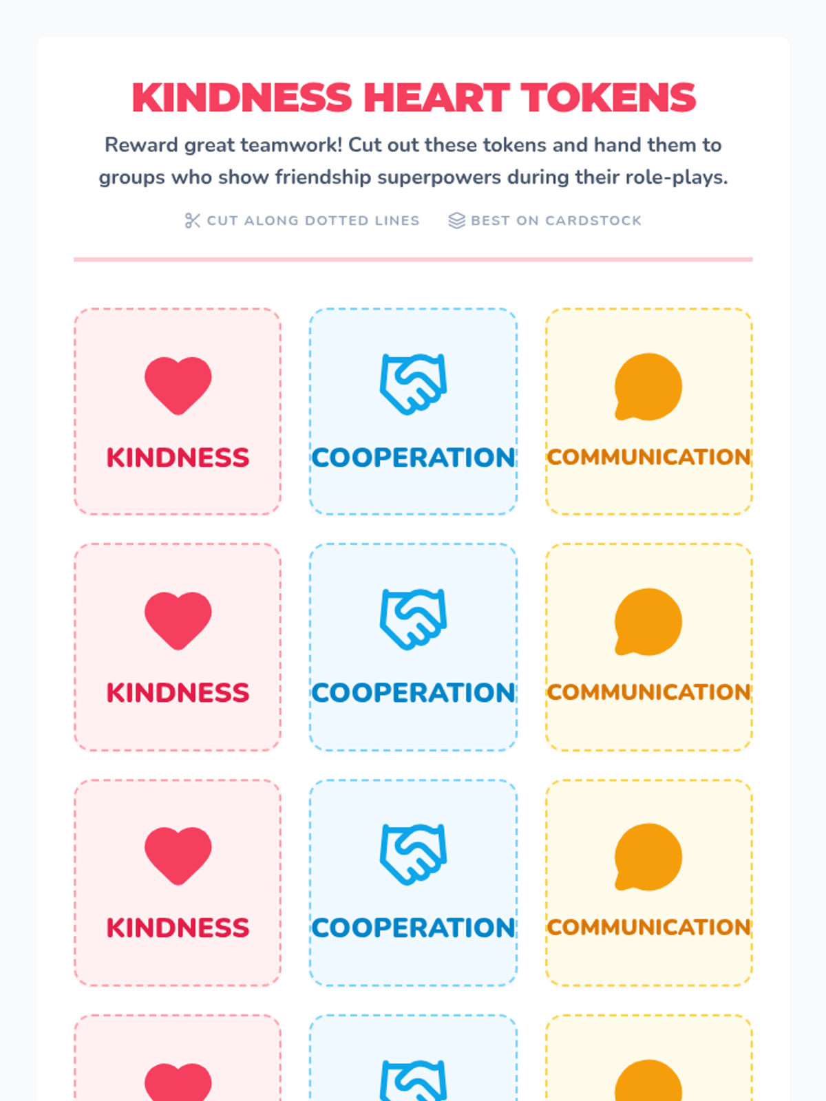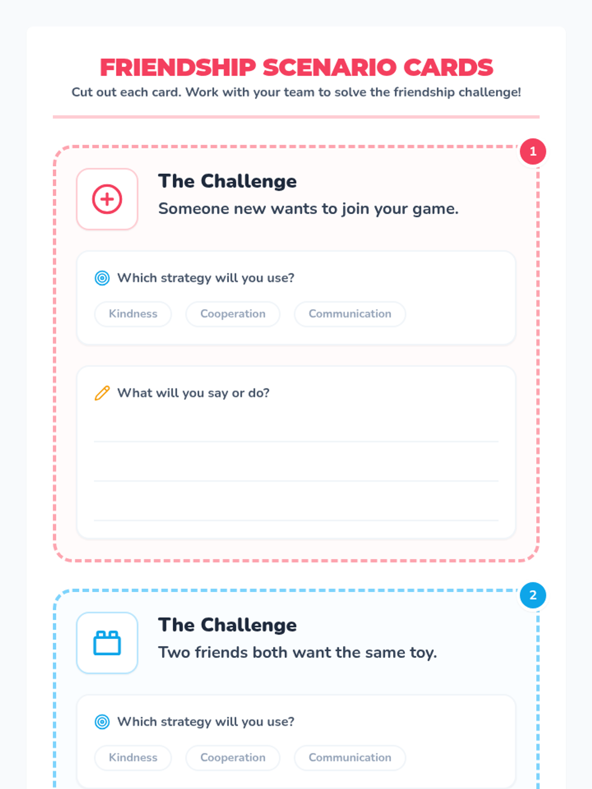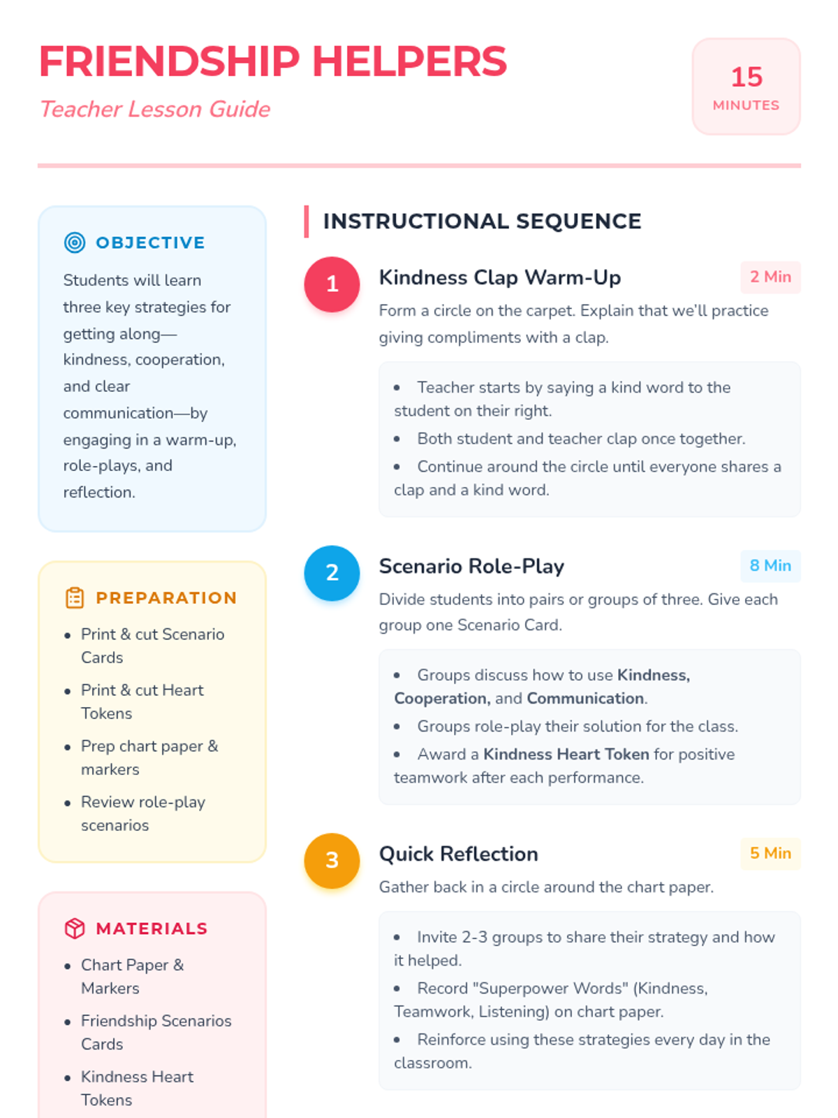 A 15-minute 1st-grade lesson where students explore kindness, cooperation, and clear communication through role-play and reflection.