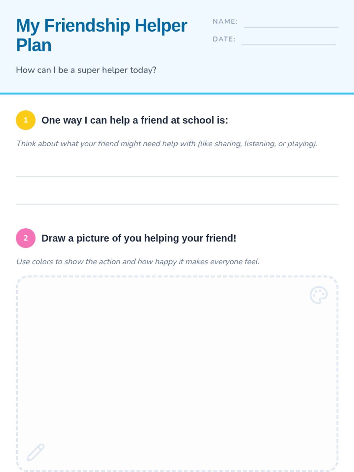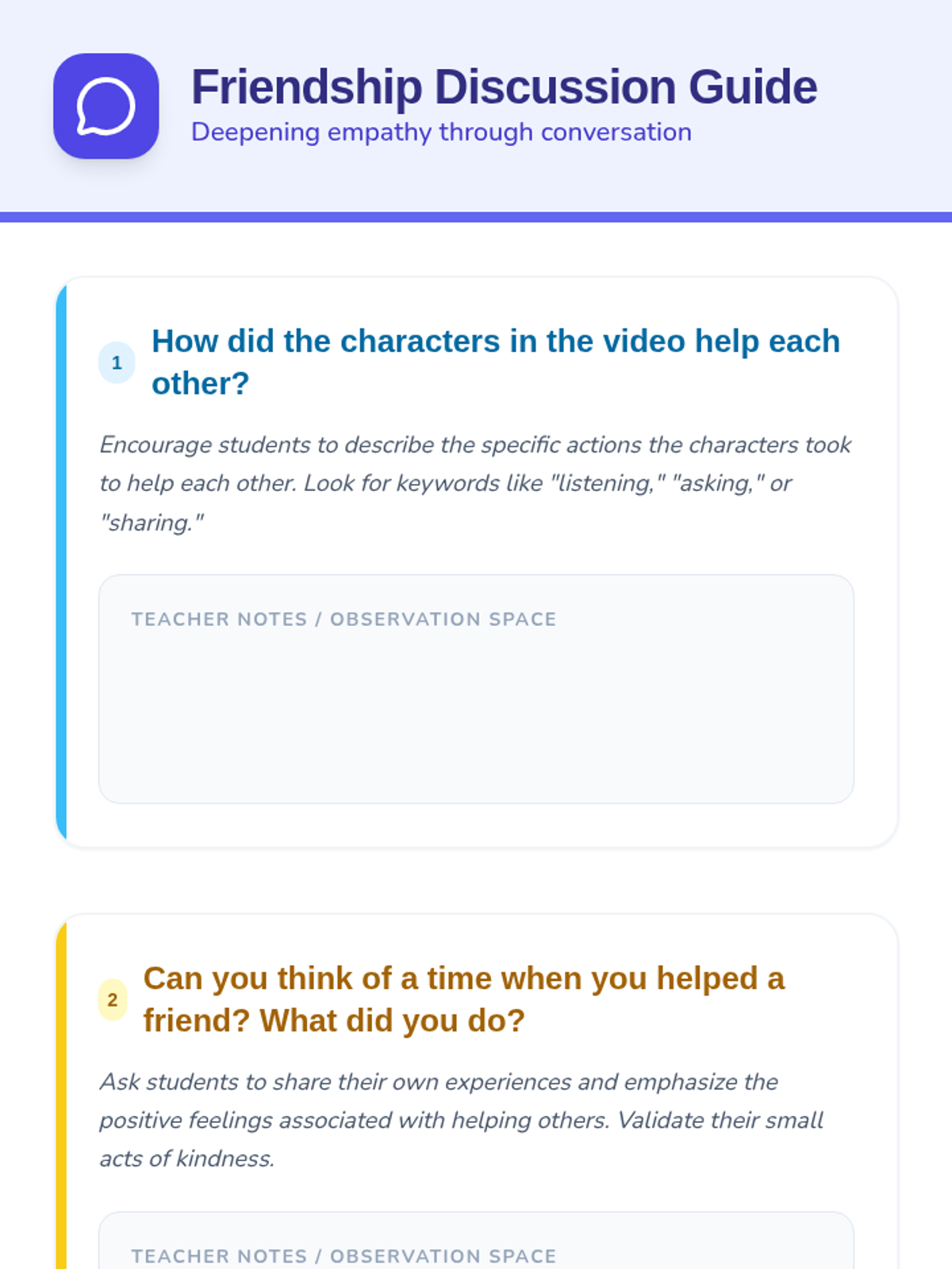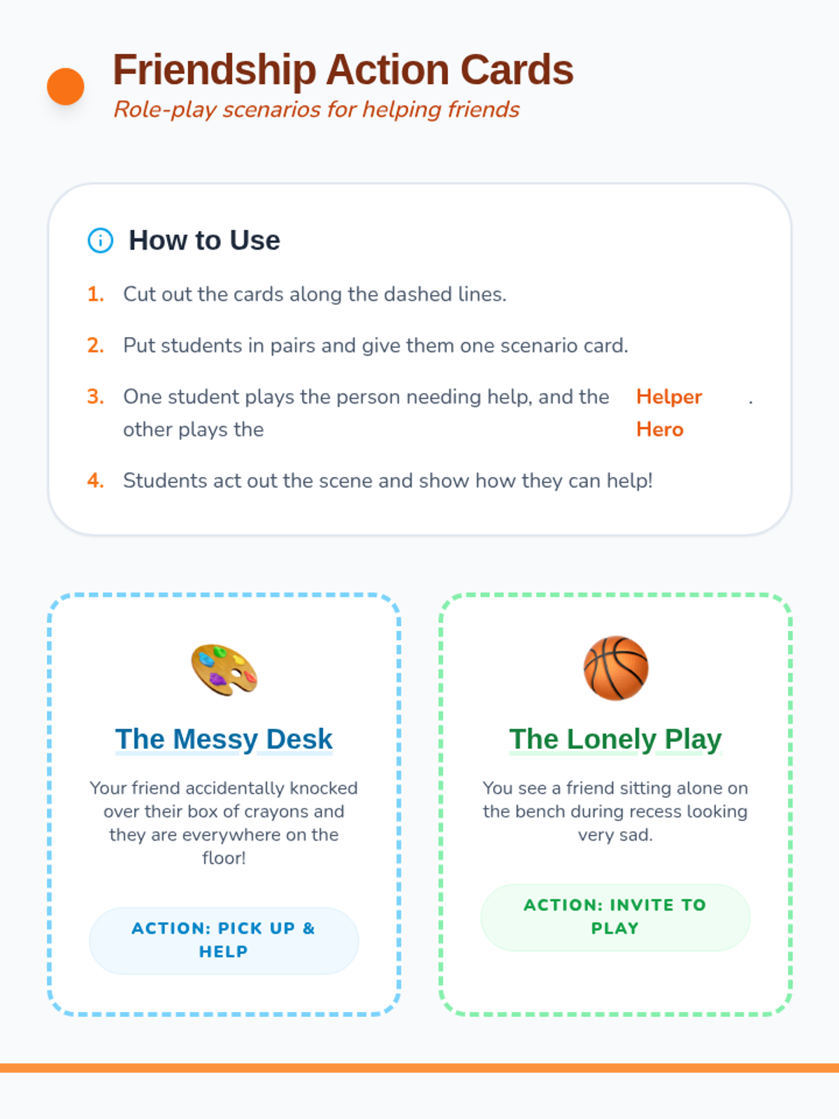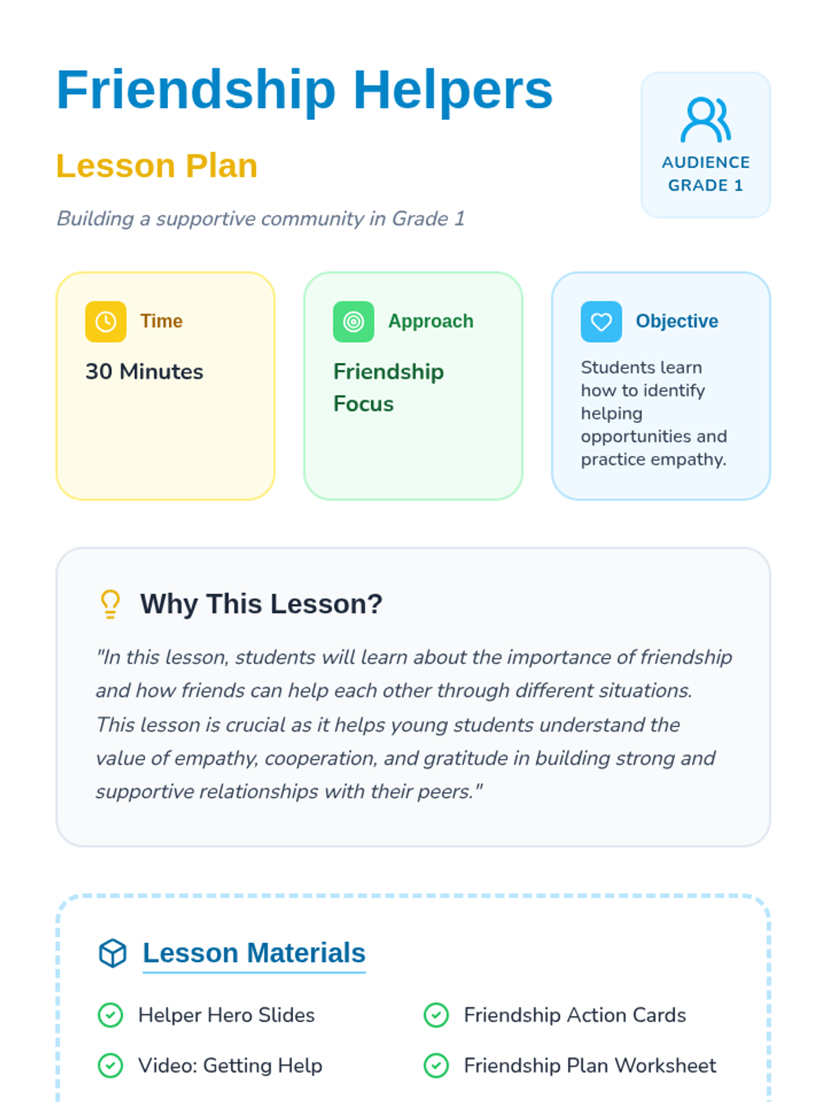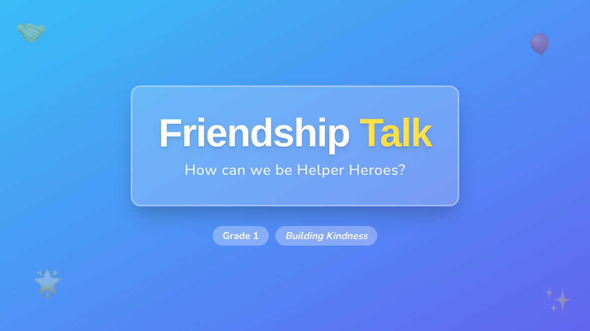 In this lesson, Grade 1 students will learn about the importance of friendship and how friends can help each other through different situations. They will explore empathy, cooperation, and gratitude through video, role-play, and creative activities.