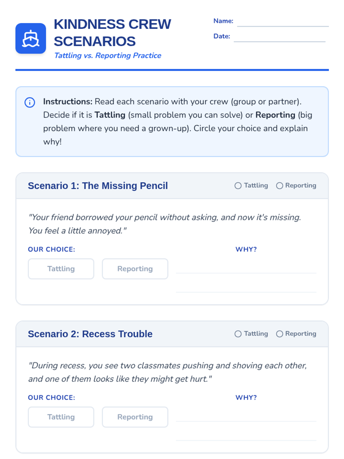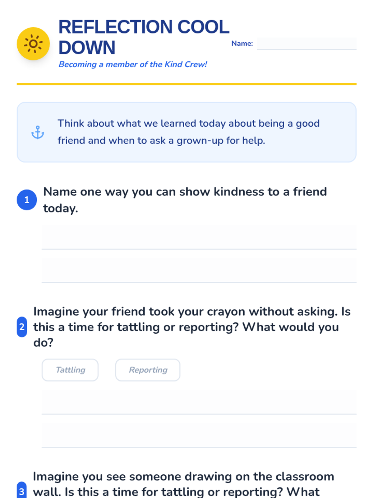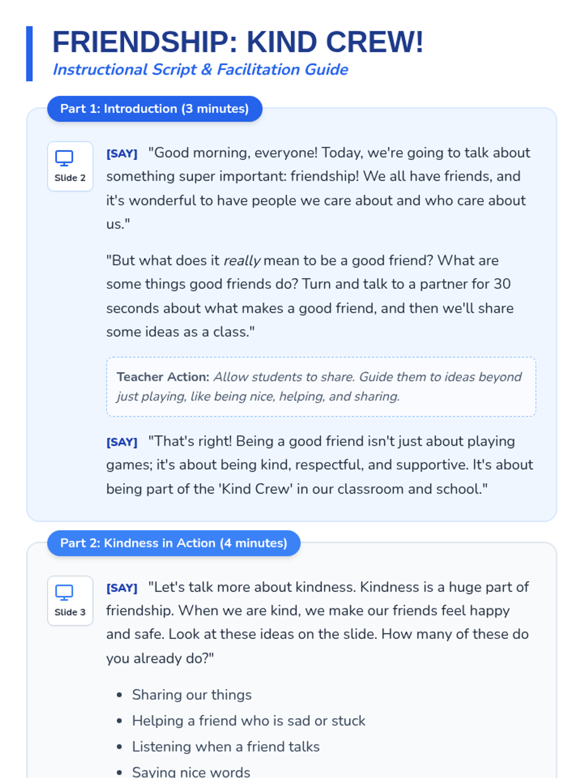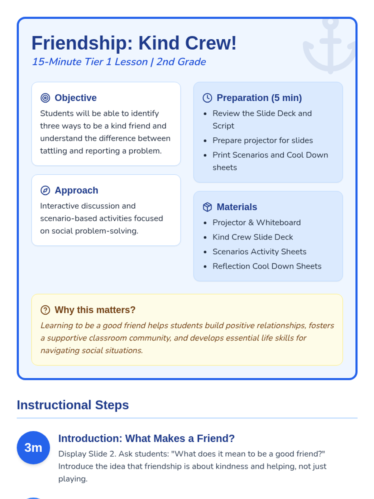 A 15-minute Tier 1 lesson for 2nd graders focused on building friendships through kindness and distinguishing between tattling and reporting. Students engage in discussions and scenario-based activities to foster a supportive classroom community.