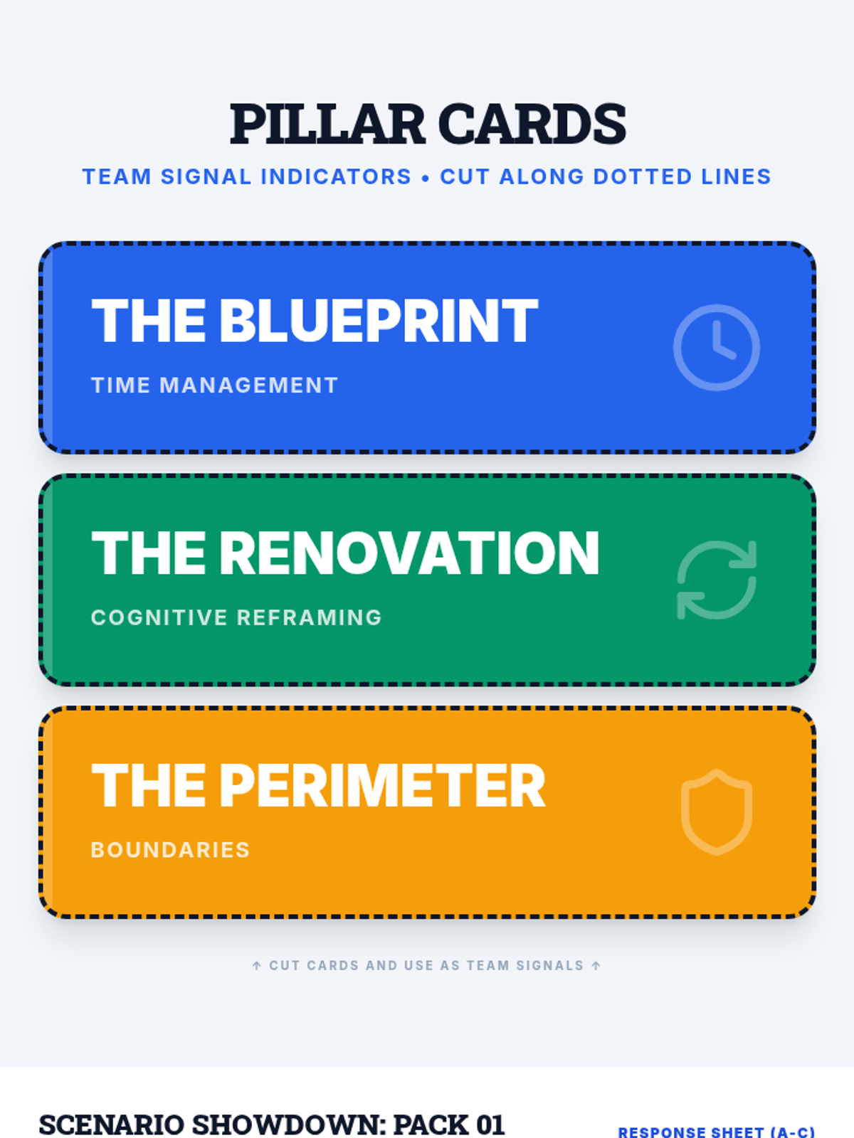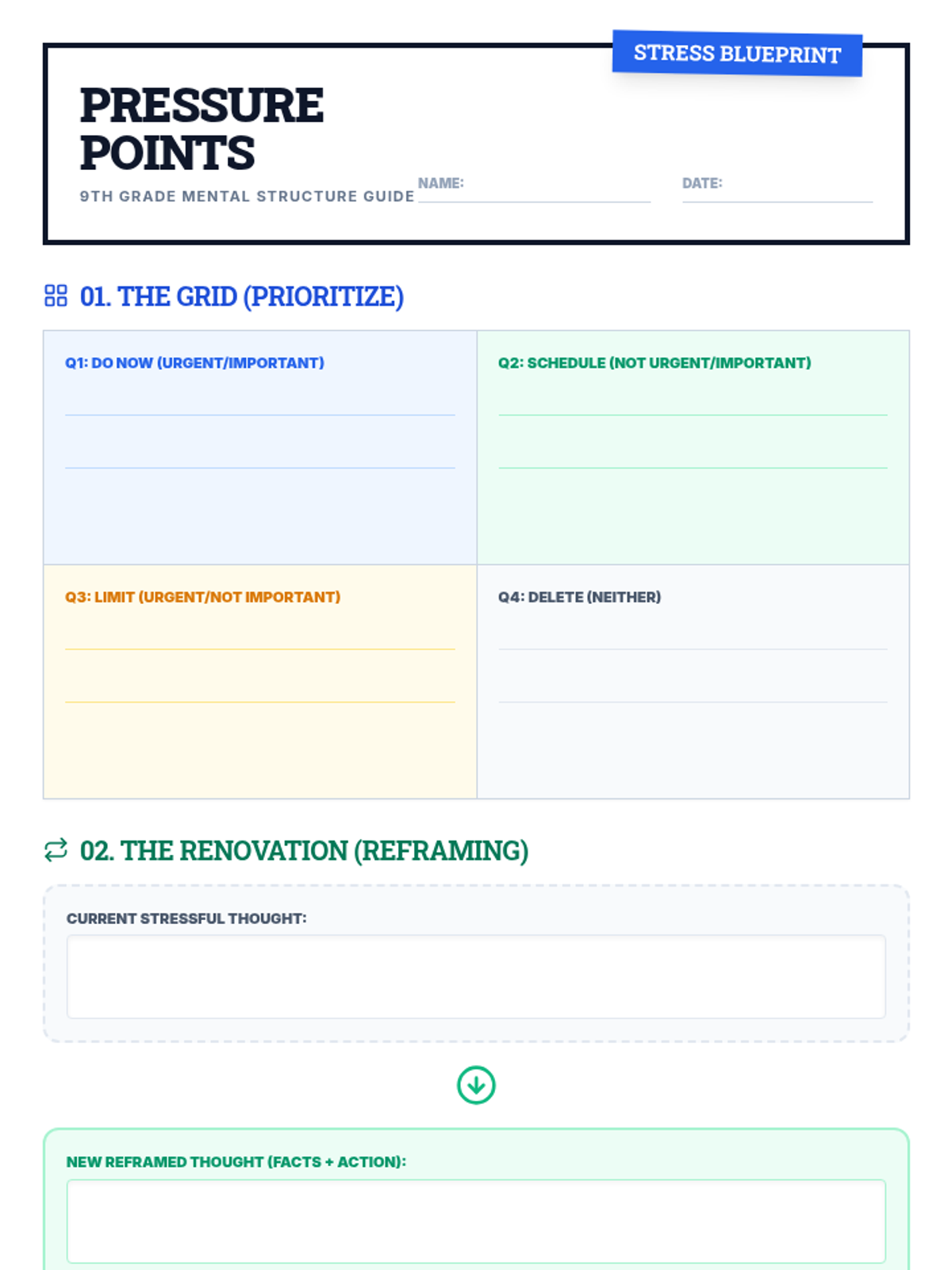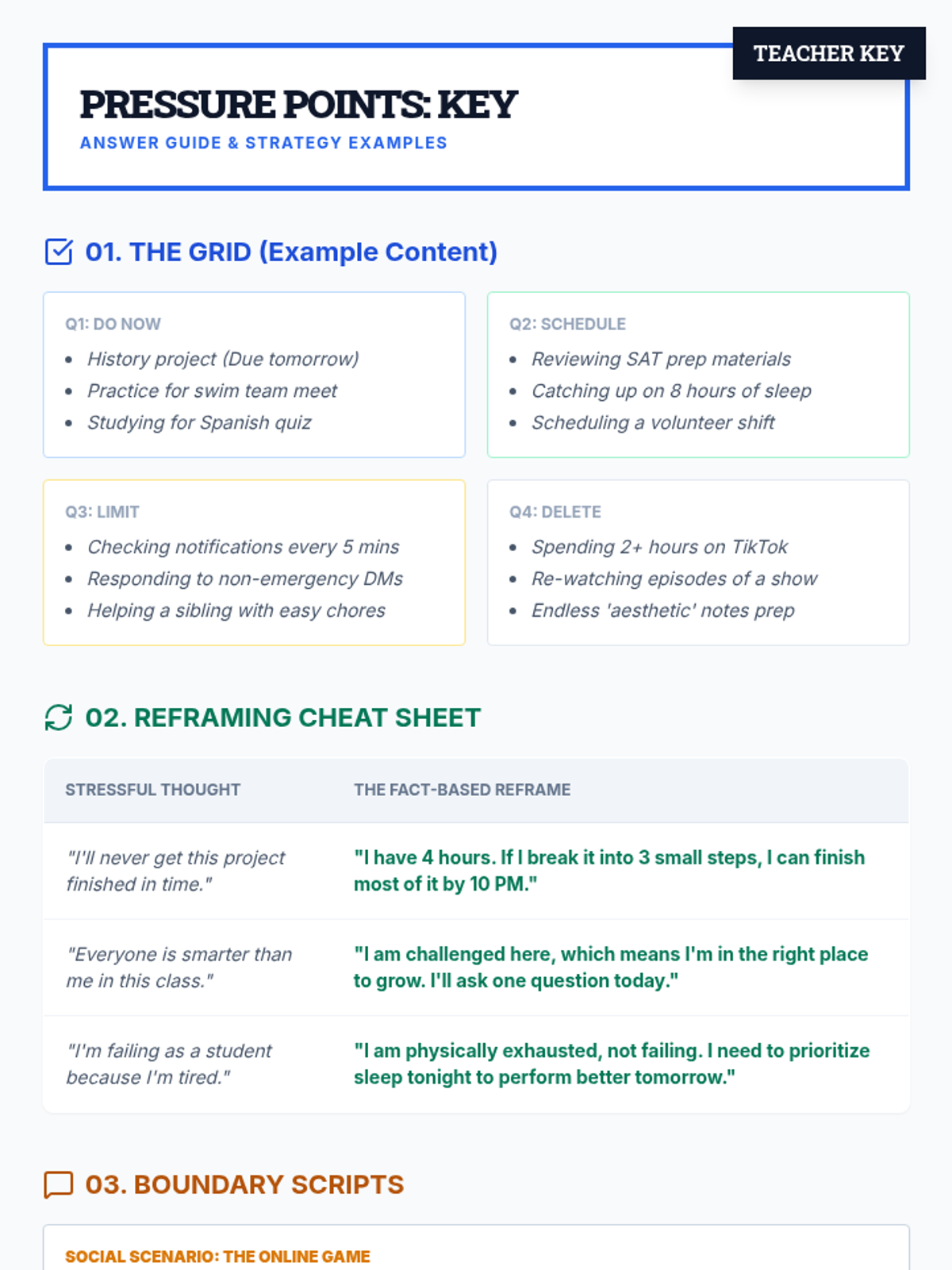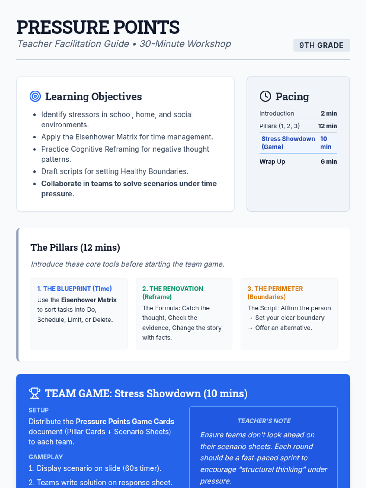 A 30-minute high school lesson focused on practical stress management through time management, cognitive reframing, and boundary setting, featuring a fast-paced 'Stress Showdown' team game.