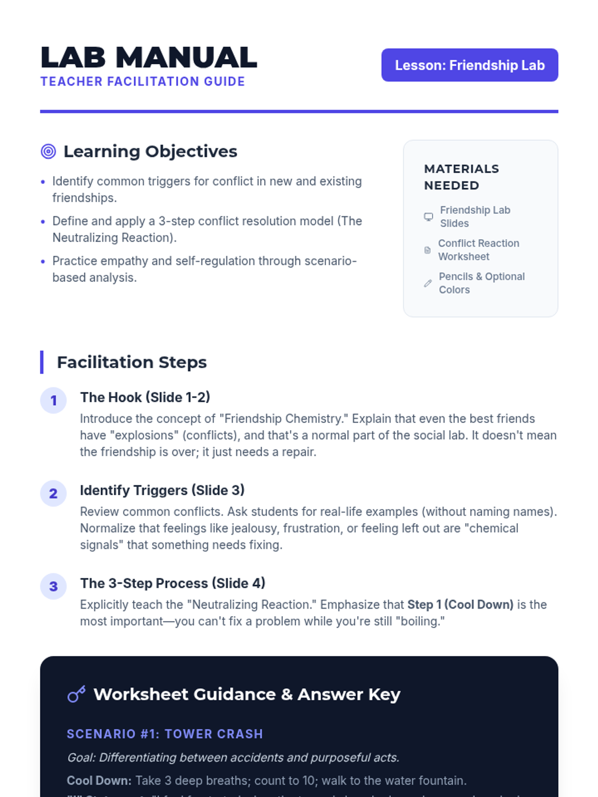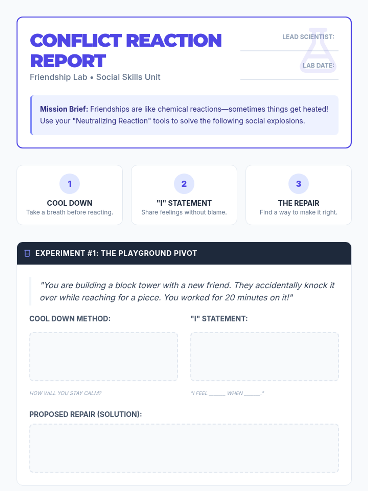 A lesson focused on identifying common friendship conflicts and learning practical strategies to resolve them effectively. Students will explore how to maintain friendships through clear communication and empathy.