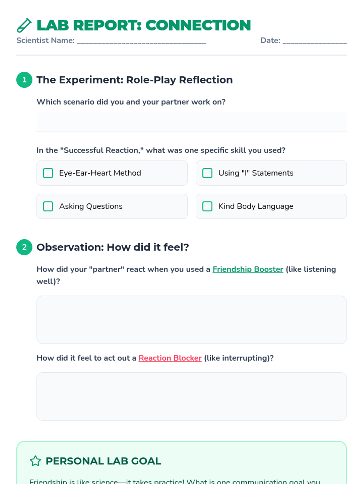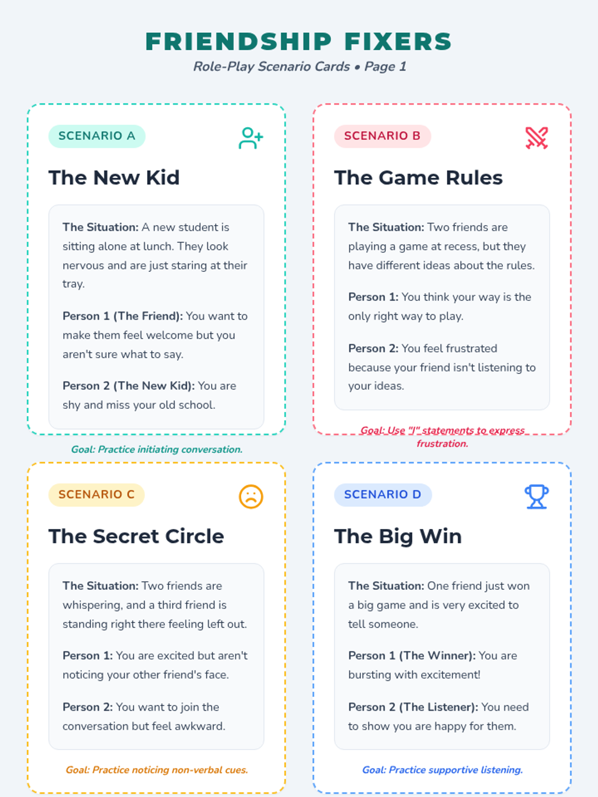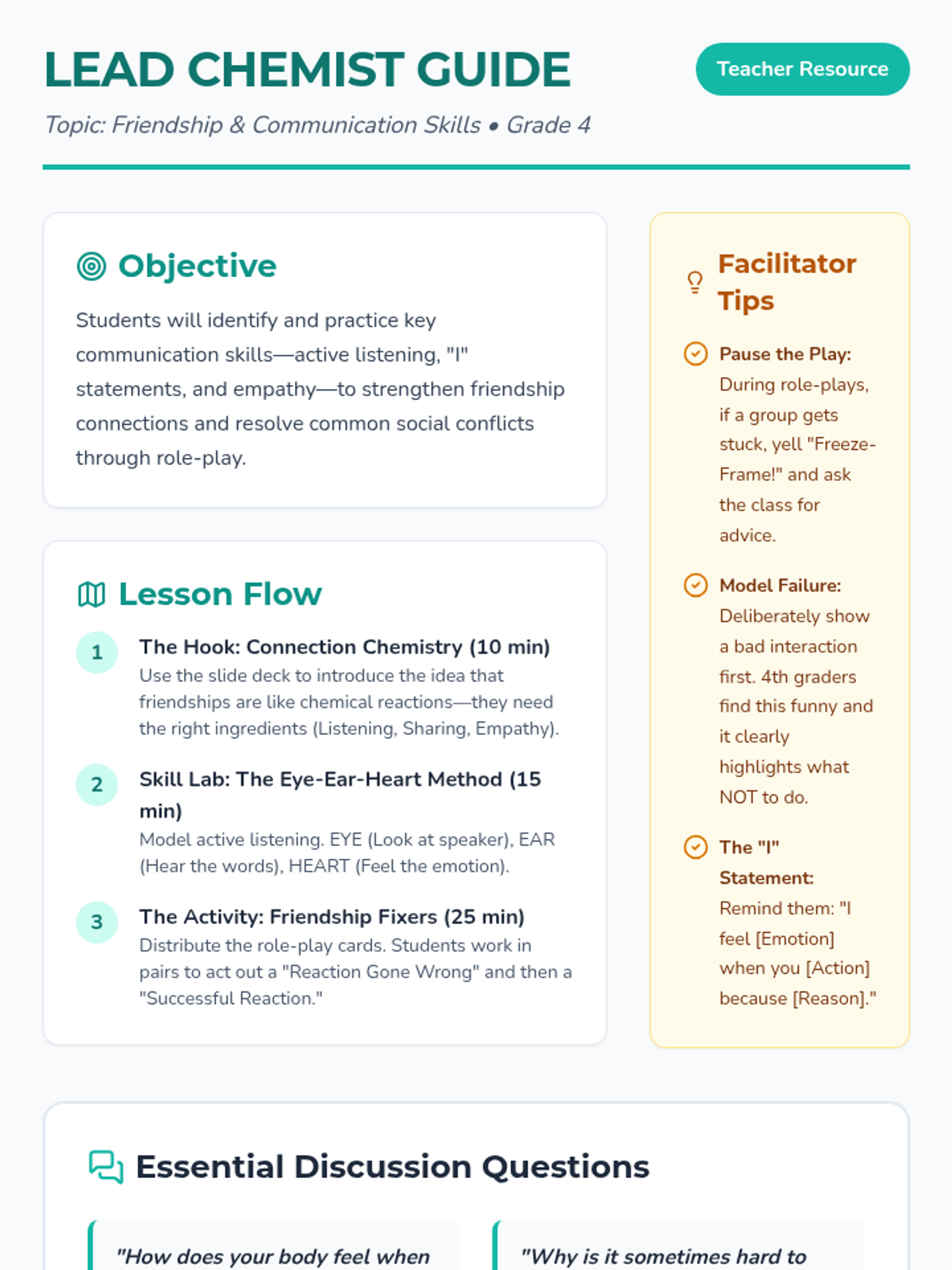 A lesson focused on teaching 4th graders the essential skills for building and maintaining friendships through effective communication and empathy. Students will engage in role-playing scenarios to practice active listening and conflict resolution.