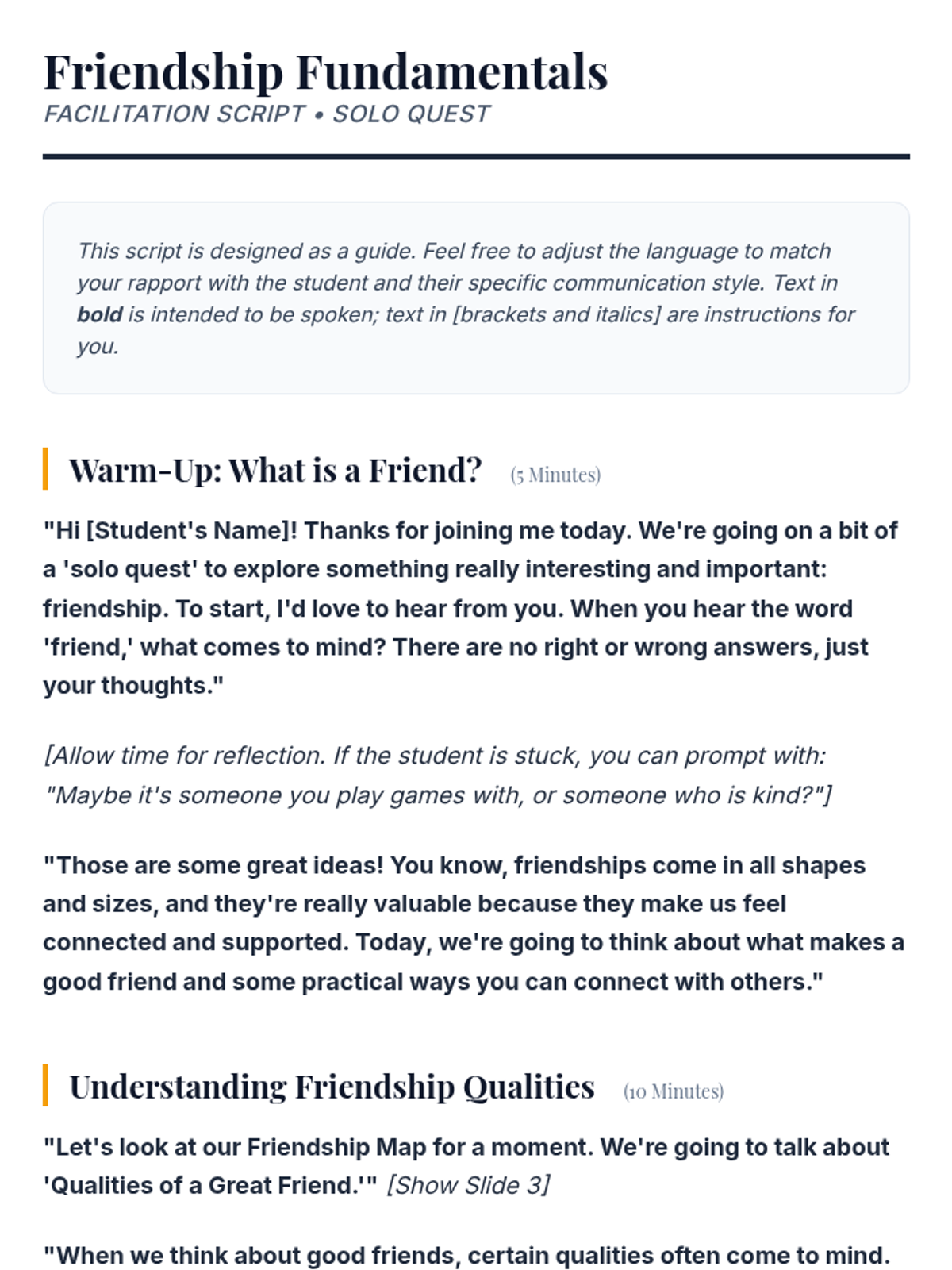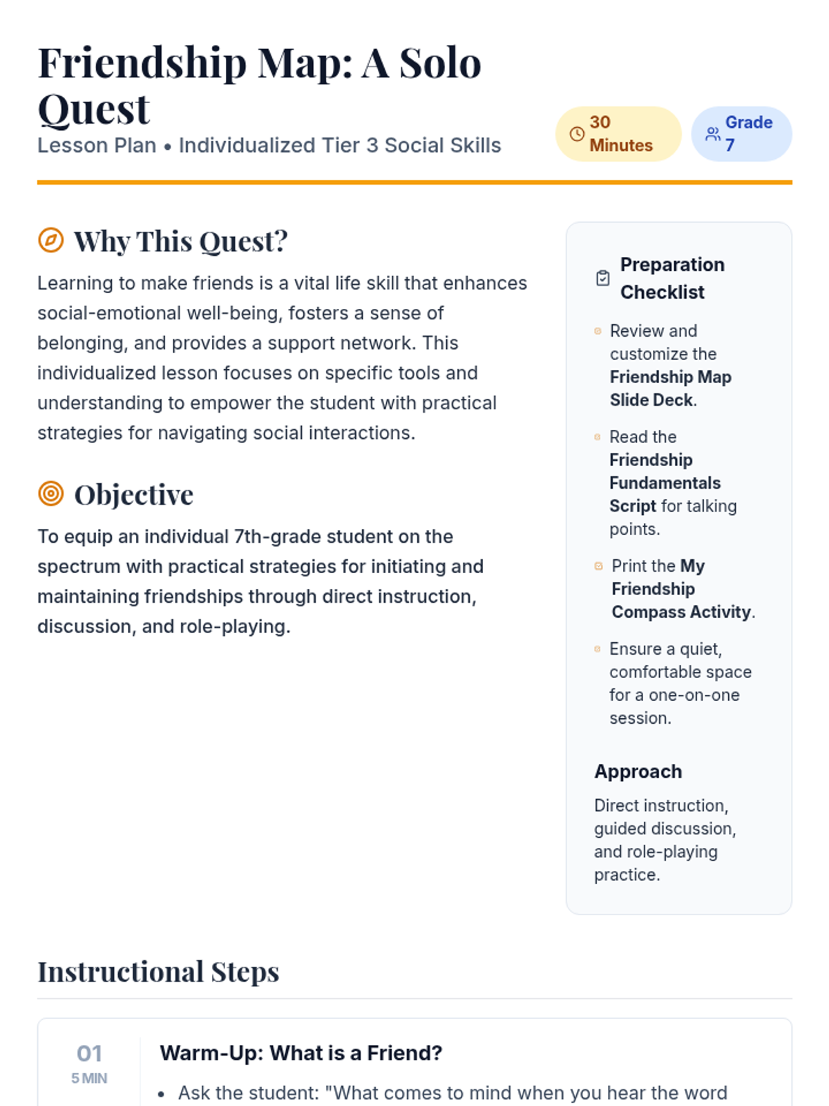 This individualized 30-minute Tier 3 lesson for 7th-grade students on the autism spectrum uses a 'solo quest' theme to teach practical strategies for initiating and maintaining friendships. It includes direct instruction on friendship qualities, guided practice for social scenarios, and a goal-setting activity to help students navigate their social environment.