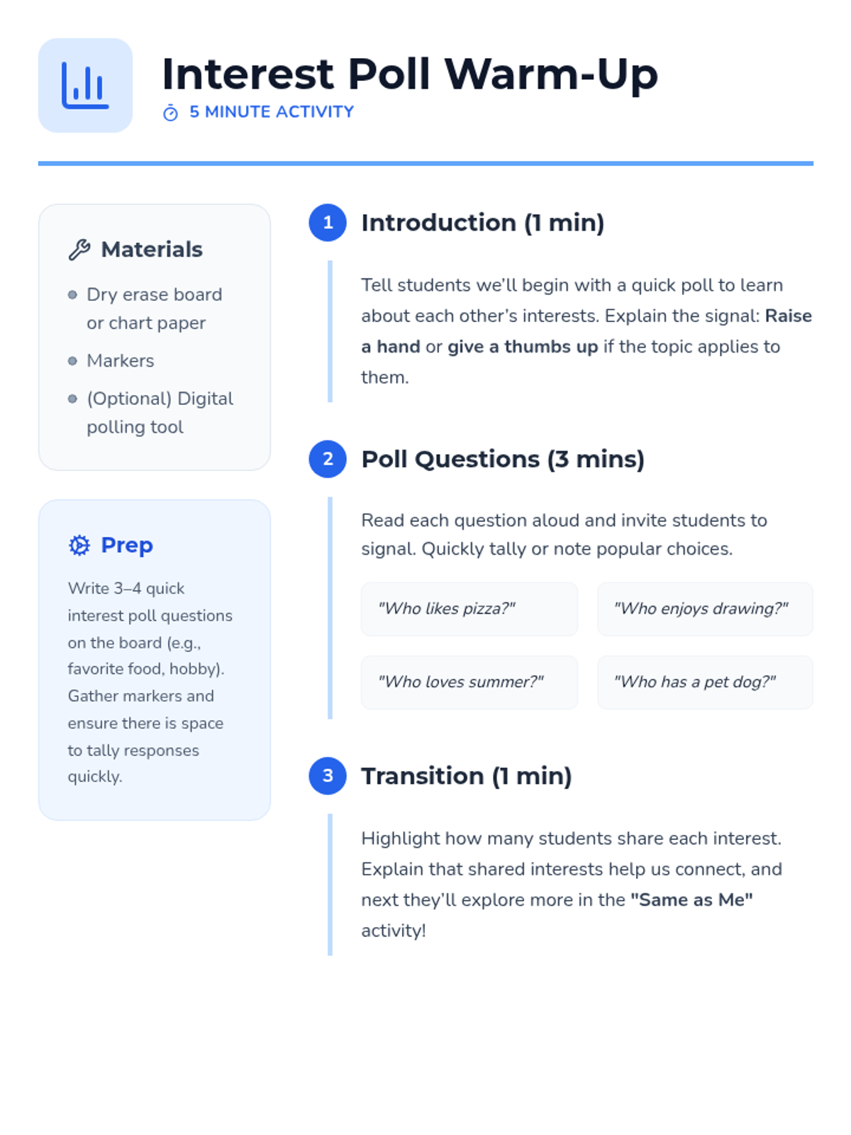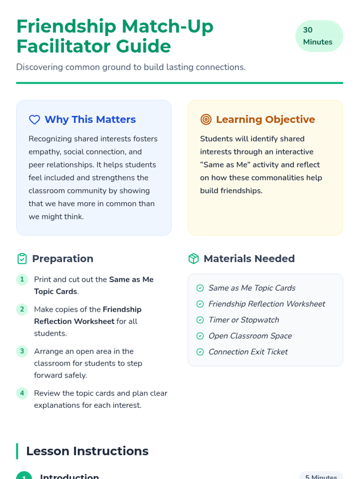 A 30-minute Tier 1 elementary lesson where students discover shared interests through an interactive 'Same as Me' activity to build social connections and empathy.