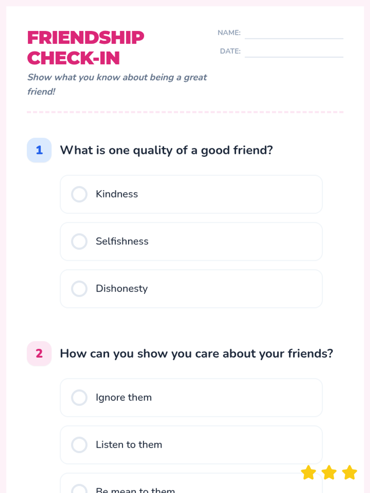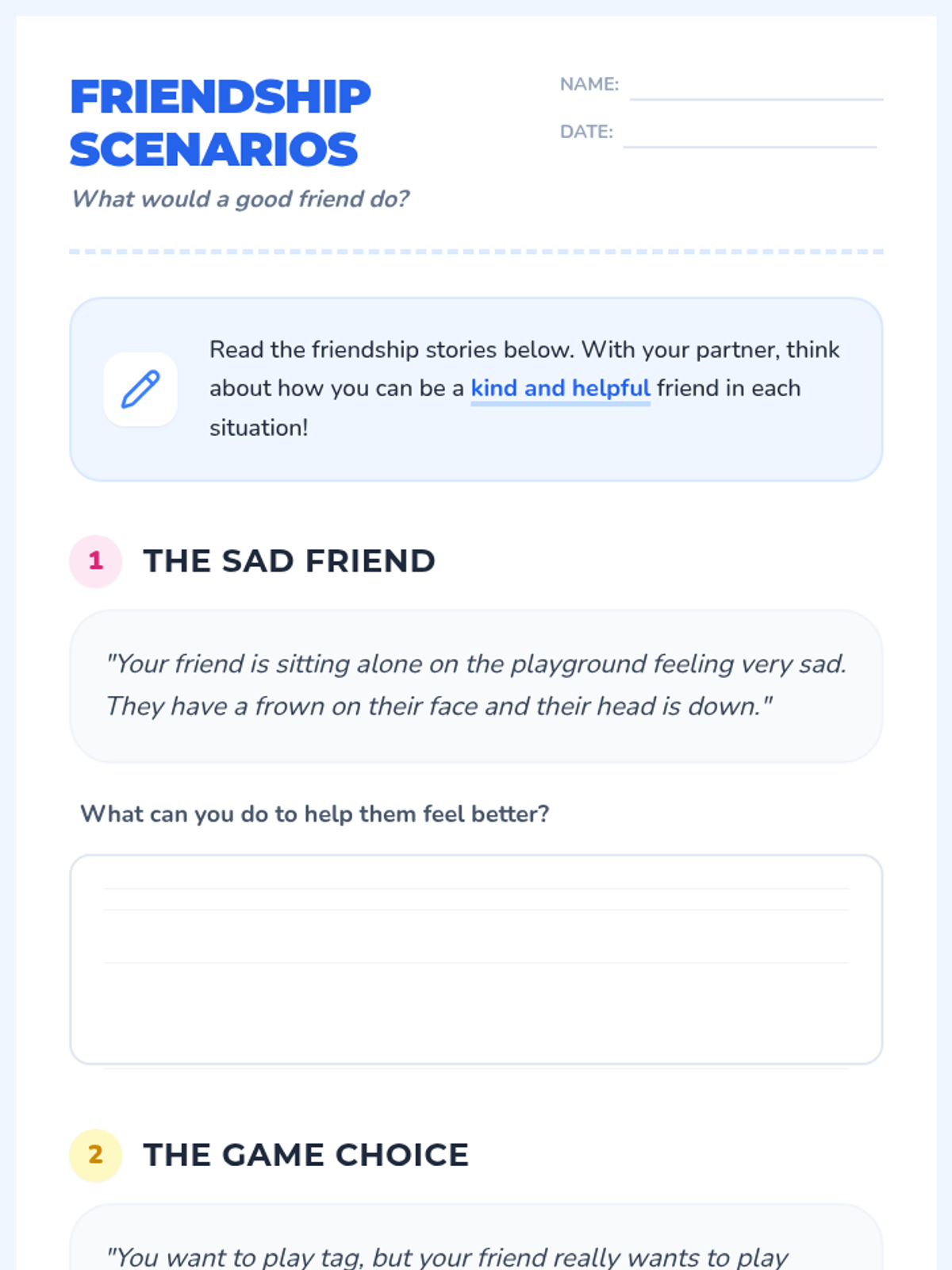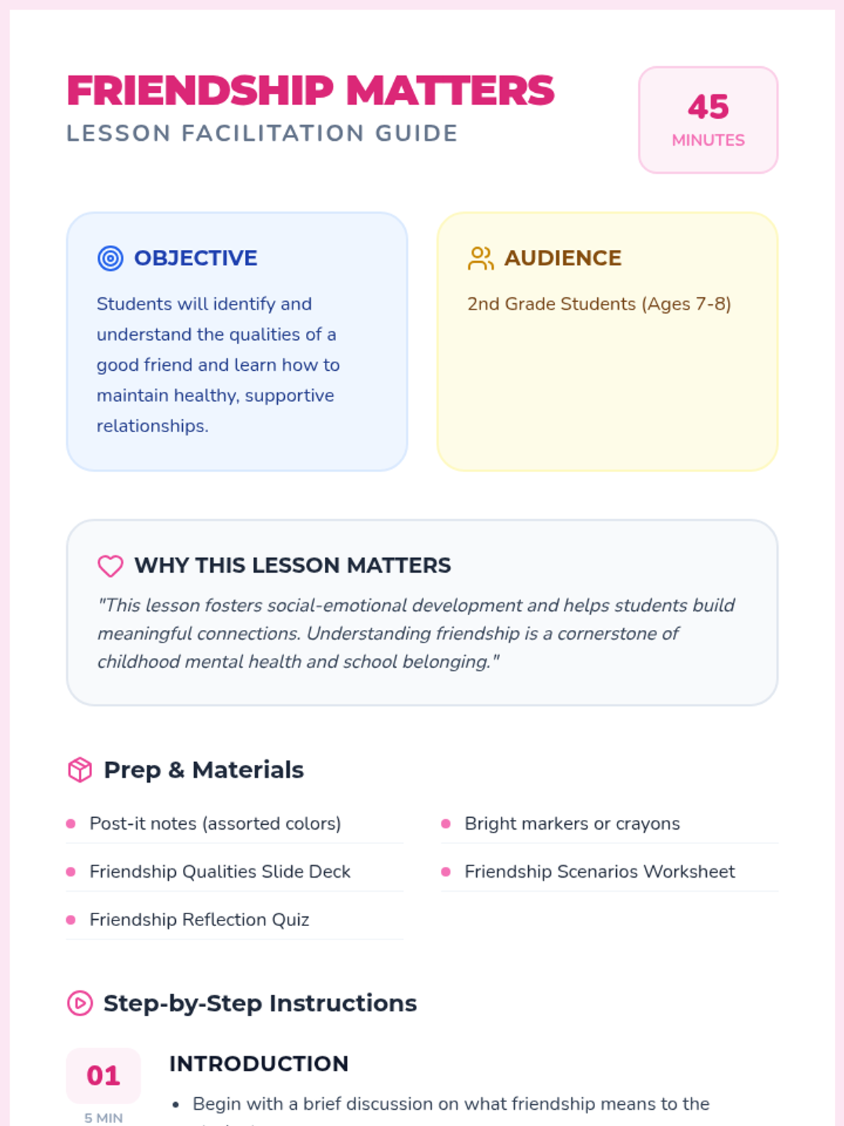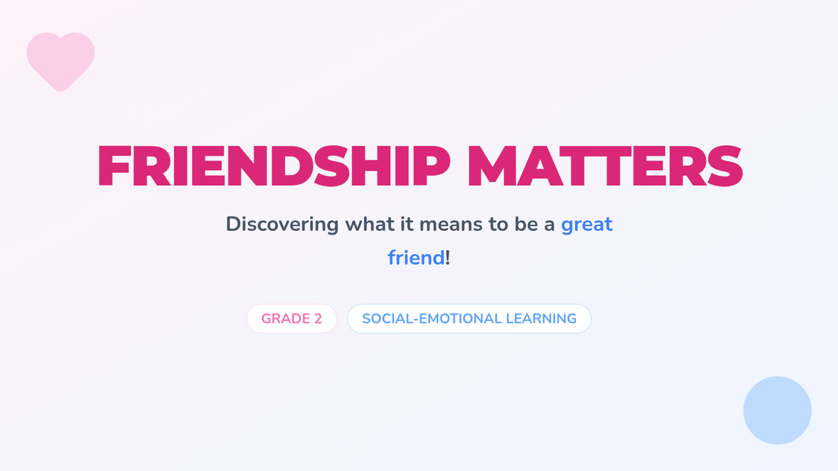 This lesson helps 2nd-grade students understand the importance of friendships in mental health. Through engaging activities, students will explore the qualities of a good friend and learn how to maintain healthy relationships.