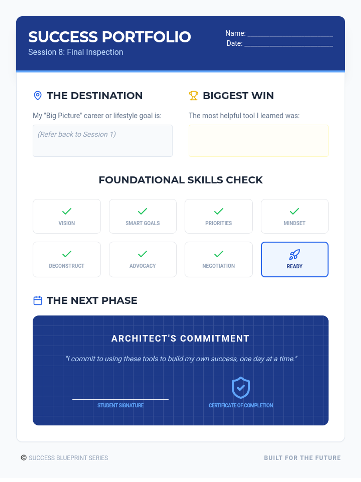 Review of progress, reflection on growth, and finalization of the personal Success Blueprint.