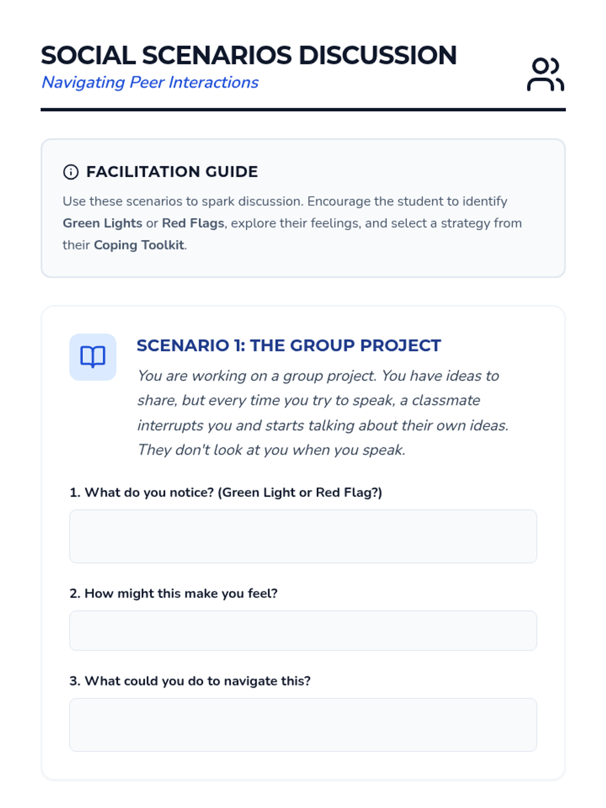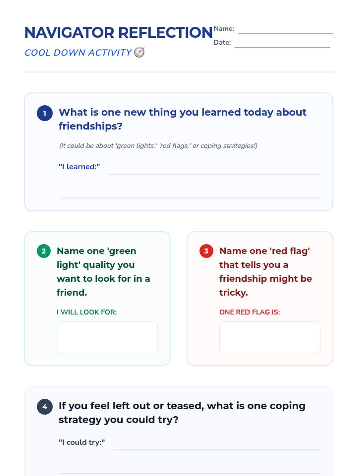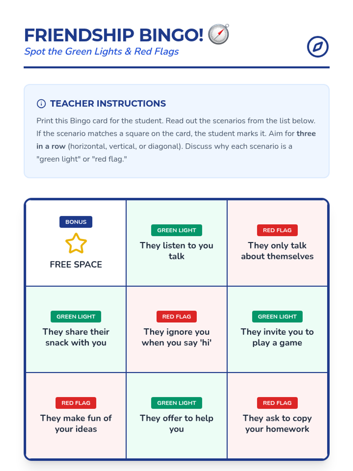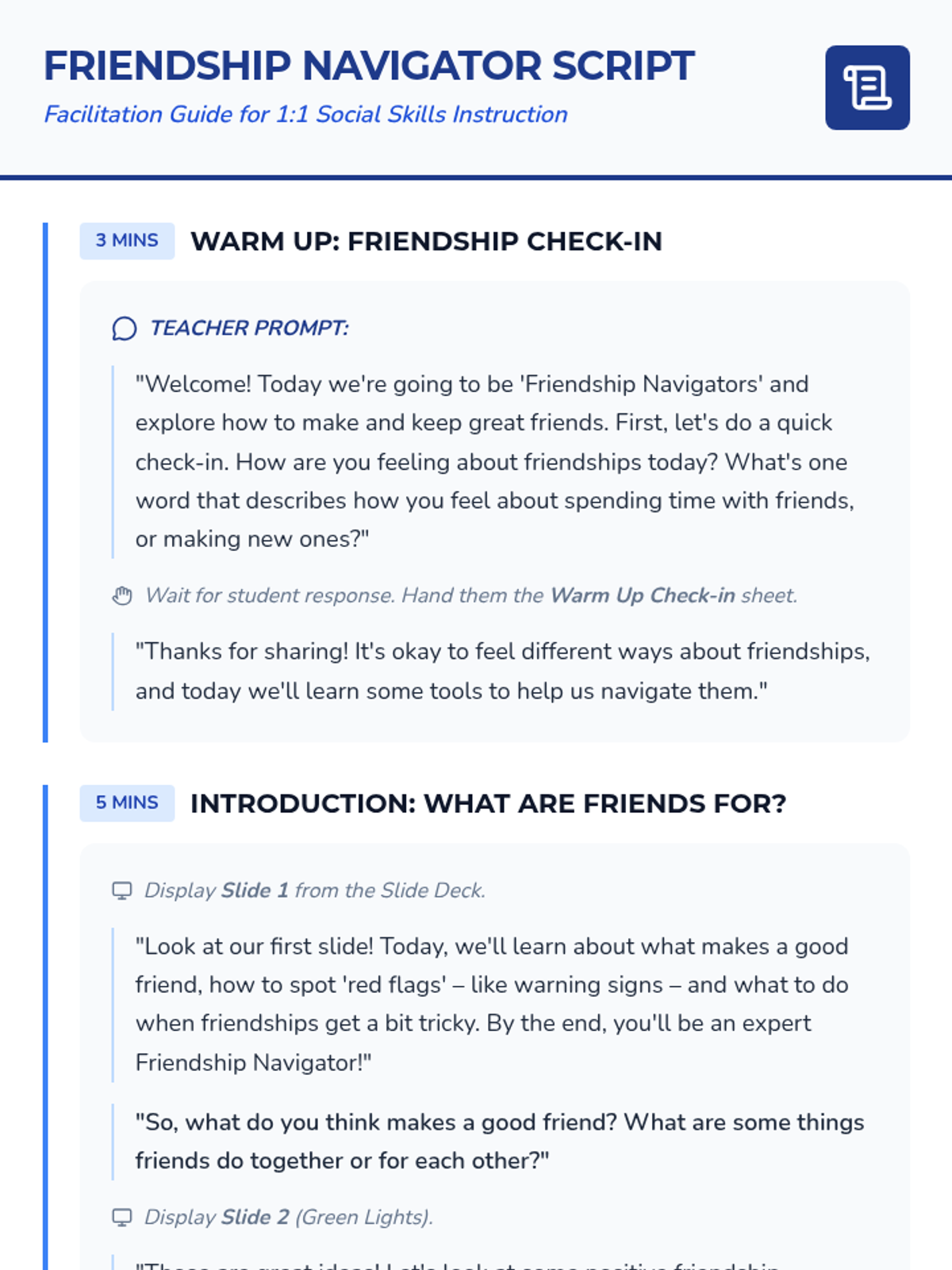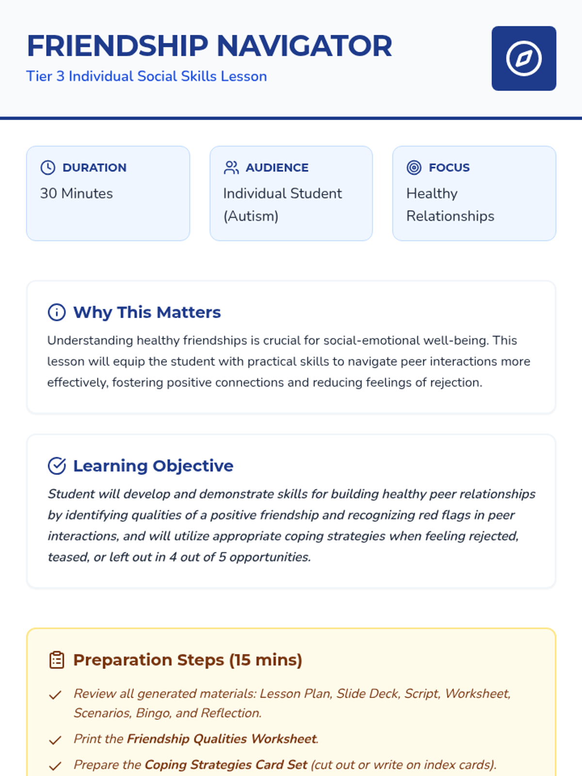 A 30-minute Tier 3 individual lesson for students with autism to identify healthy friendship qualities, recognize red flags, and practice coping strategies for social challenges.