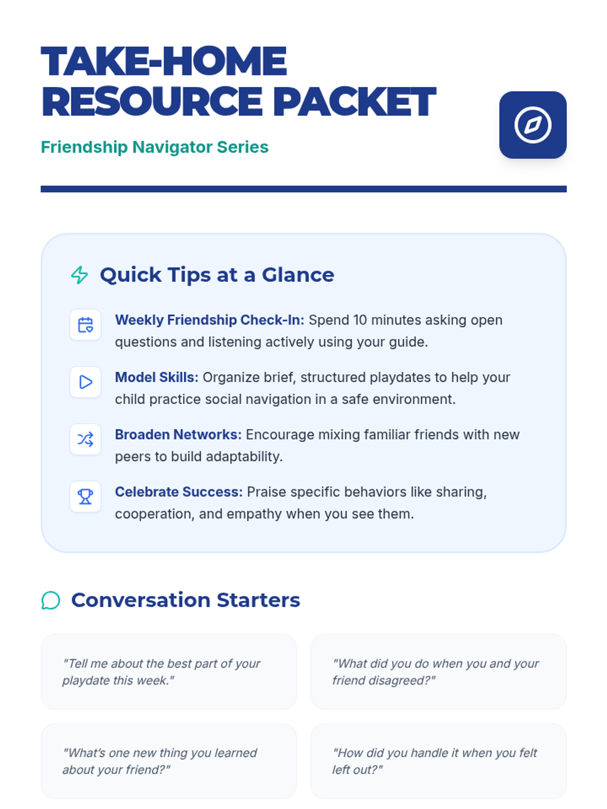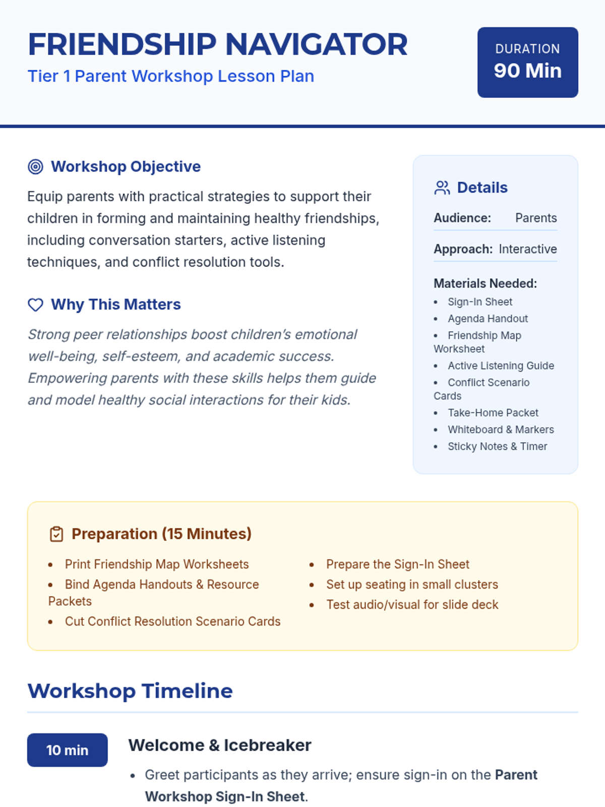 A 90-minute Tier 1 parent workshop designed to equip parents with strategies for supporting their children's healthy friendships and conflict resolution skills.