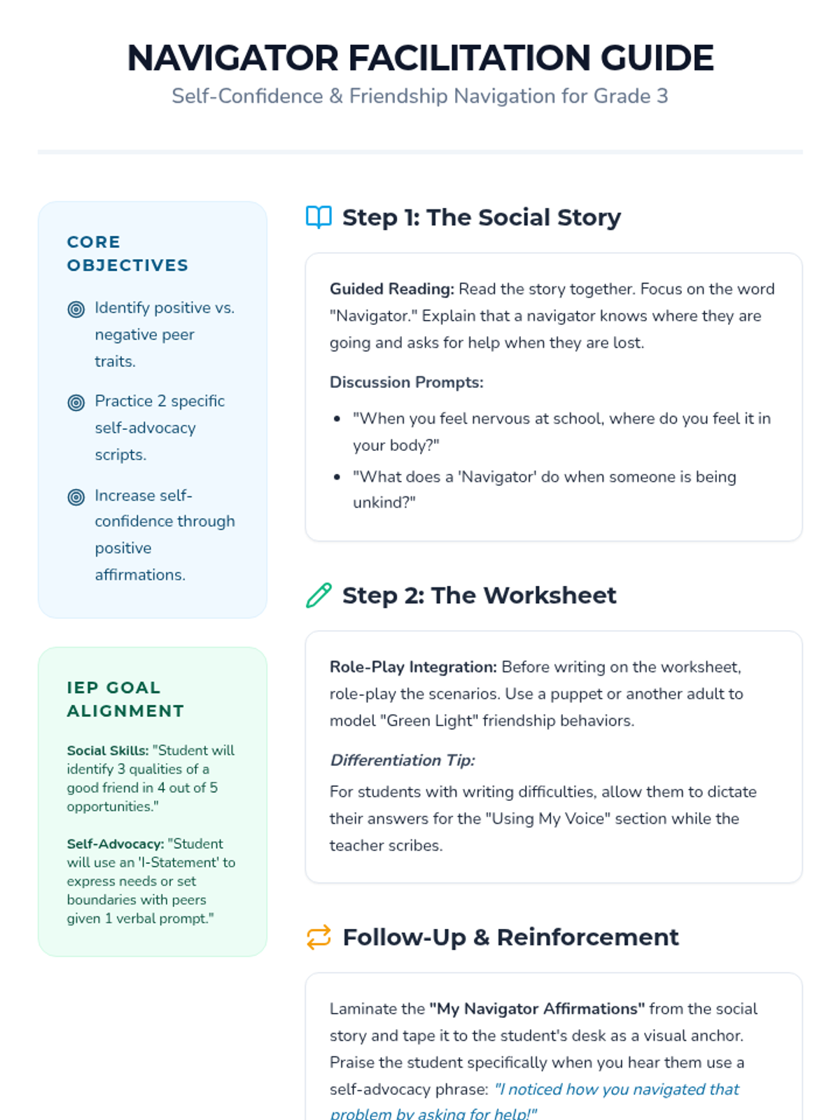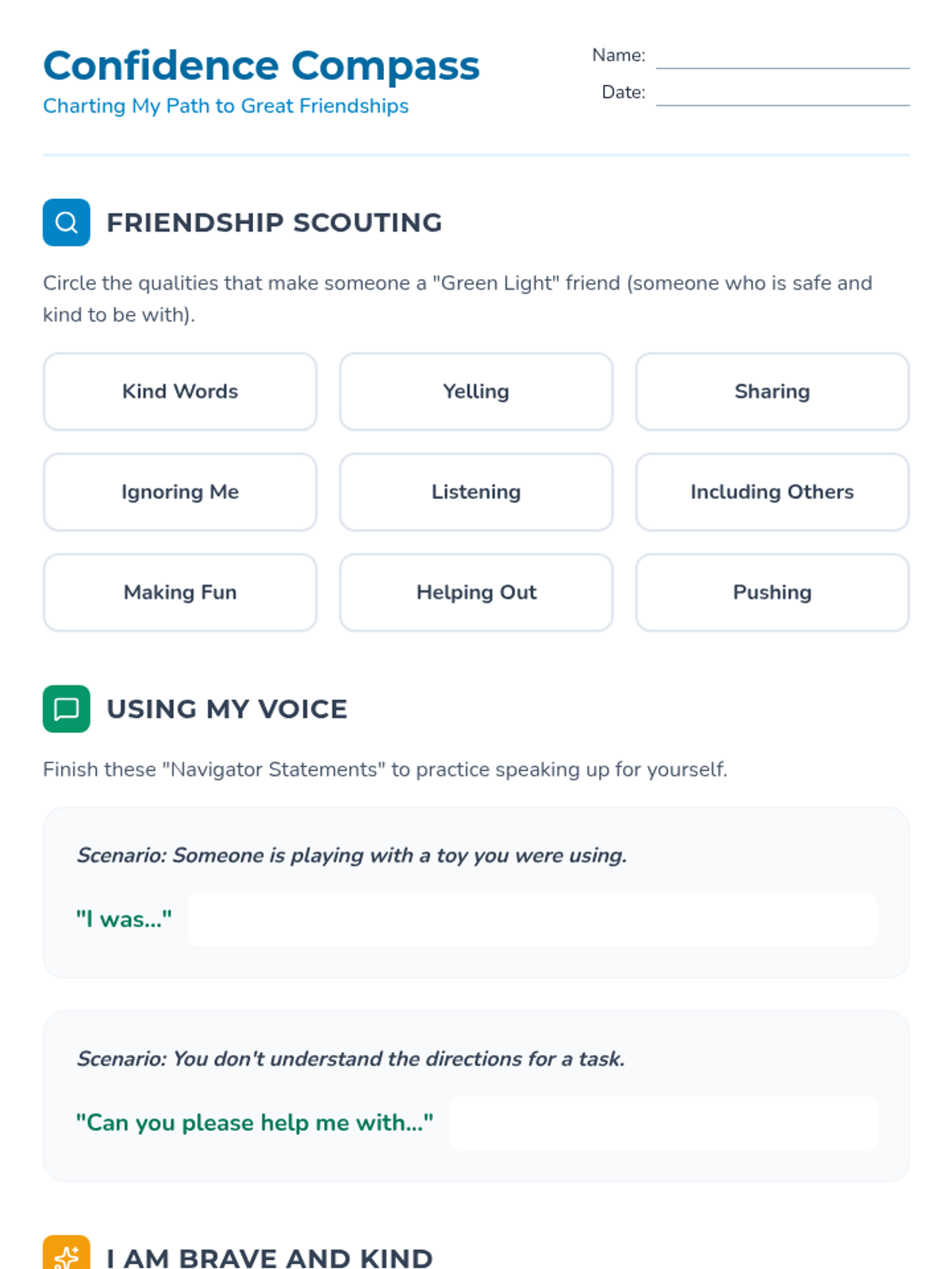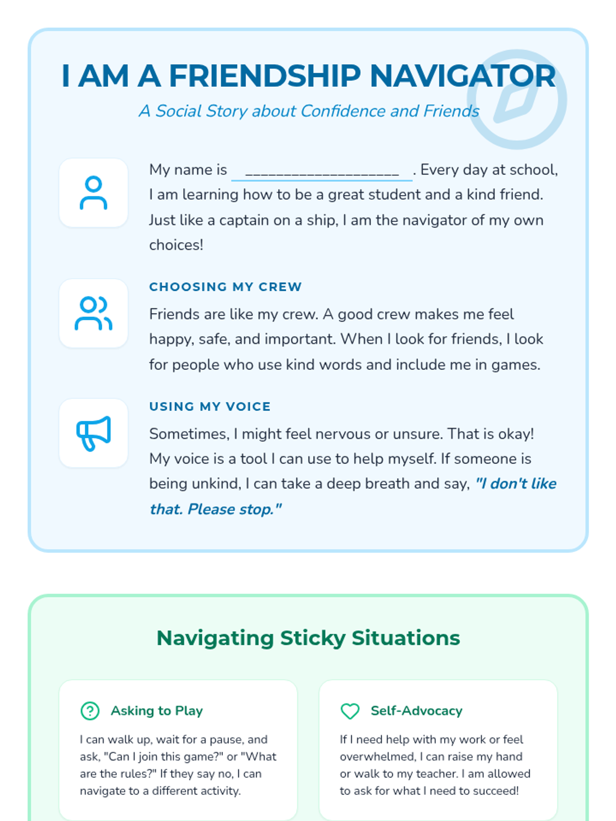 A lesson designed for 3rd-grade students, particularly those with IEPs, to build self-confidence and learn practical strategies for navigating peer relationships and self-advocacy. This lesson uses a social story and interactive worksheet to make abstract social concepts more concrete and manageable.