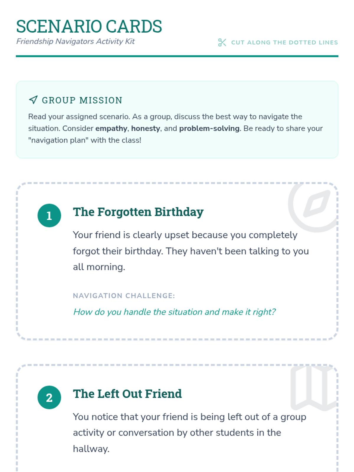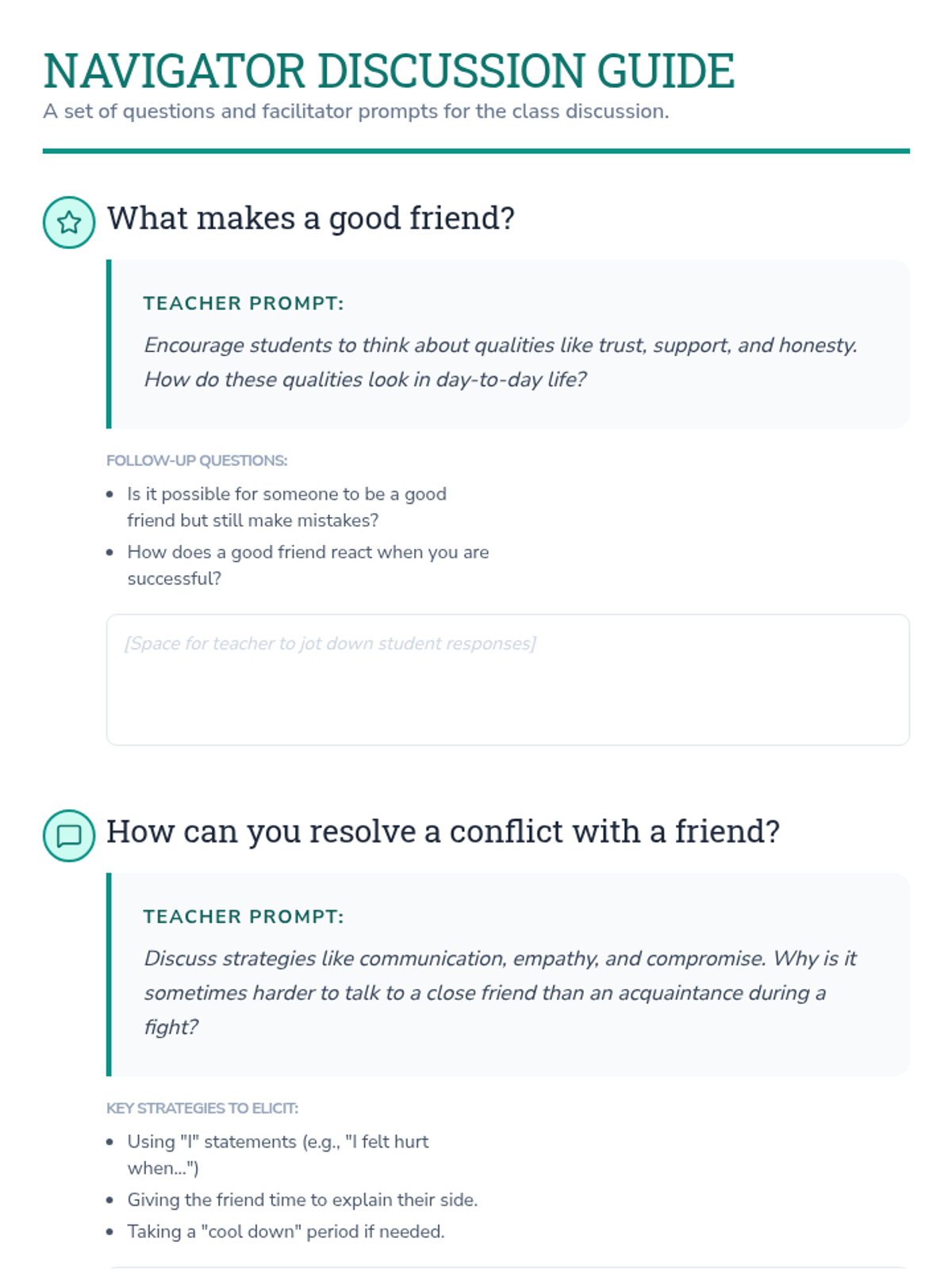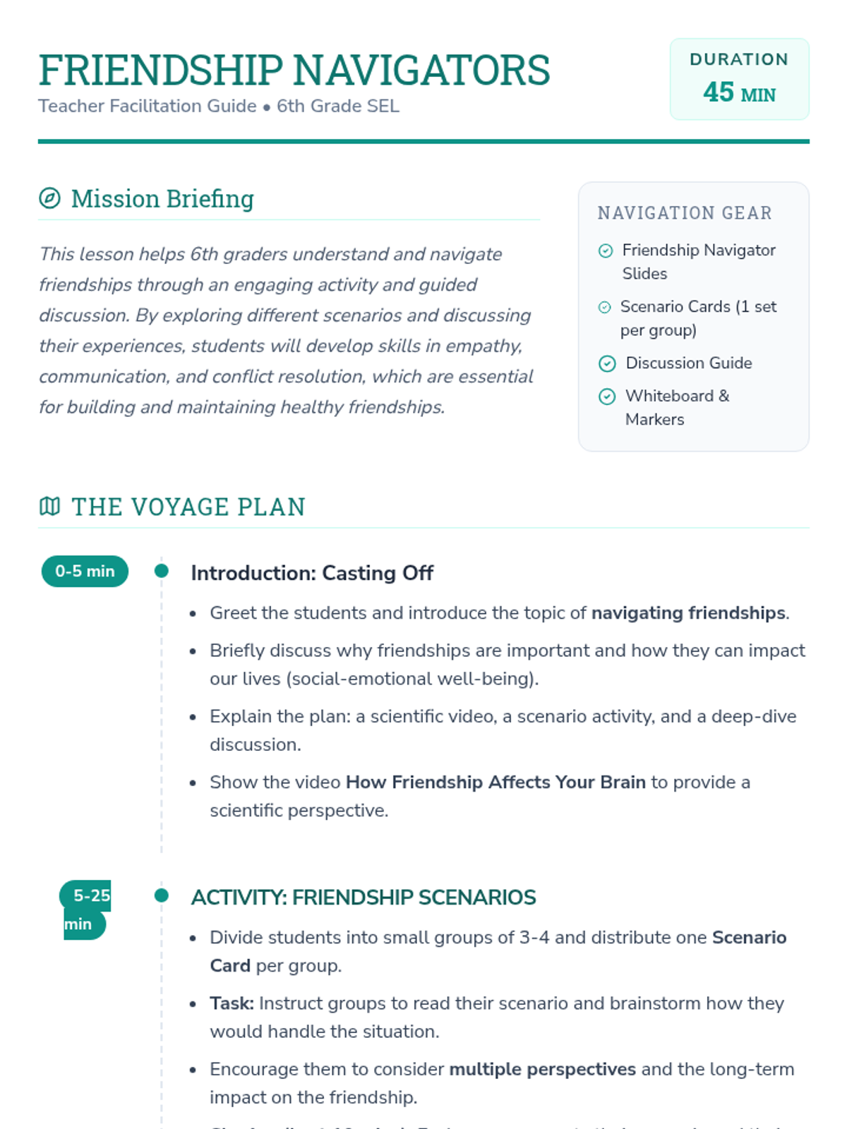 A 45-minute social-emotional learning lesson for 6th graders focused on empathy, communication, and conflict resolution within friendships using a nautical navigator theme.