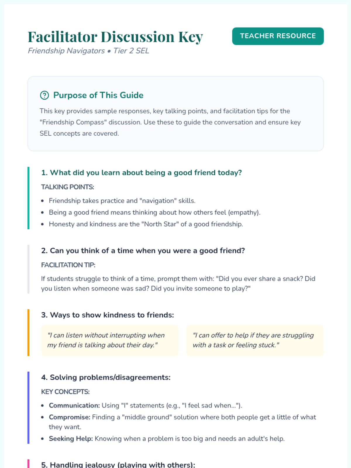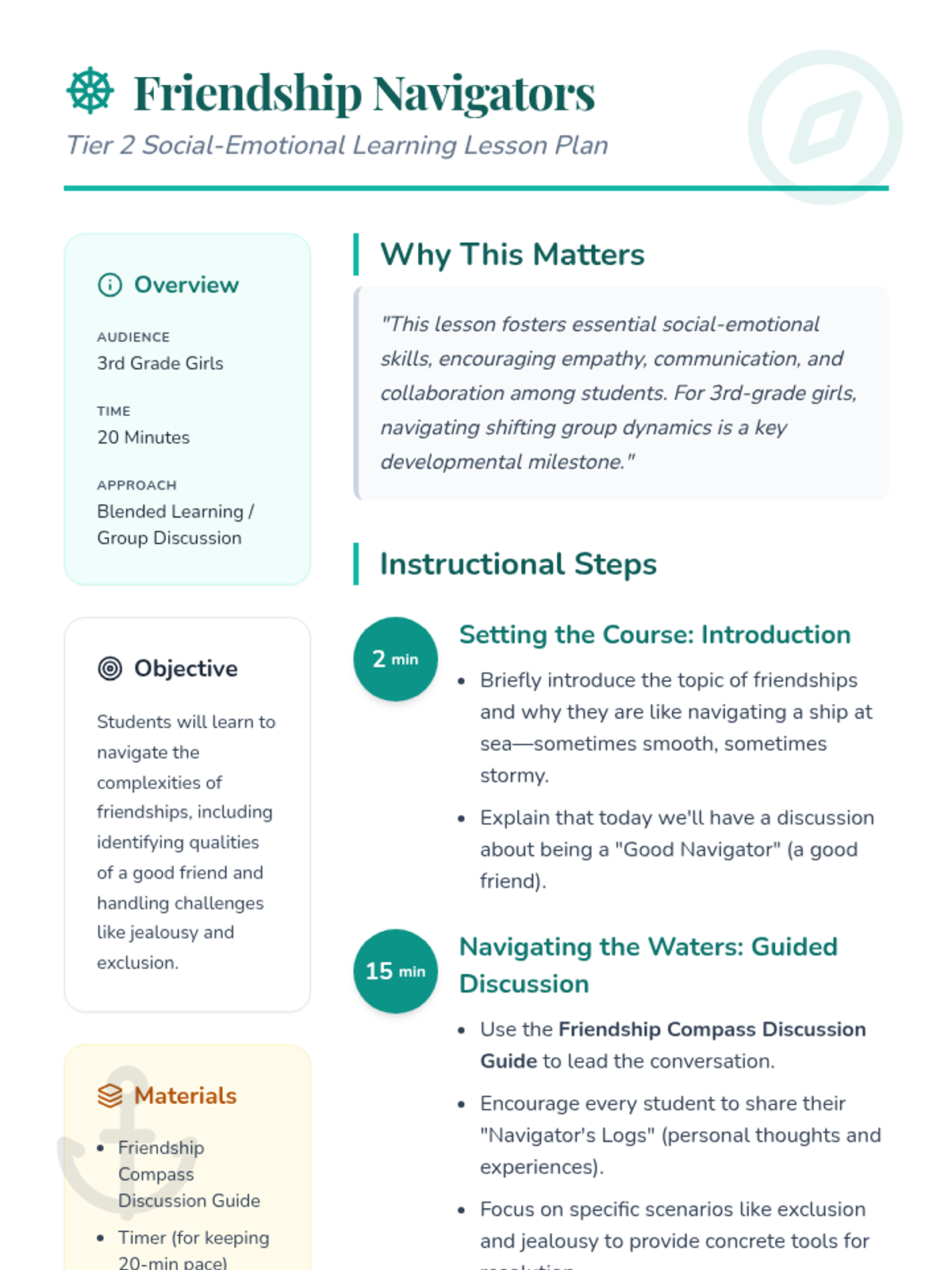 A Tier 2 SEL lesson for 3rd-grade girls focused on navigating friendship dynamics, identifying qualities of a good friend, and handling social challenges like jealousy and exclusion.