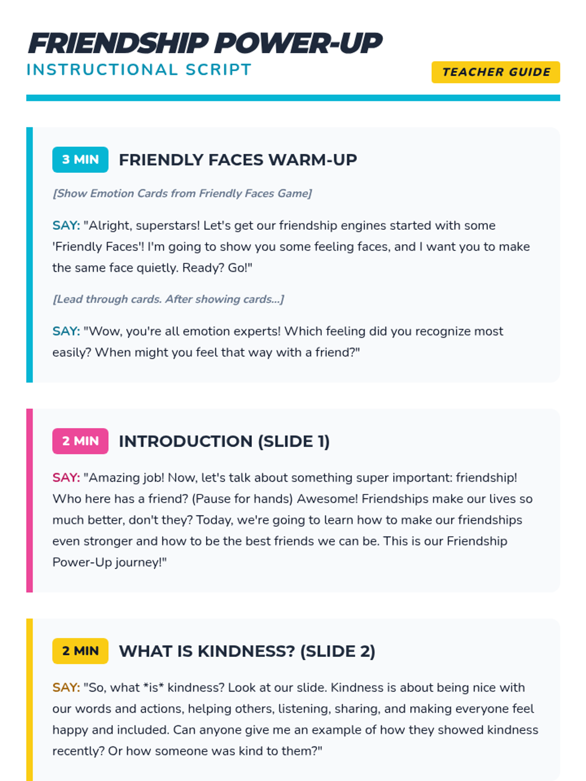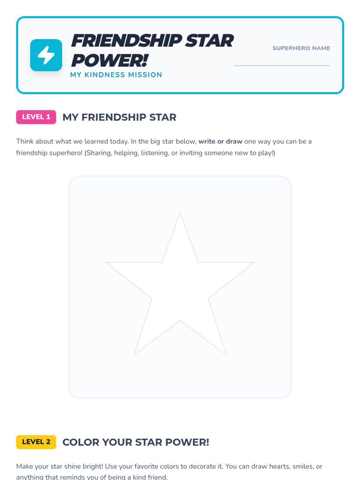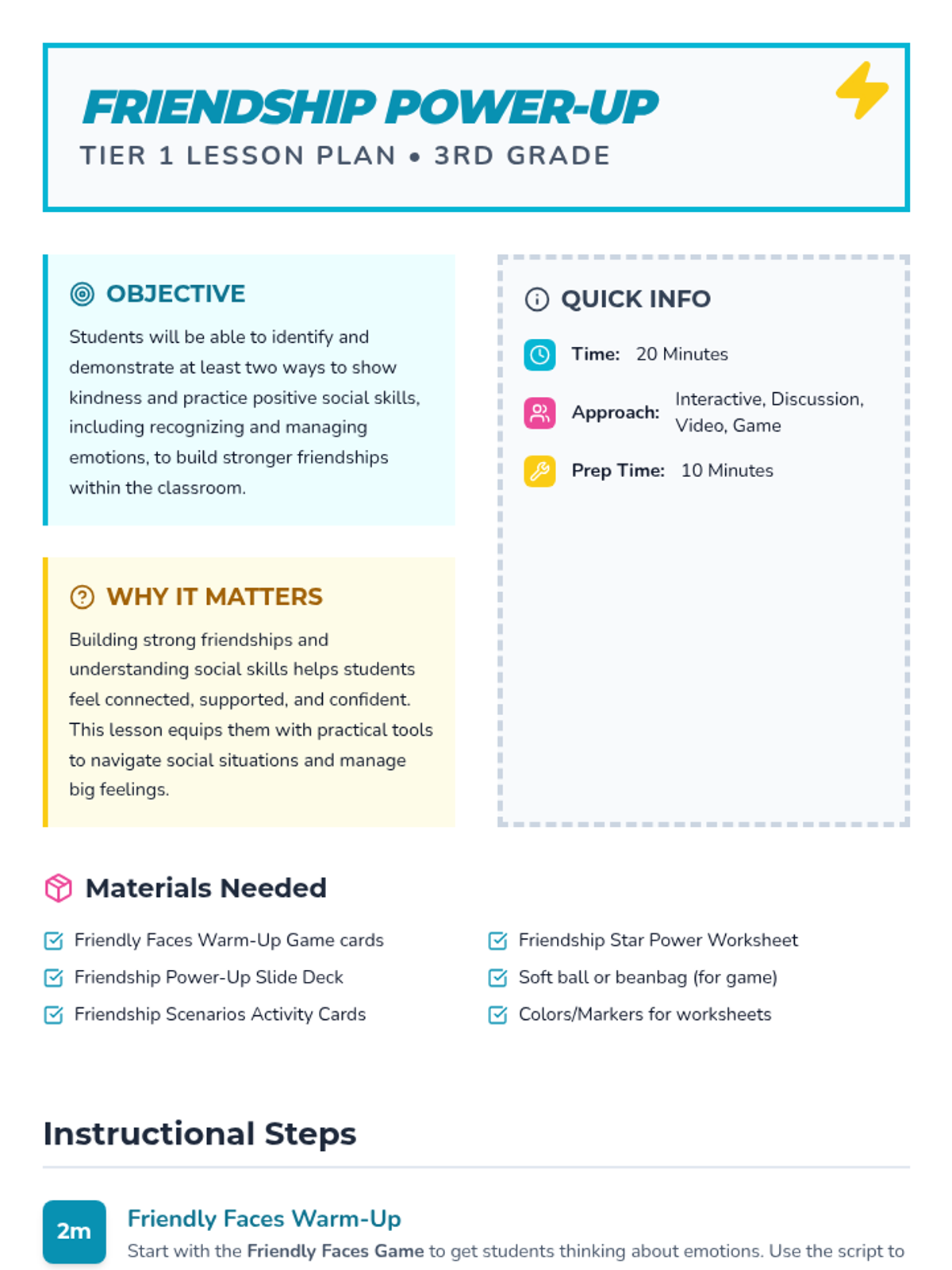 A high-energy, 20-minute Tier 1 lesson for 3rd graders focused on building friendships through kindness, emotional regulation, and social-emotional learning. Students engage in interactive games, discussions, and creative activities to "power up" their social skills.