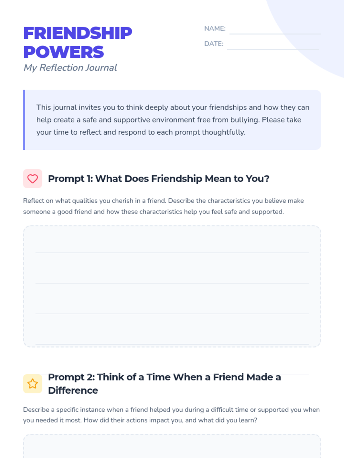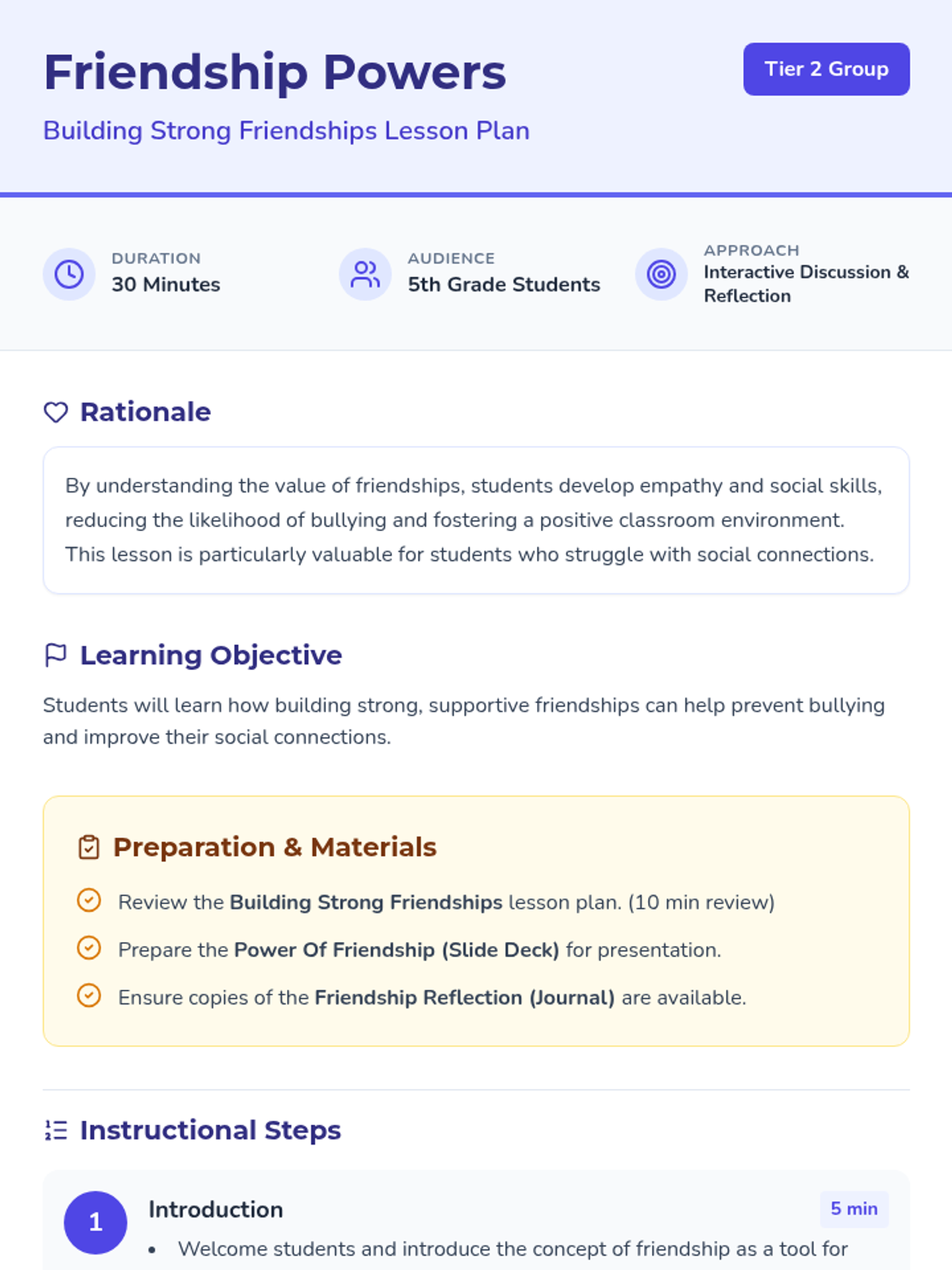 A Tier 2 social-emotional learning lesson designed for 5th-grade students to build strong, supportive friendships as a primary defense against bullying. Through interactive slides and personal reflection, students explore the qualities of good friends and their role in creating a safe community.