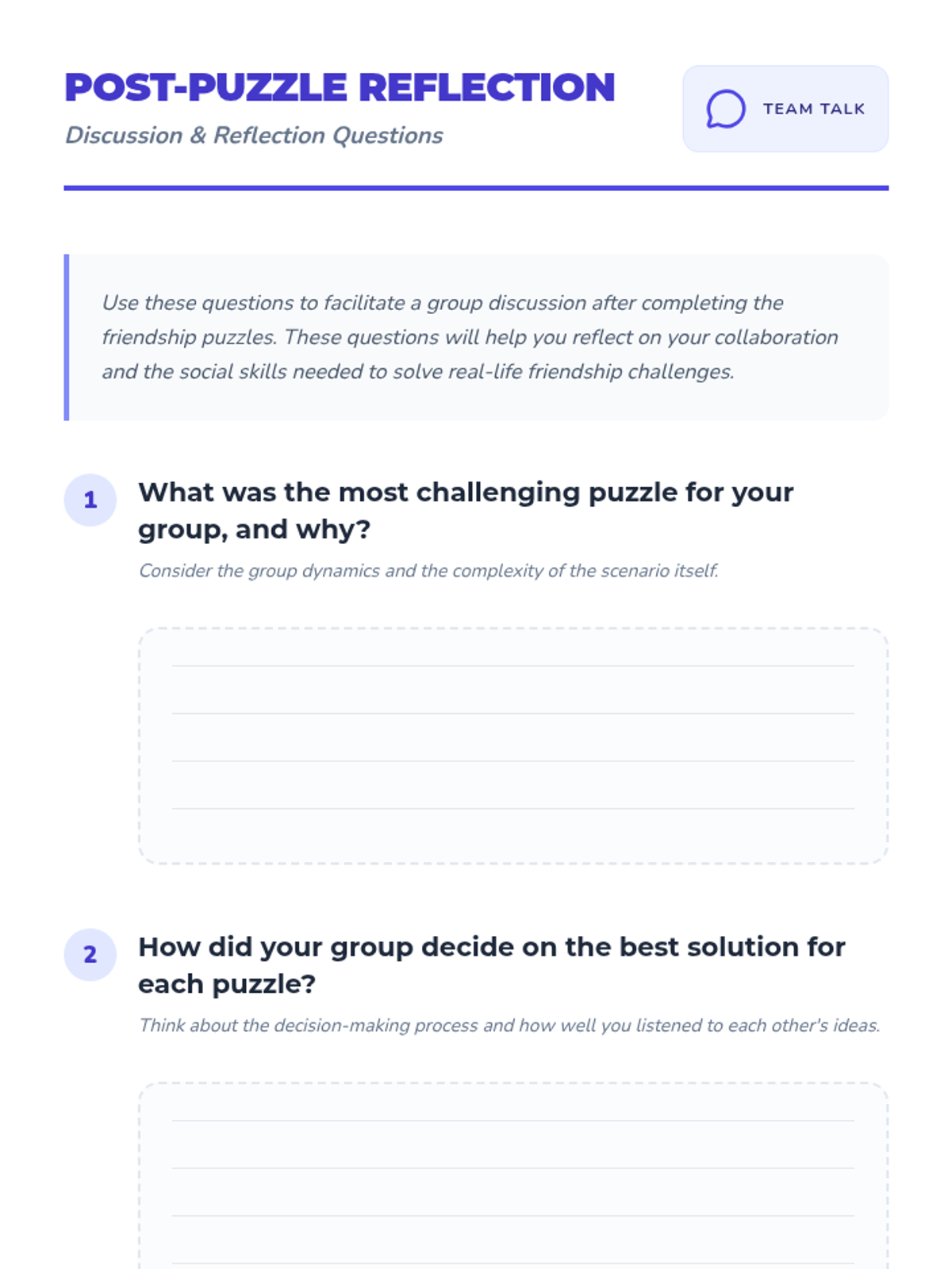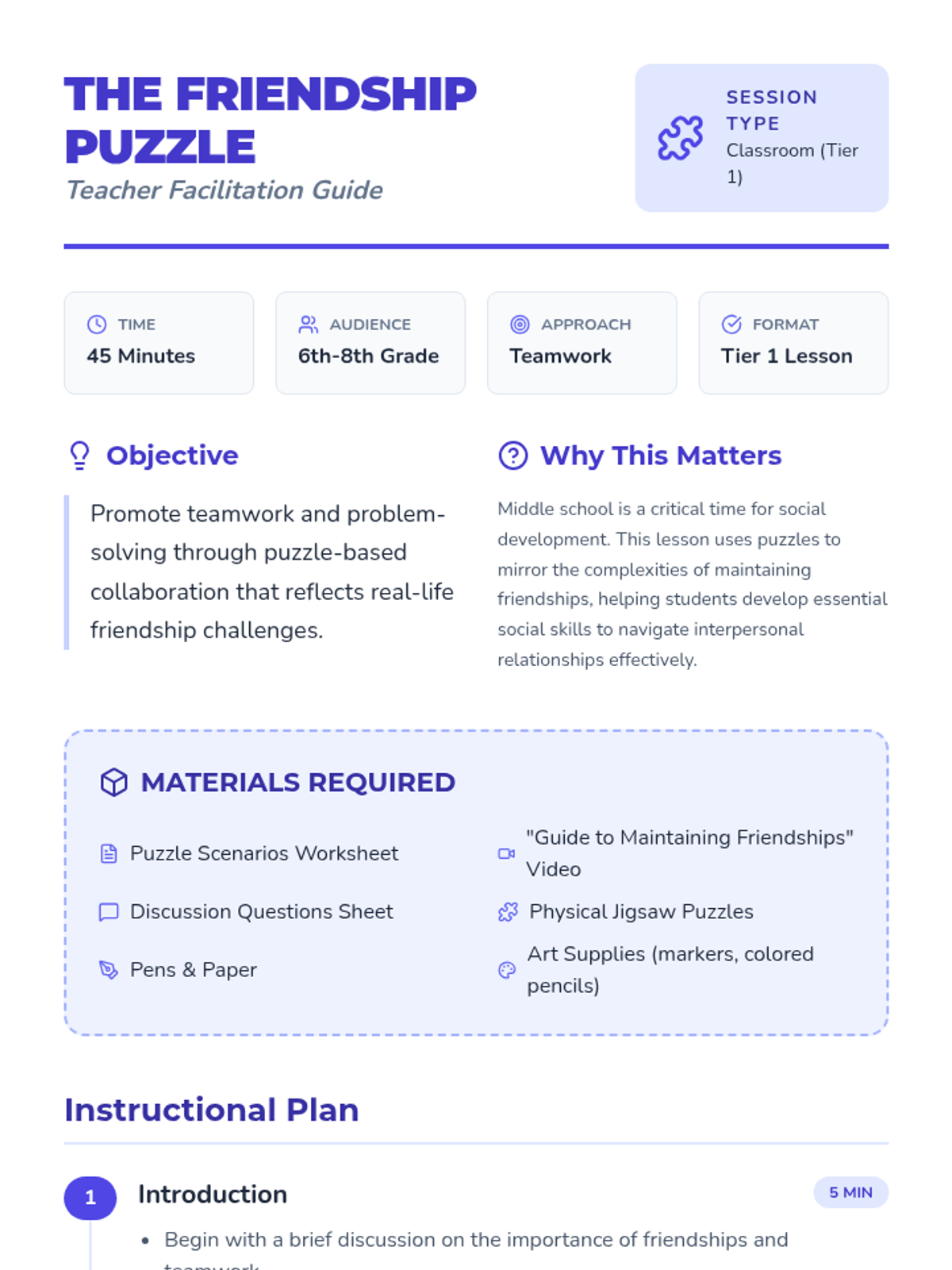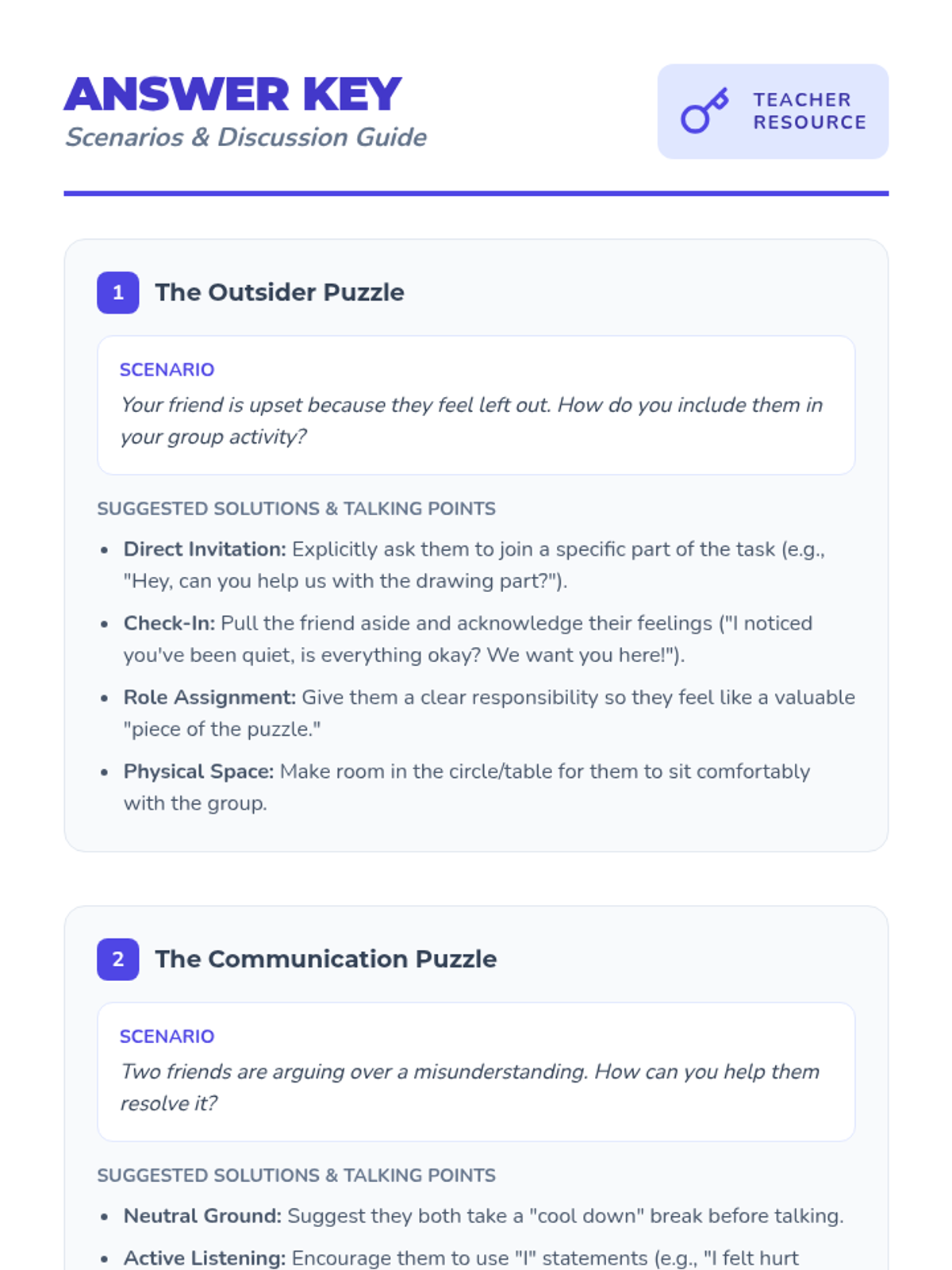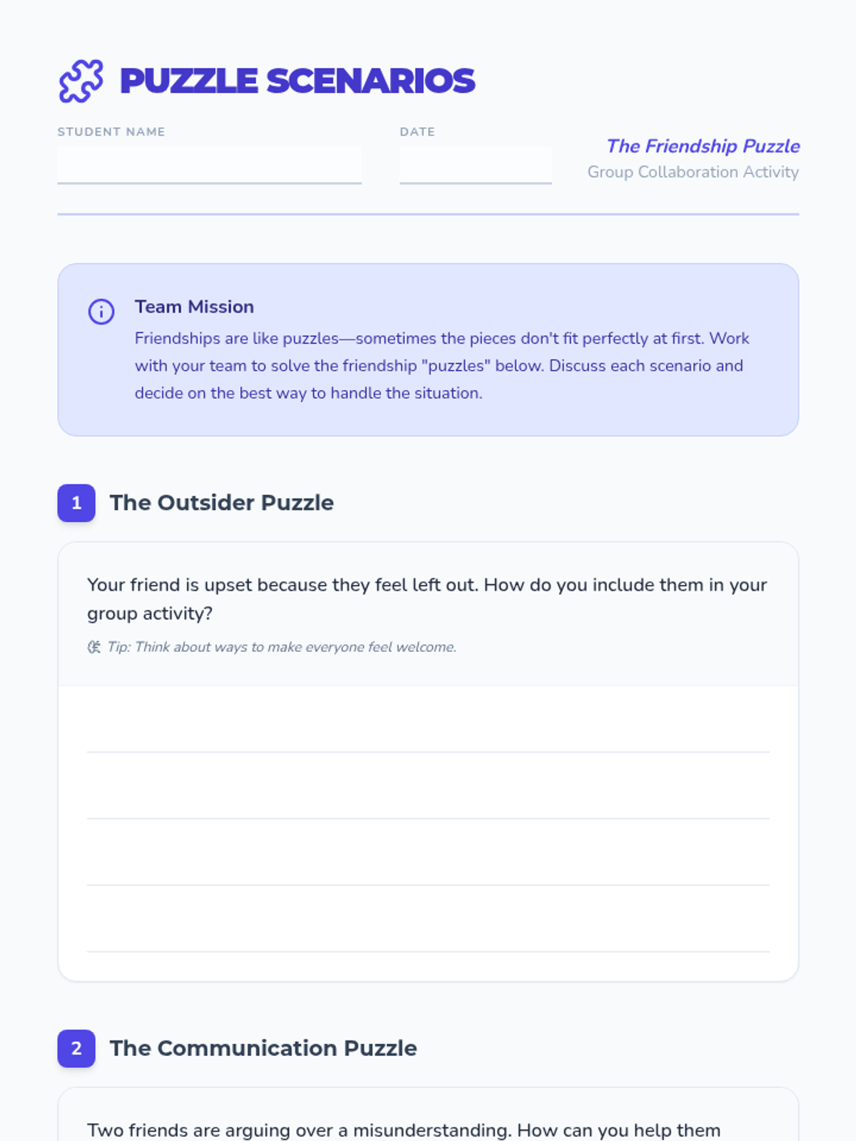A collaborative lesson for middle schoolers that uses puzzle-based scenarios to explore the complexities of friendship, communication, and conflict resolution.