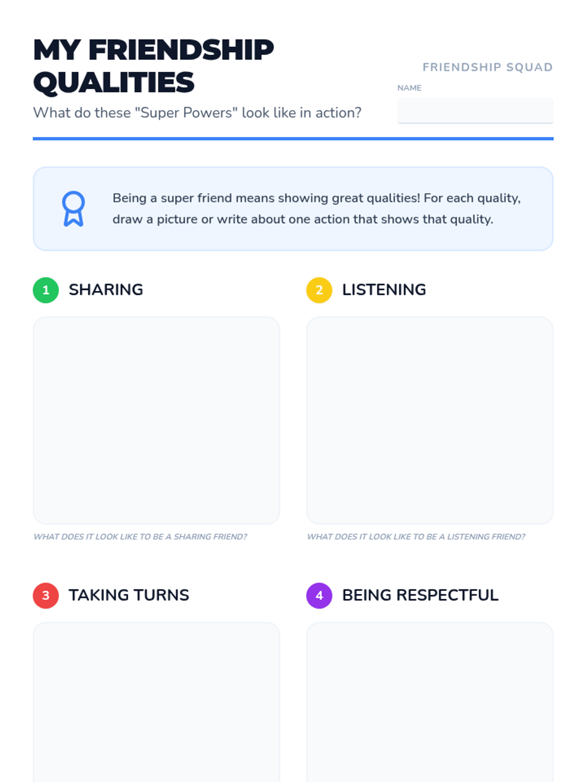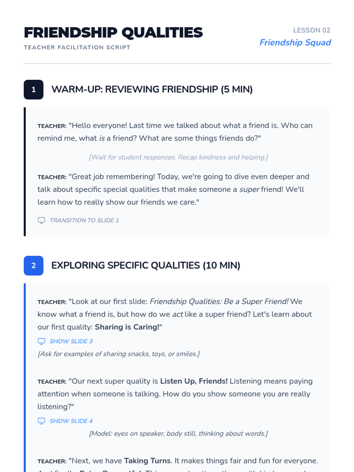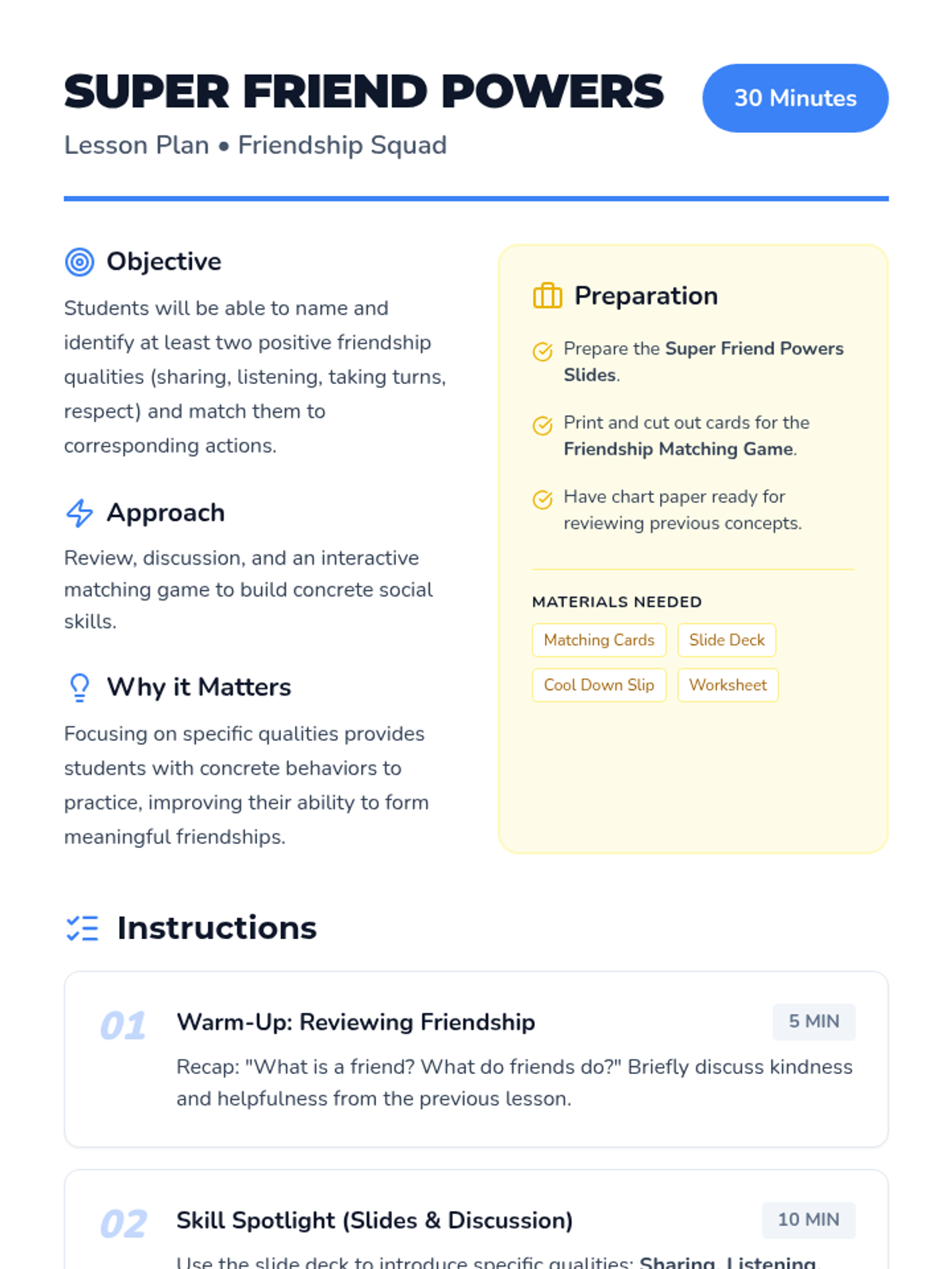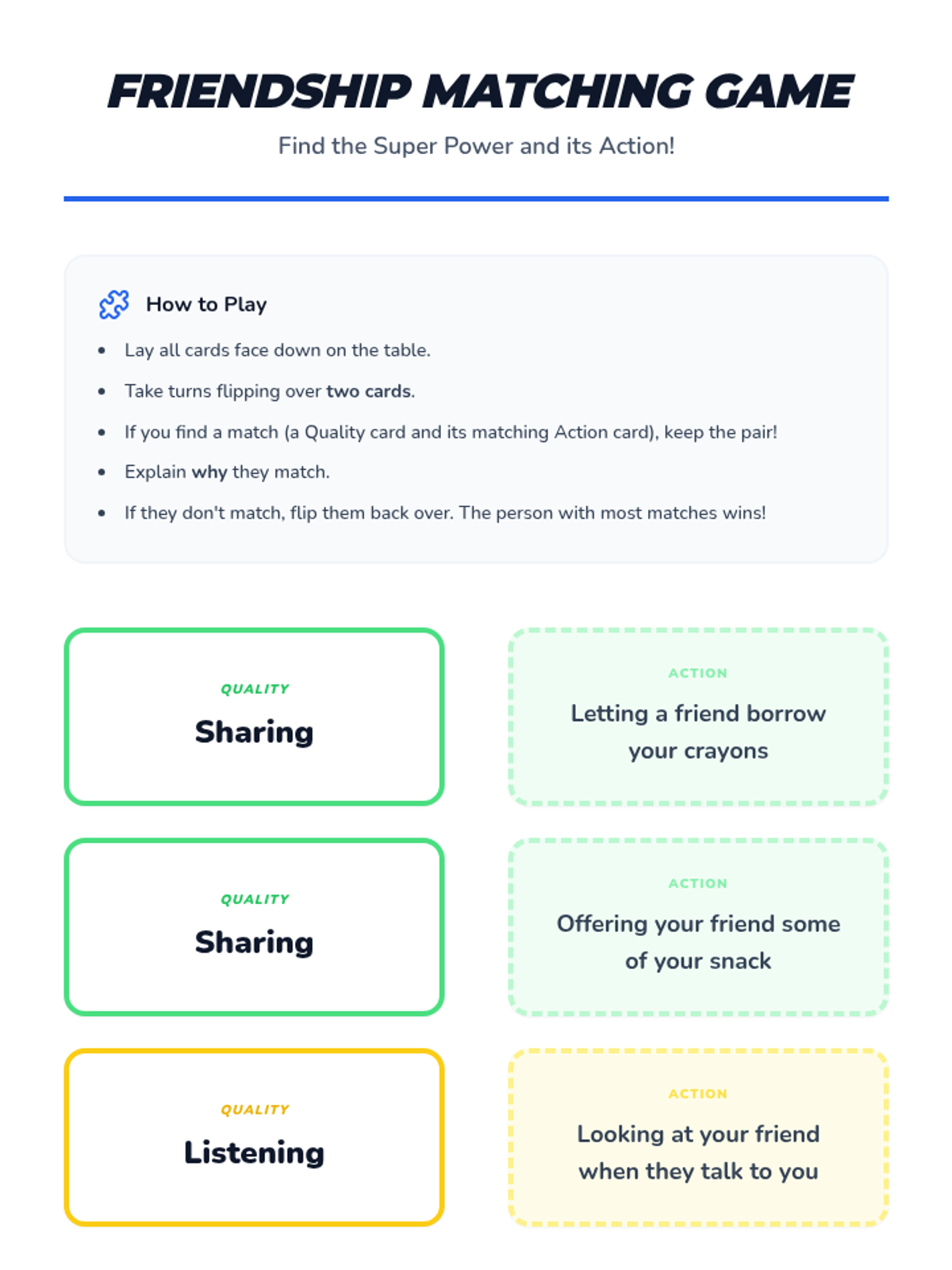 Building on the basics, this lesson focuses on concrete friendship skills such as sharing, listening, and taking turns through a matching game and interactive discussion.