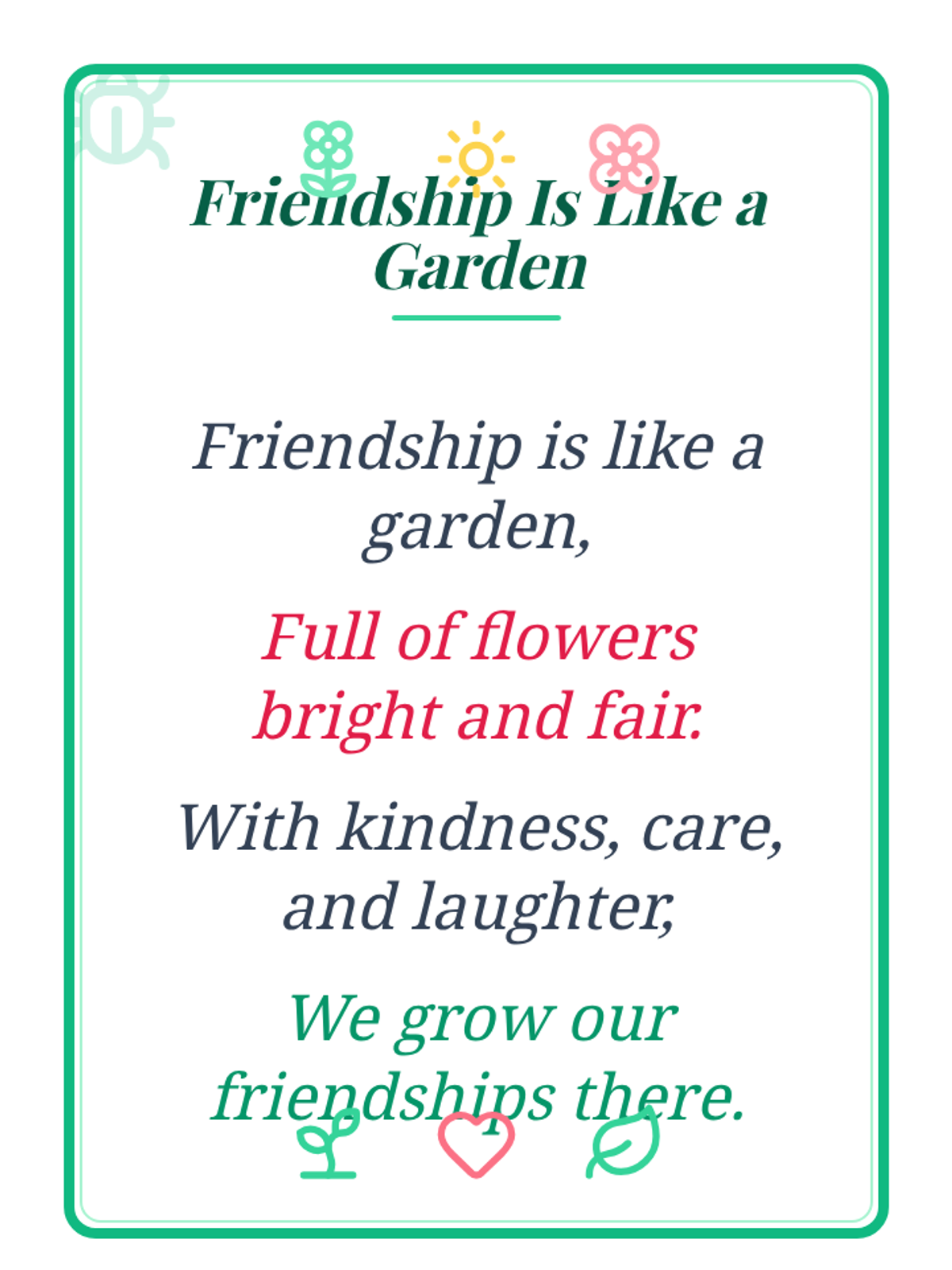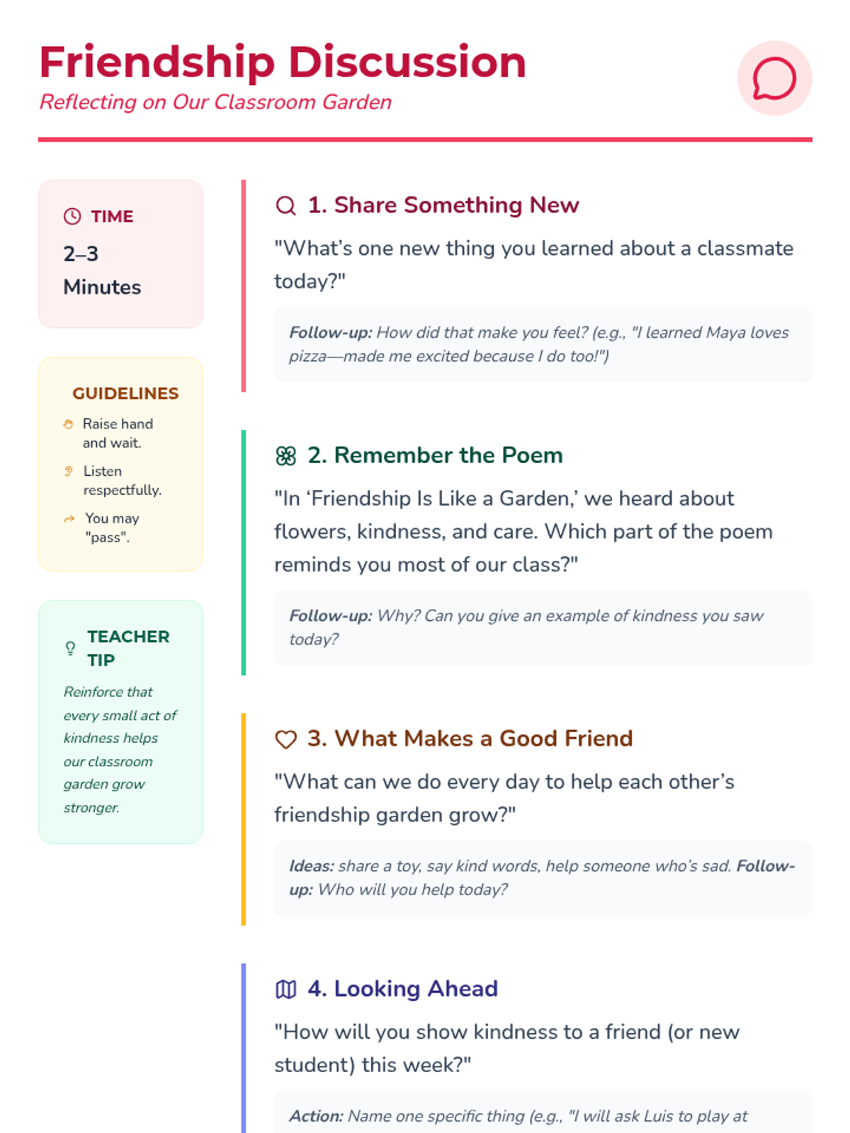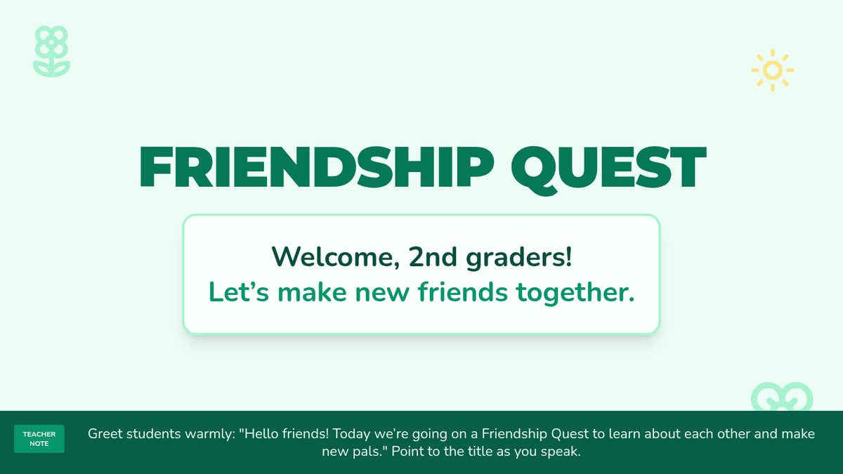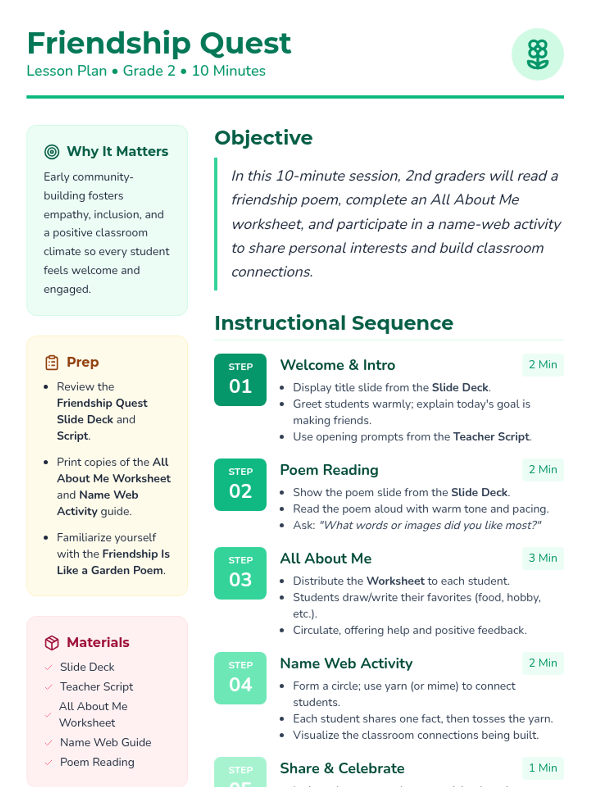A 10-minute 2nd-grade icebreaker focused on building community through a garden-themed 'Friendship Quest'. Students explore connections via a poem, a personal worksheet, and a collaborative yarn-web activity.