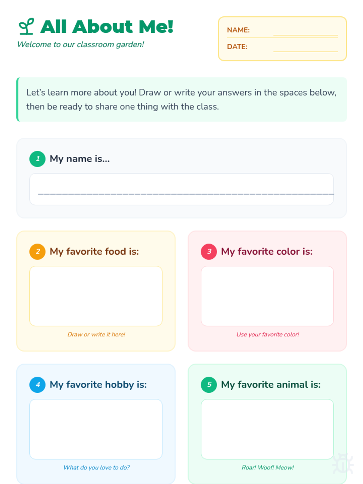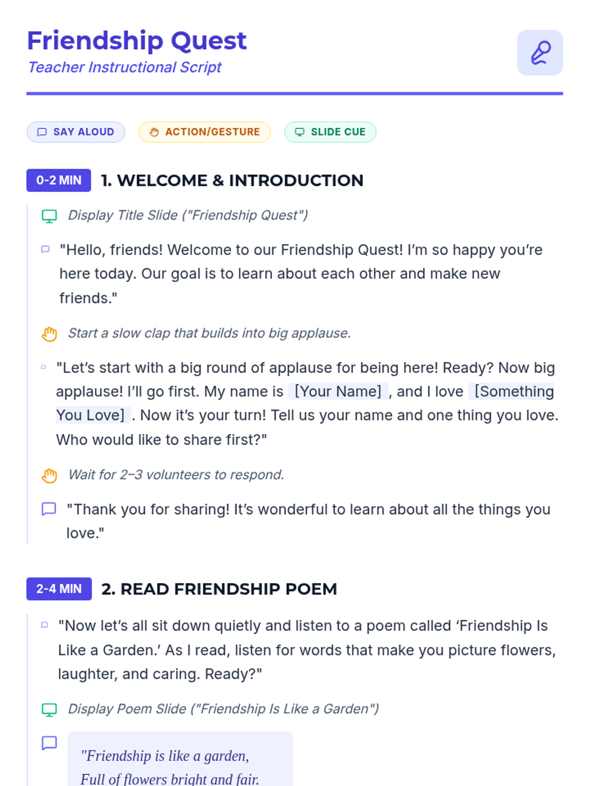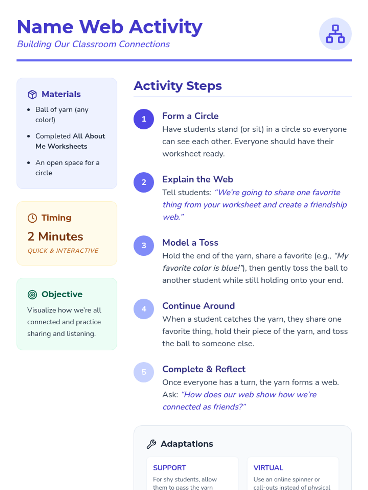 A 10-minute 2nd-grade icebreaker focused on building community through a garden-themed 'Friendship Quest'. Students explore connections via a poem, a personal worksheet, and a collaborative yarn-web activity.