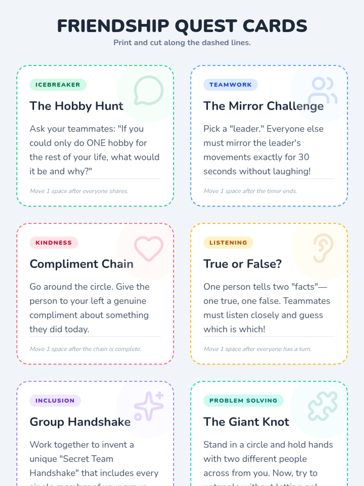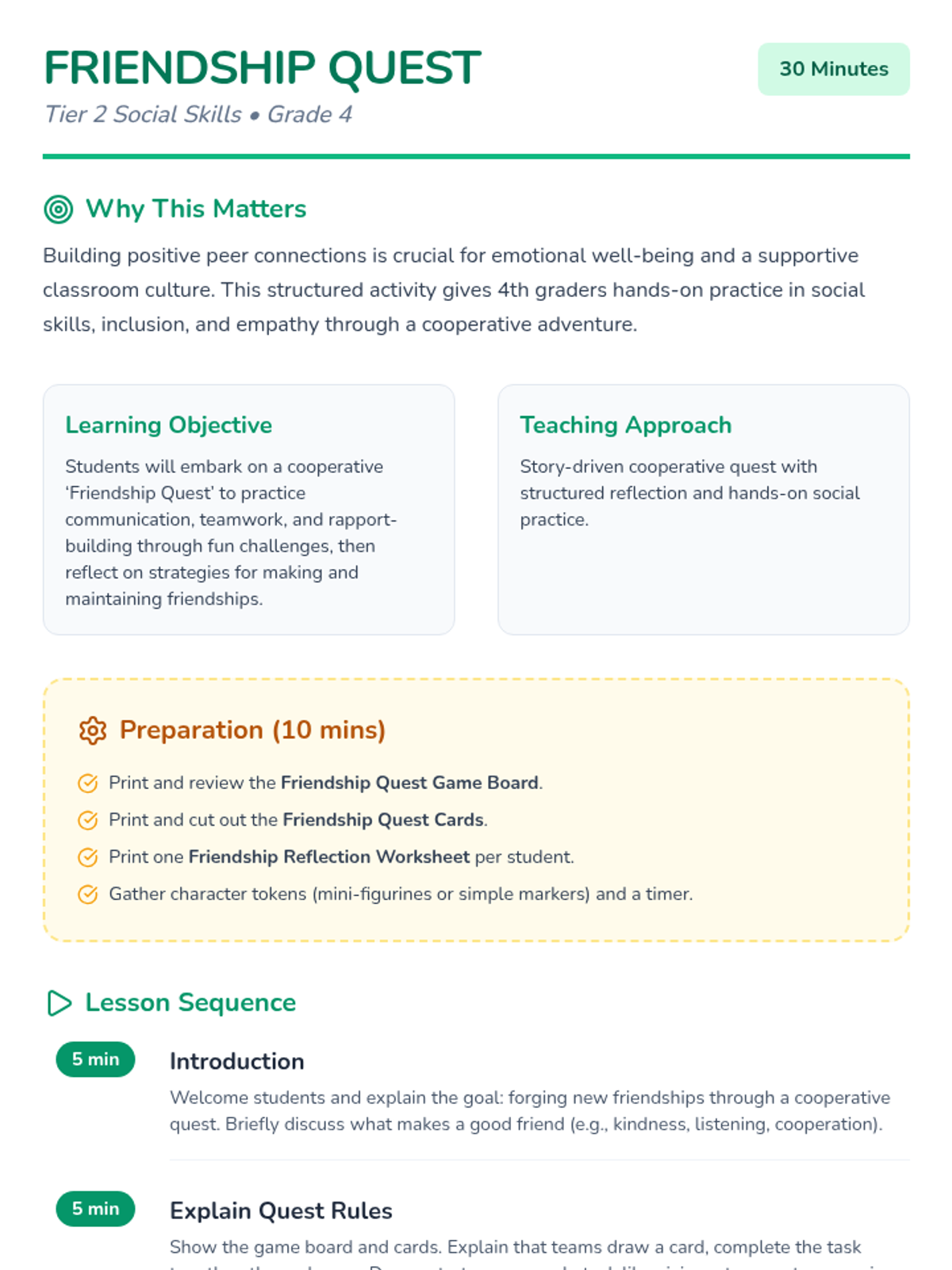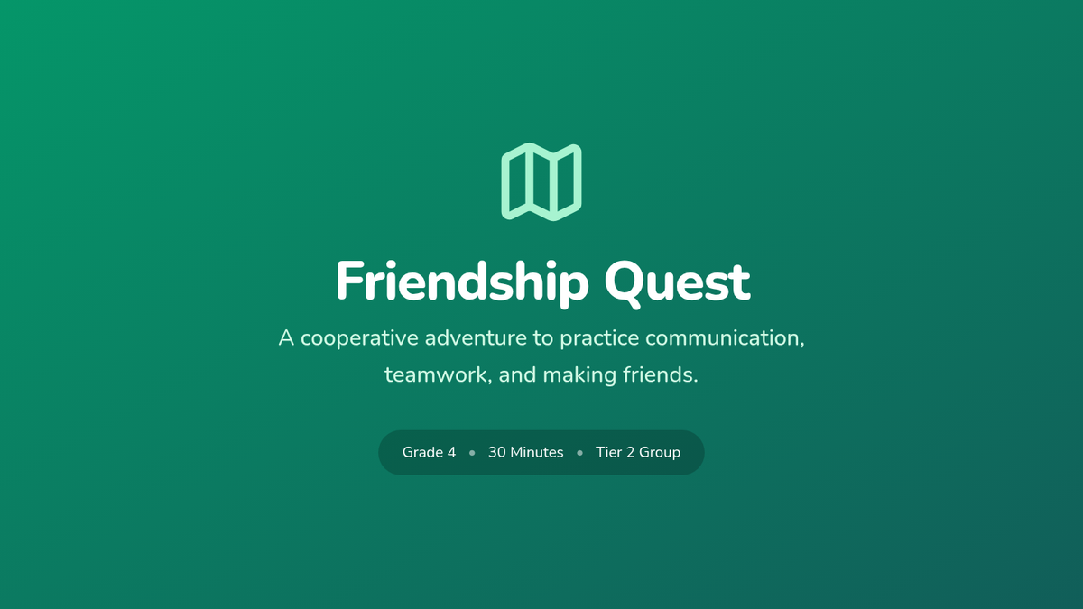 A 30-minute Tier 2 social skills lesson for 4th graders focused on building rapport, communication, and teamwork through a cooperative 'Friendship Quest' game.