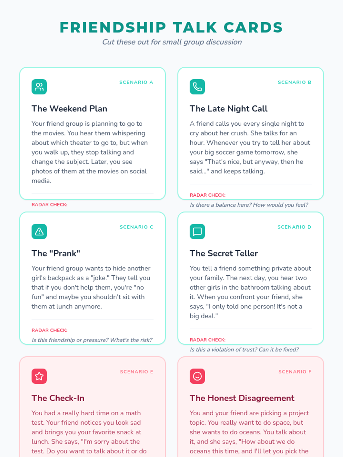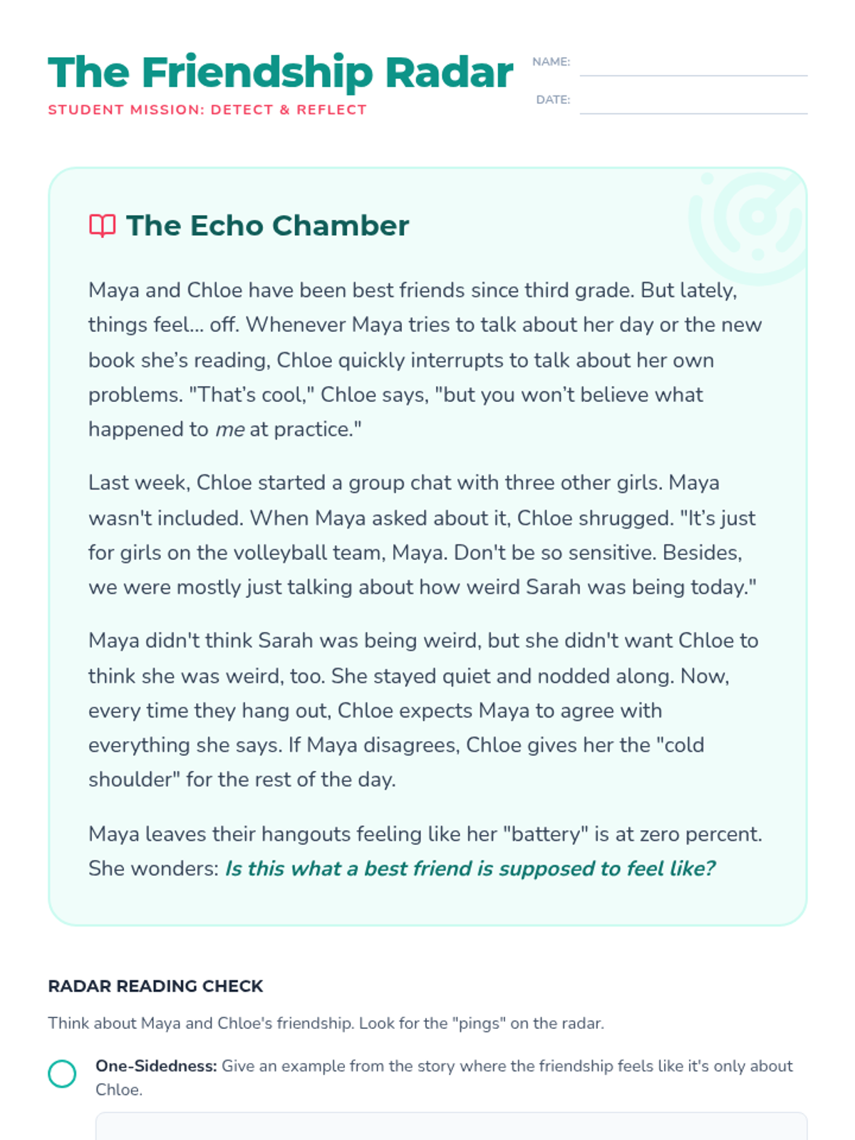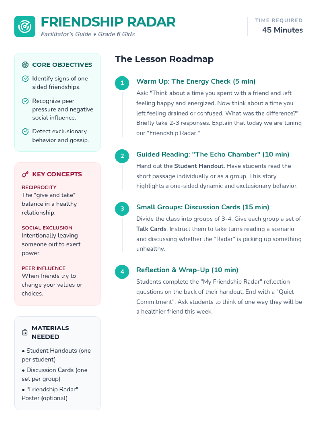 A lesson designed for 6th-grade girls to identify and navigate unhealthy friendship dynamics, including one-sidedness, peer pressure, and exclusion. It is structured for easy facilitation by general education teachers.