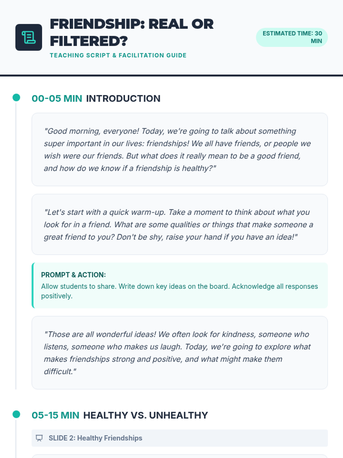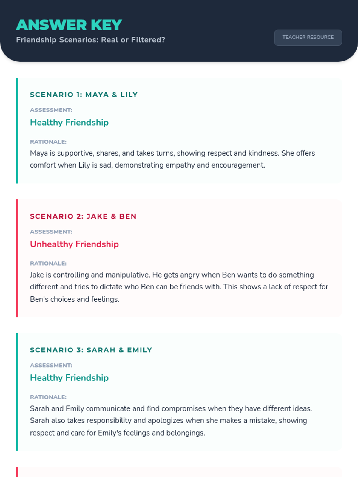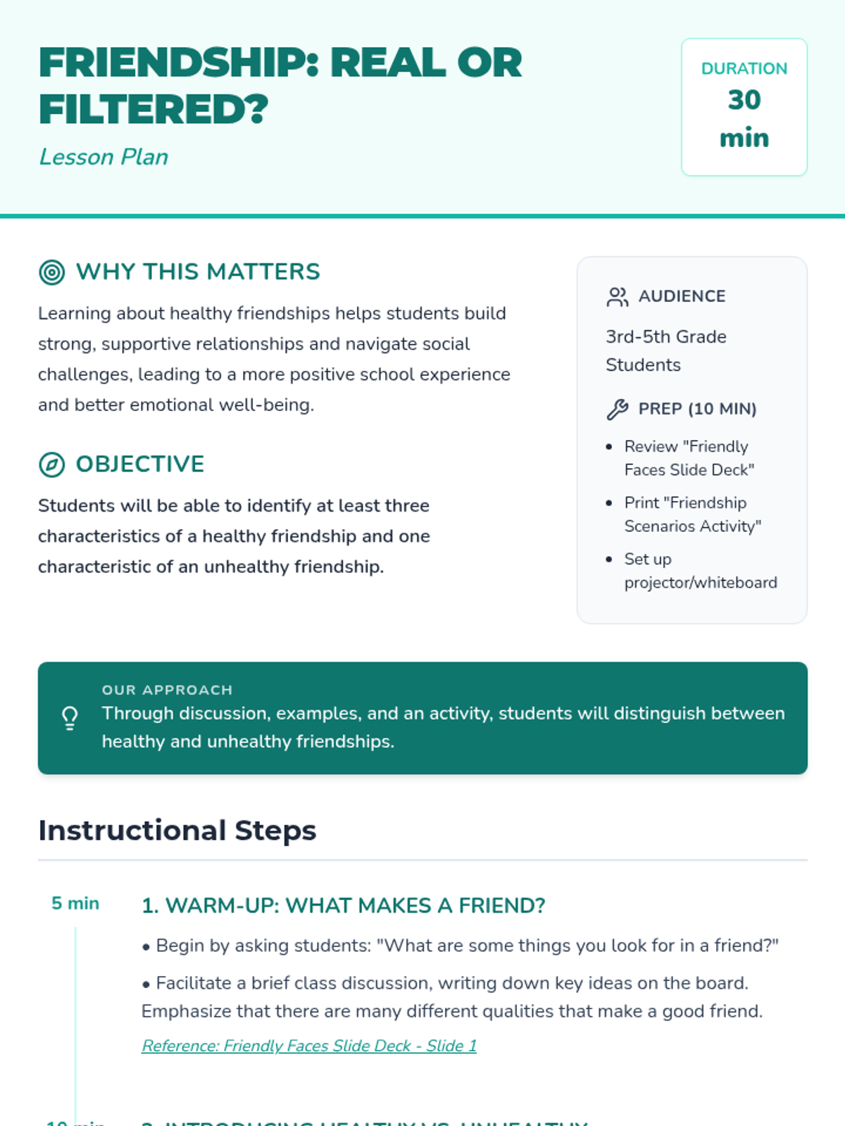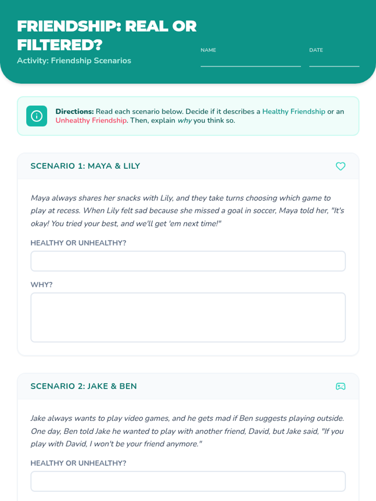 This lesson helps 3rd-5th grade students identify characteristics of healthy and unhealthy friendships through discussion and scenario analysis. Students will learn to distinguish between supportive behaviors and controlling or disrespectful ones.